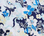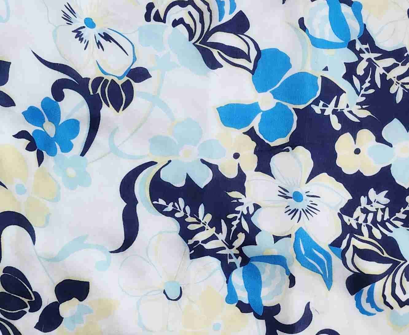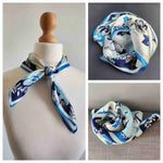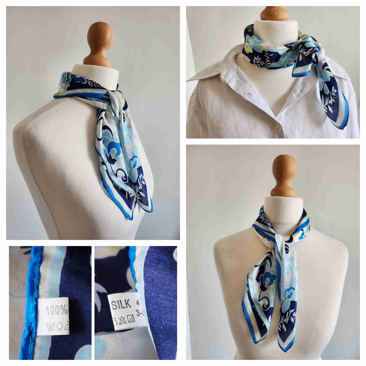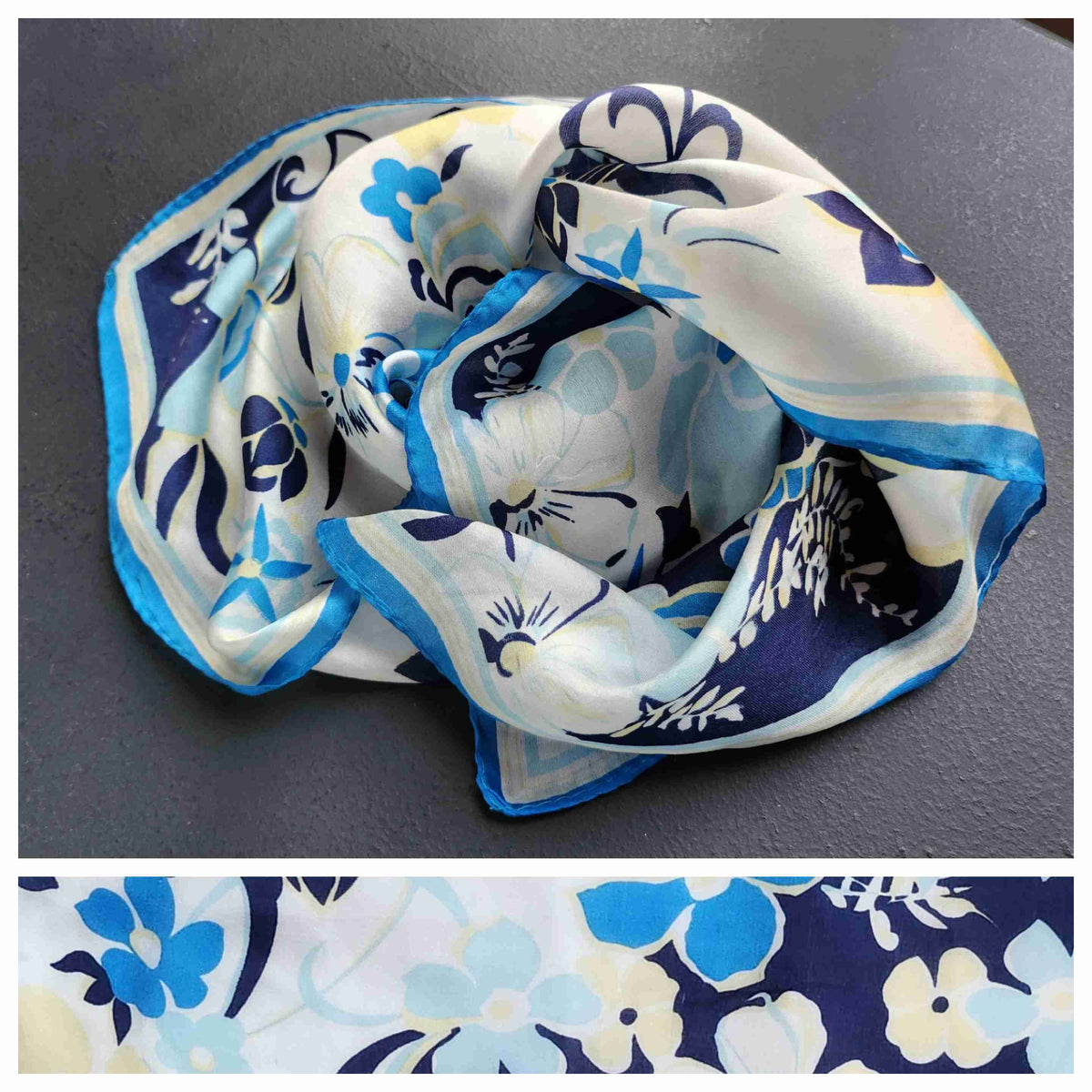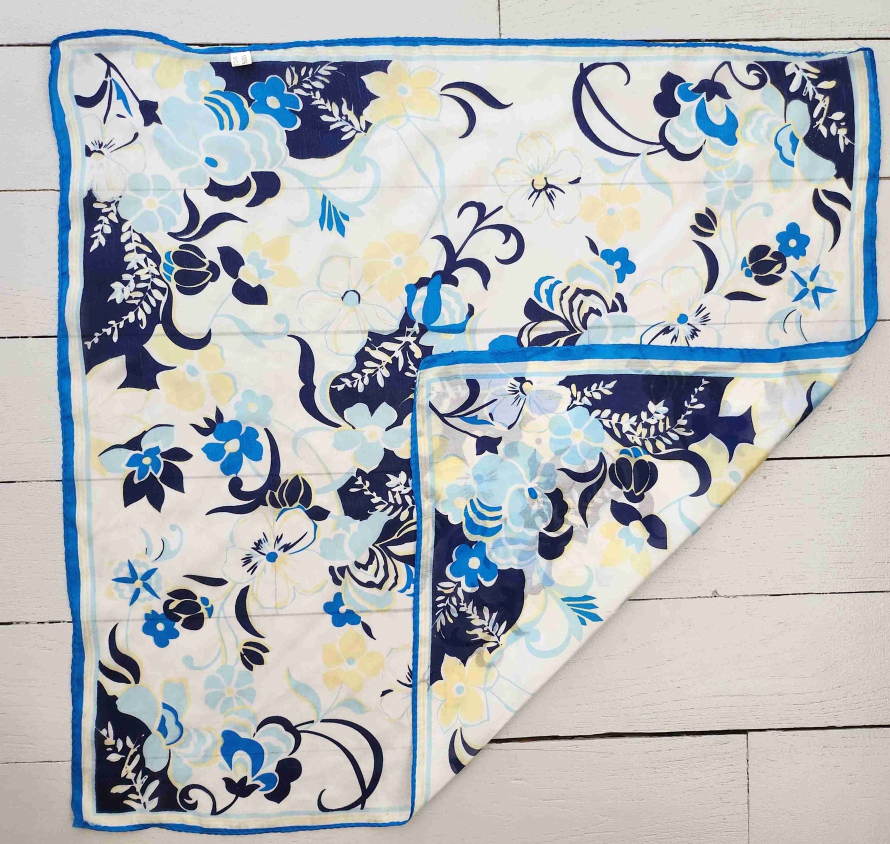Prix unitaire parPetit carré de soie imprimé floral bleu, blanc et jaune pale.