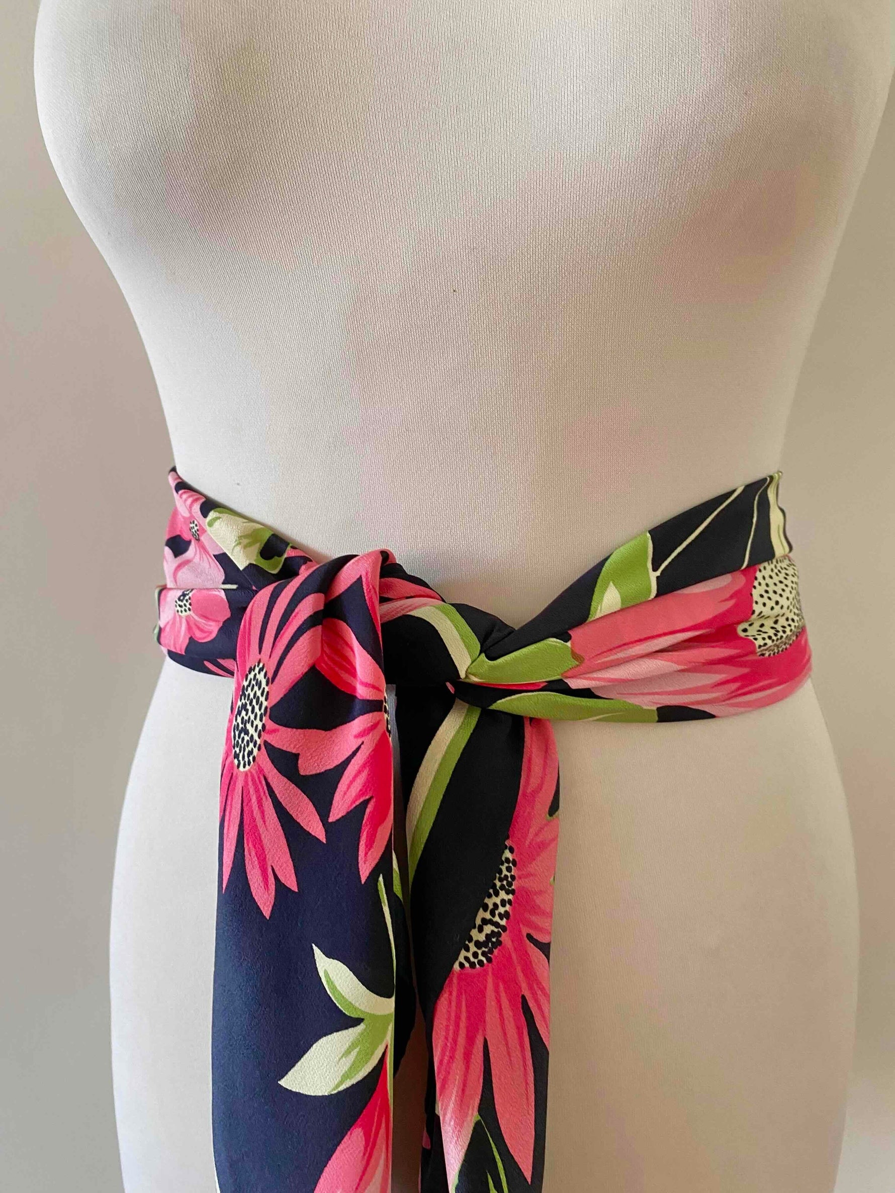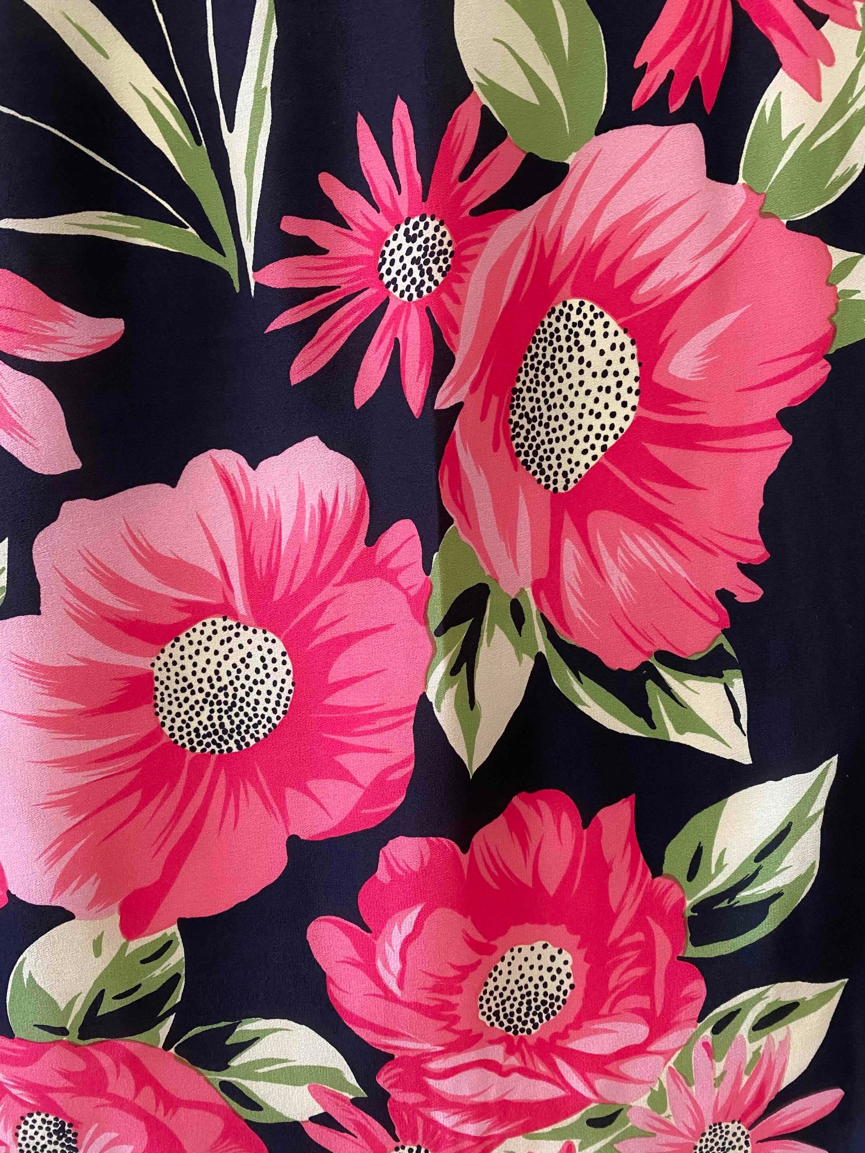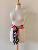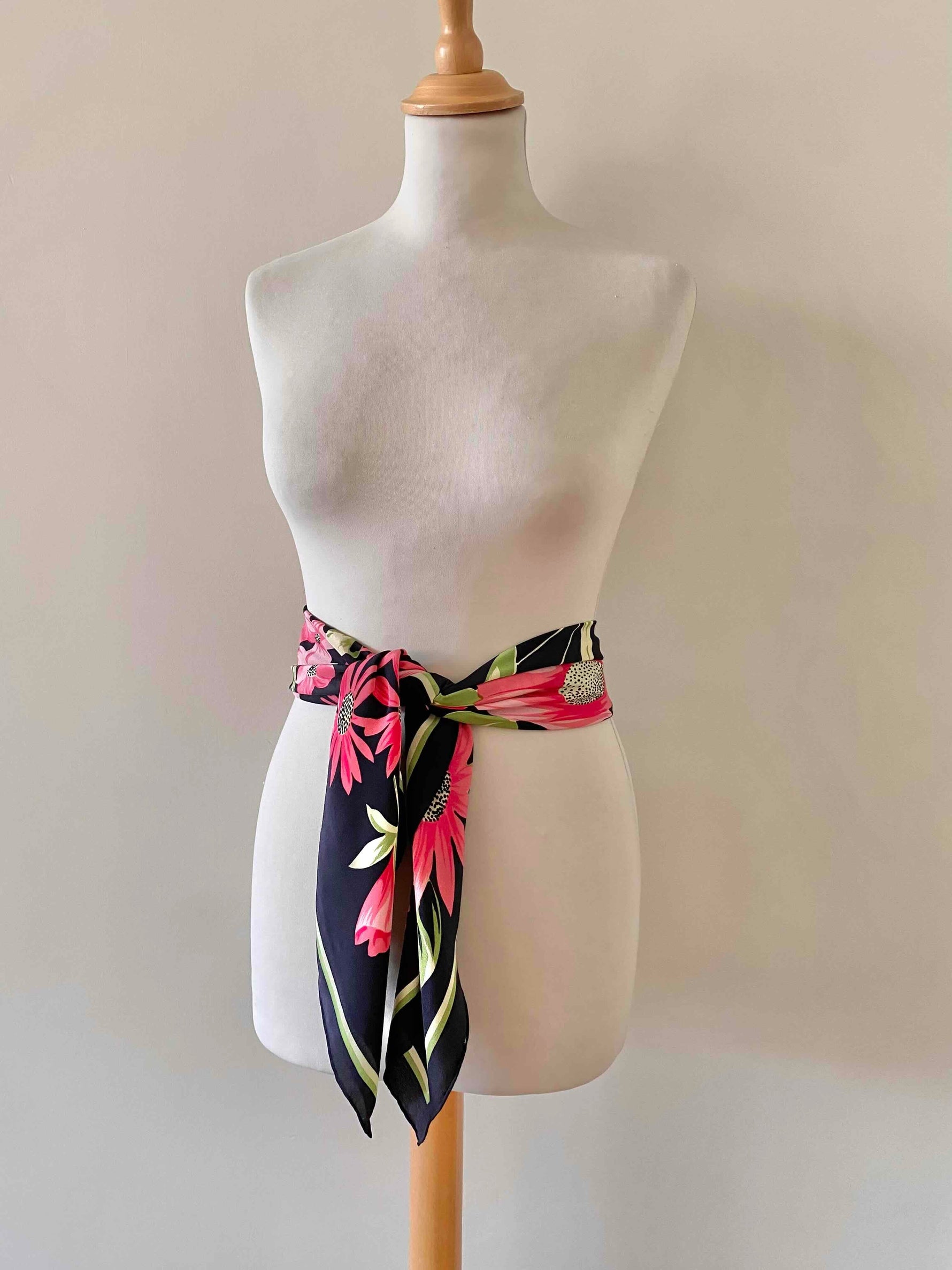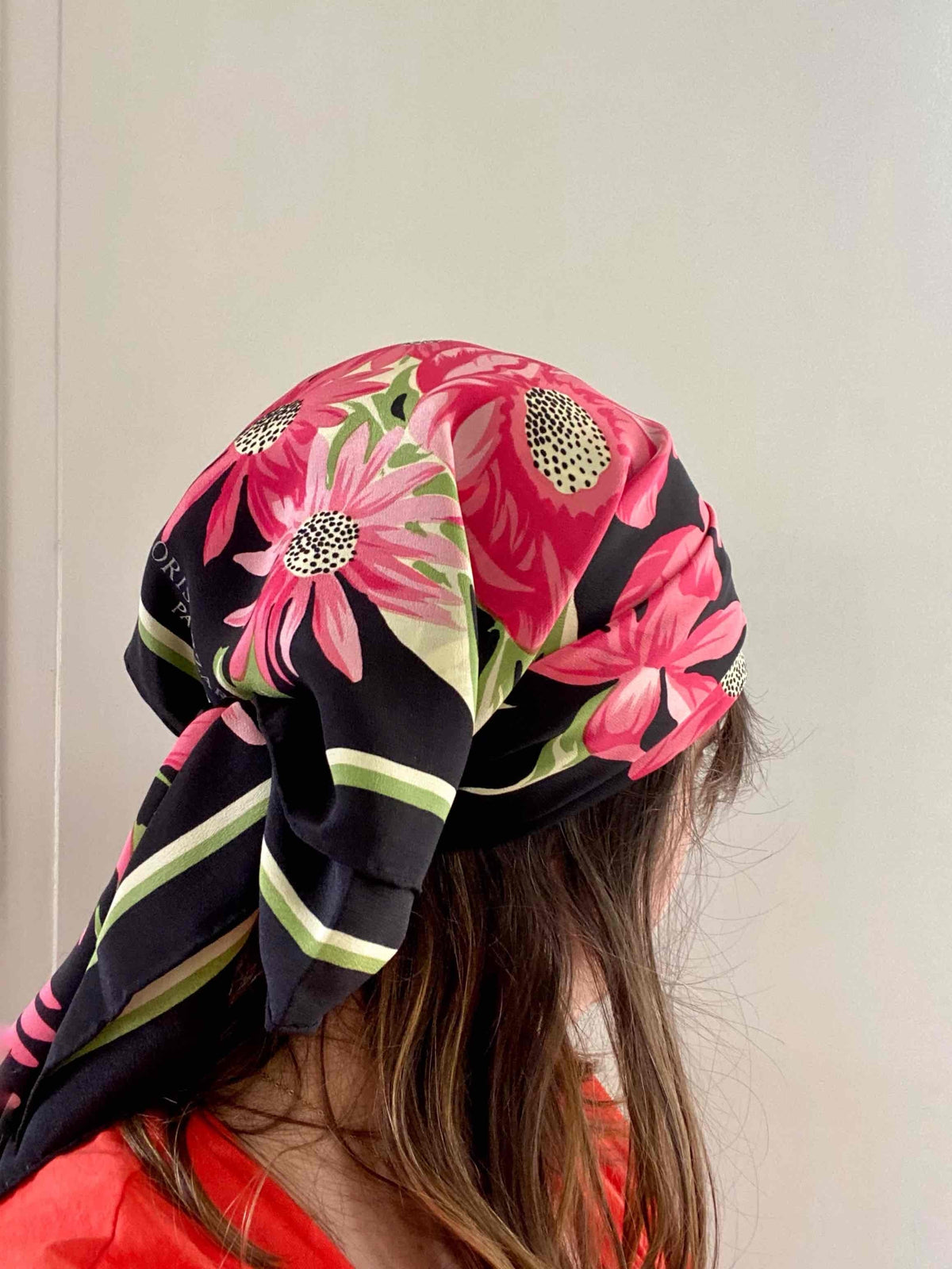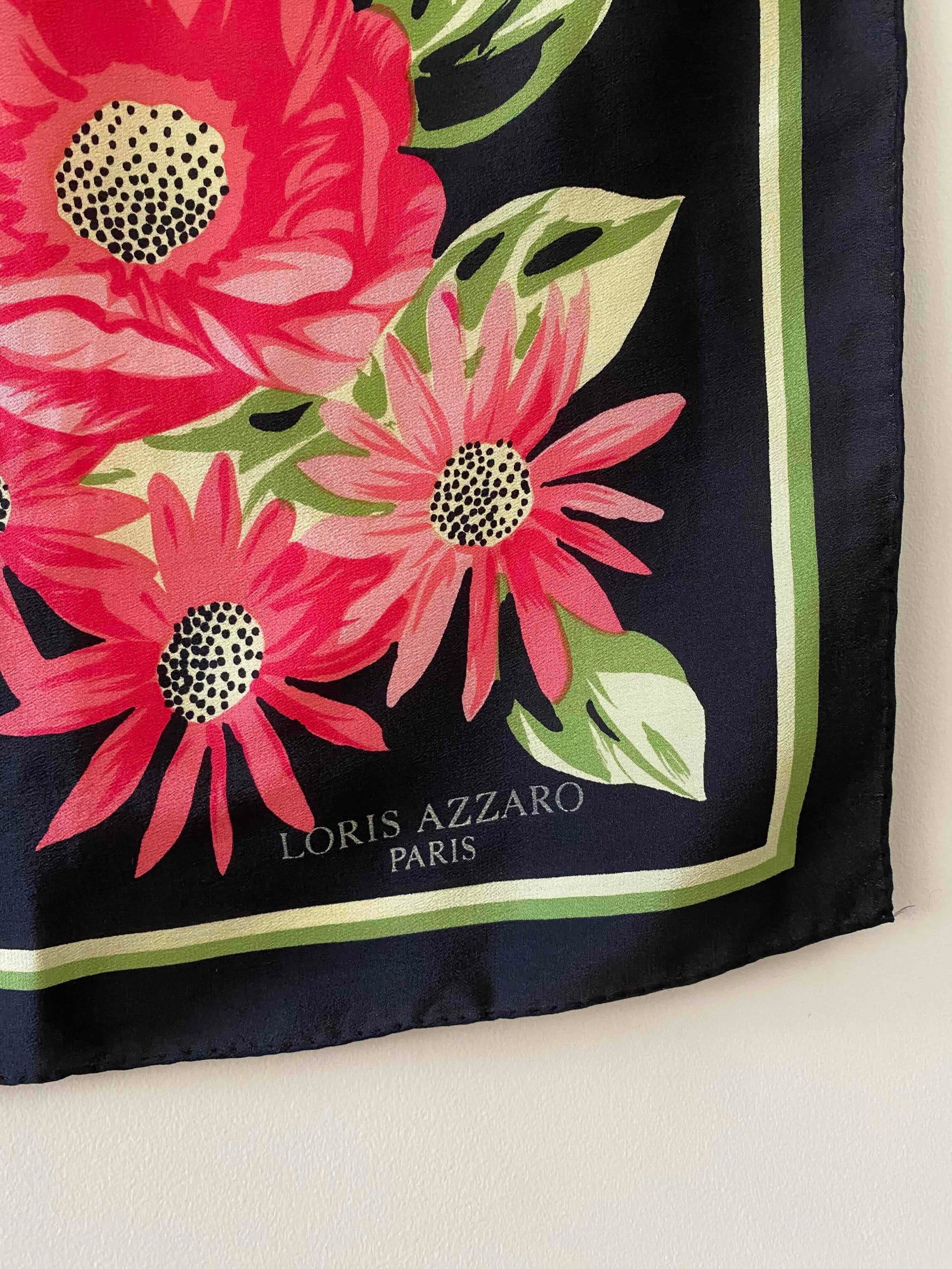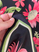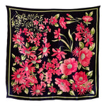 Prix unitaire parFoulard en soie Azzaro, 100% soie grand format imprimé de fleurs roses fuchsias et vertes, fond noir, bords roulotés mains, fabriqué en Italie, 86cm x 85cm.