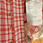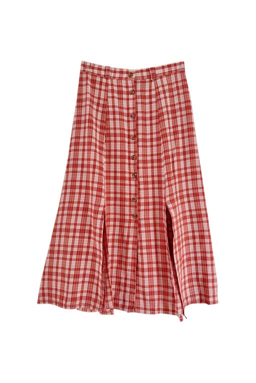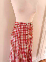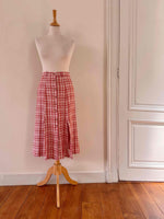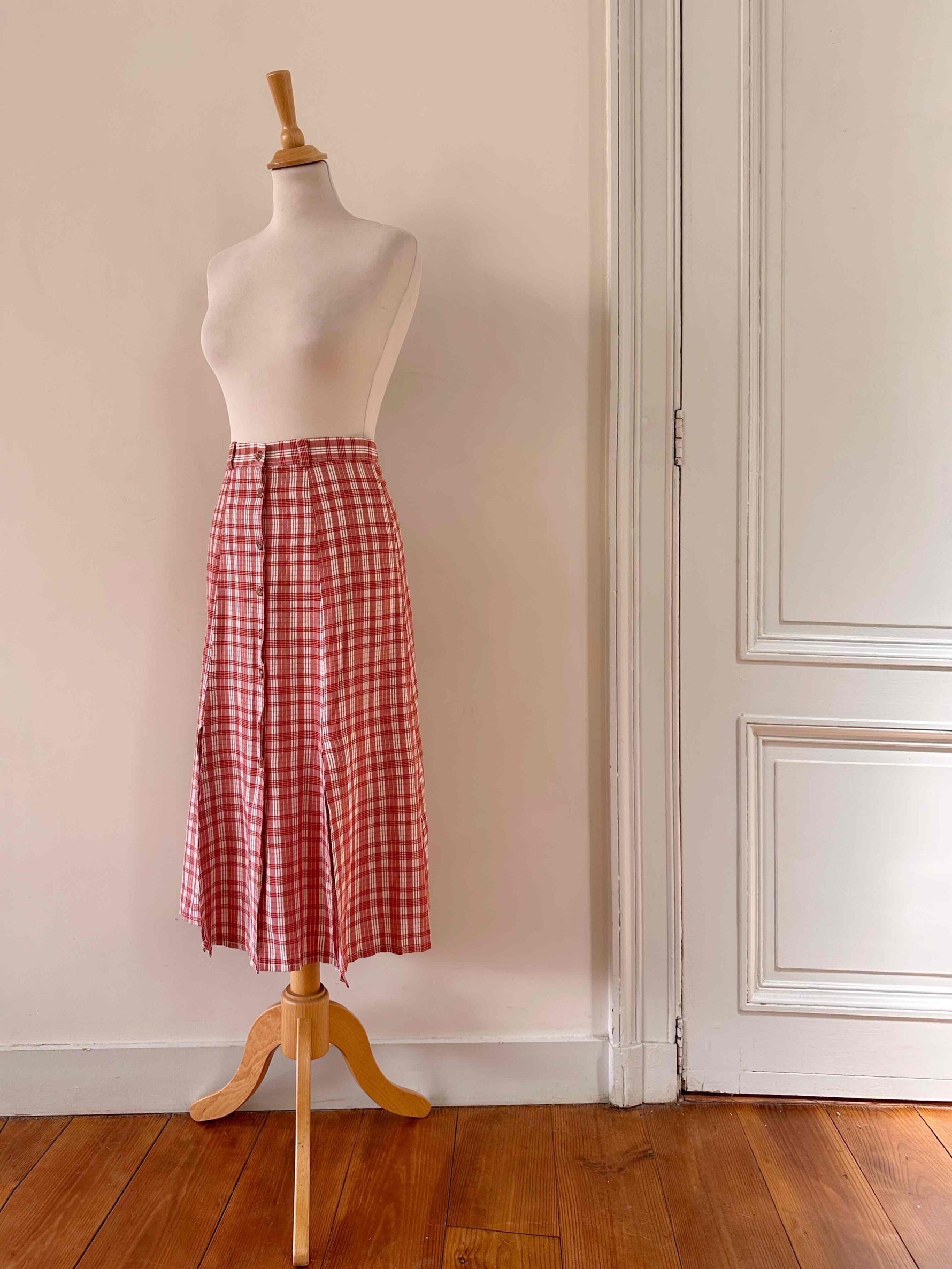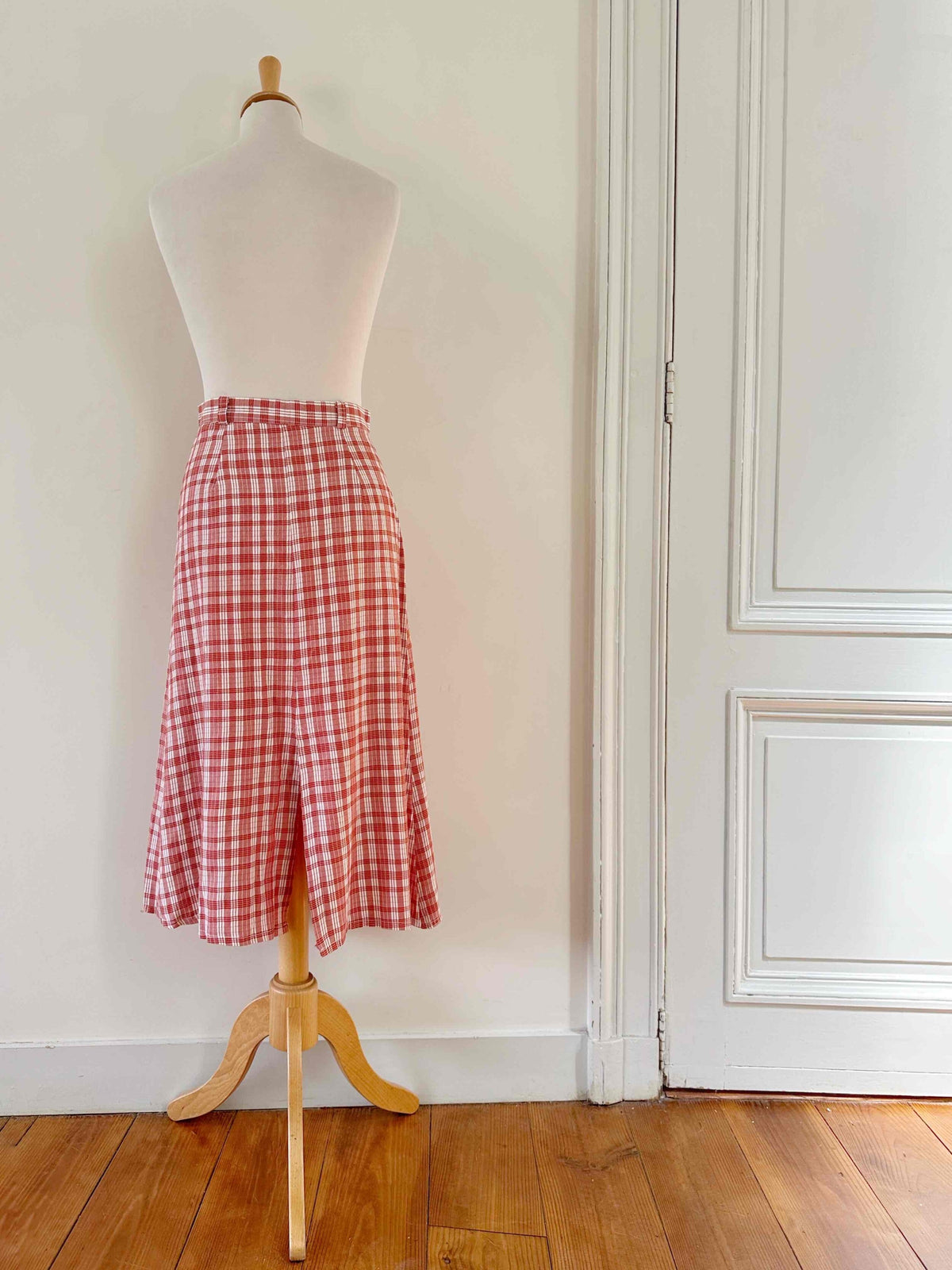 Prix unitaire parJupe midi vichy, en viscose mélangée, carreaux vichy rouge terra cotta et écrus, boutonnée, fentes cotés et dos, fabriquée en France, taille 36, portée ici sur un mannequin T36.