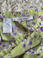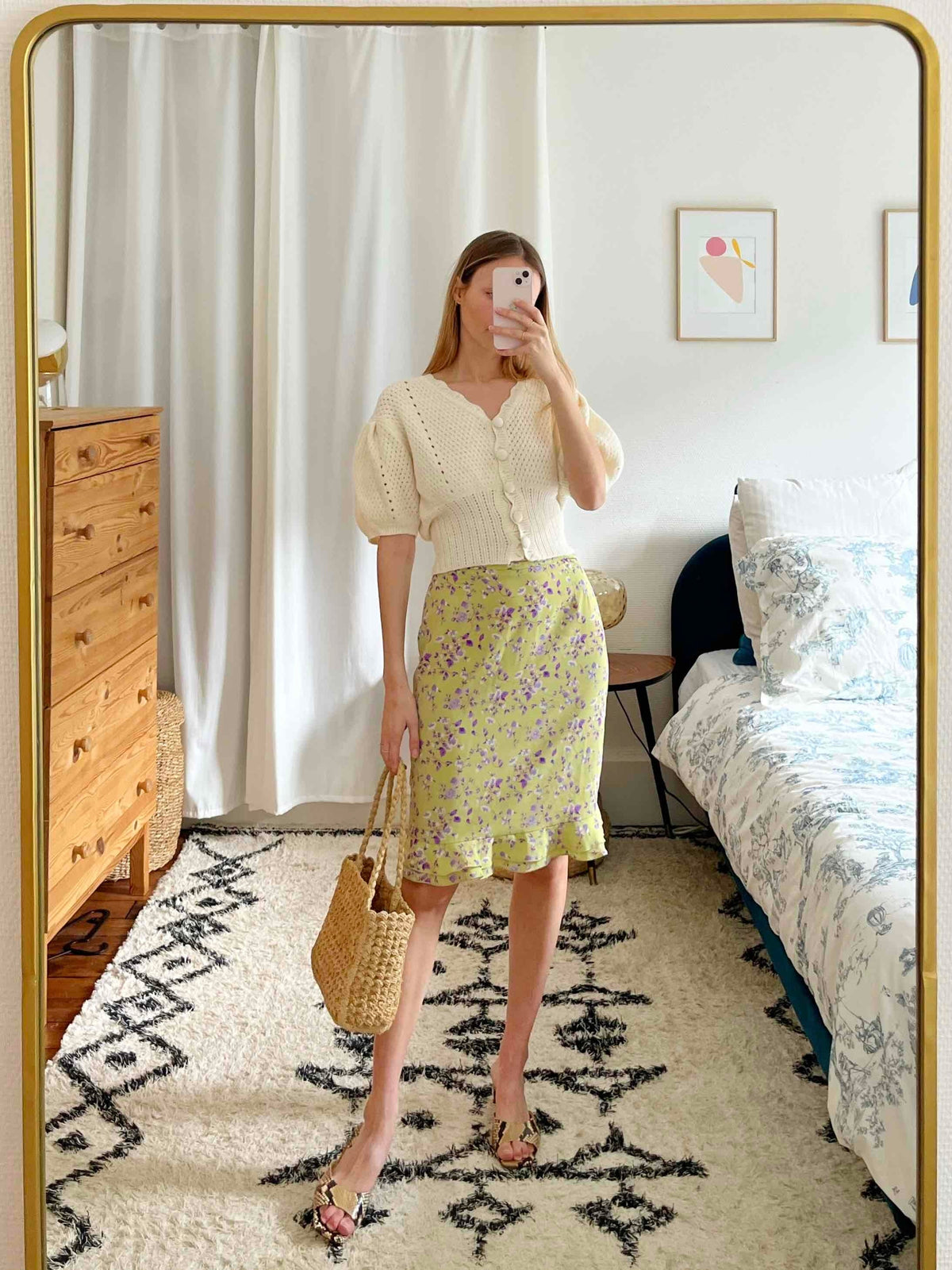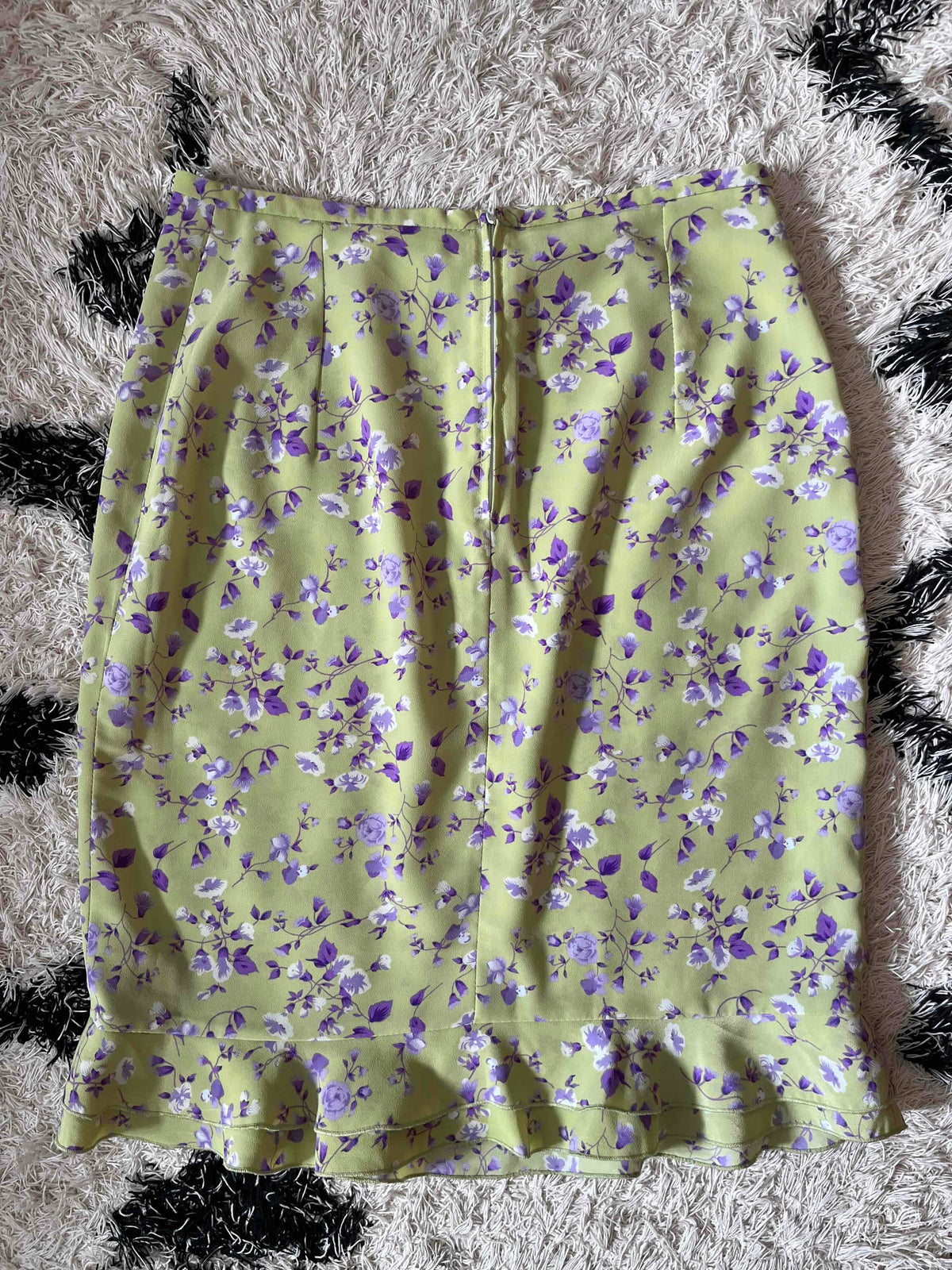 Prix unitaire parJupe taille haute, verte à fleurs violettes, volants en bas de la jupe. Portée ici sur une taille 36 pour 1m64.