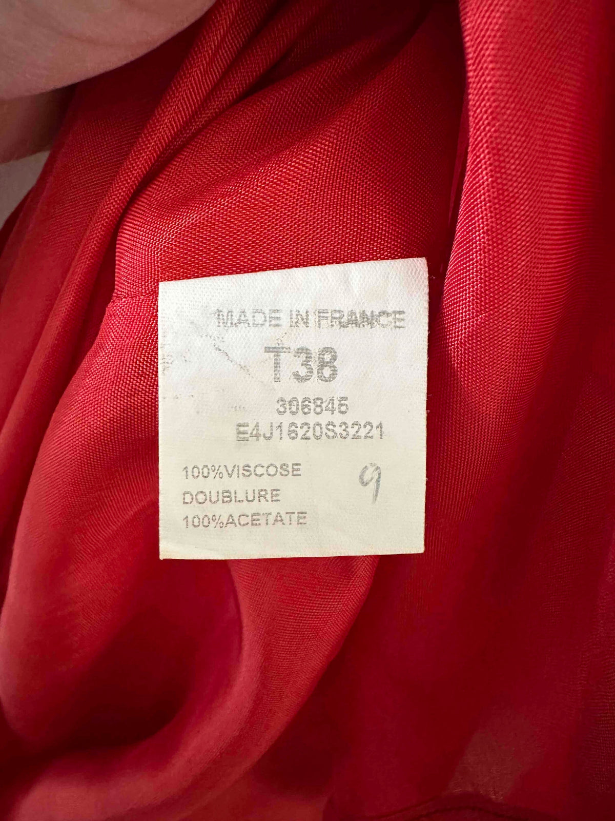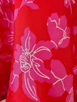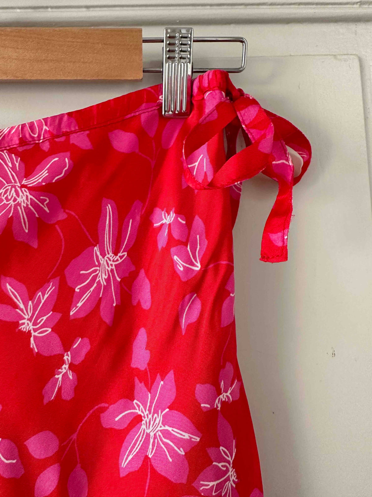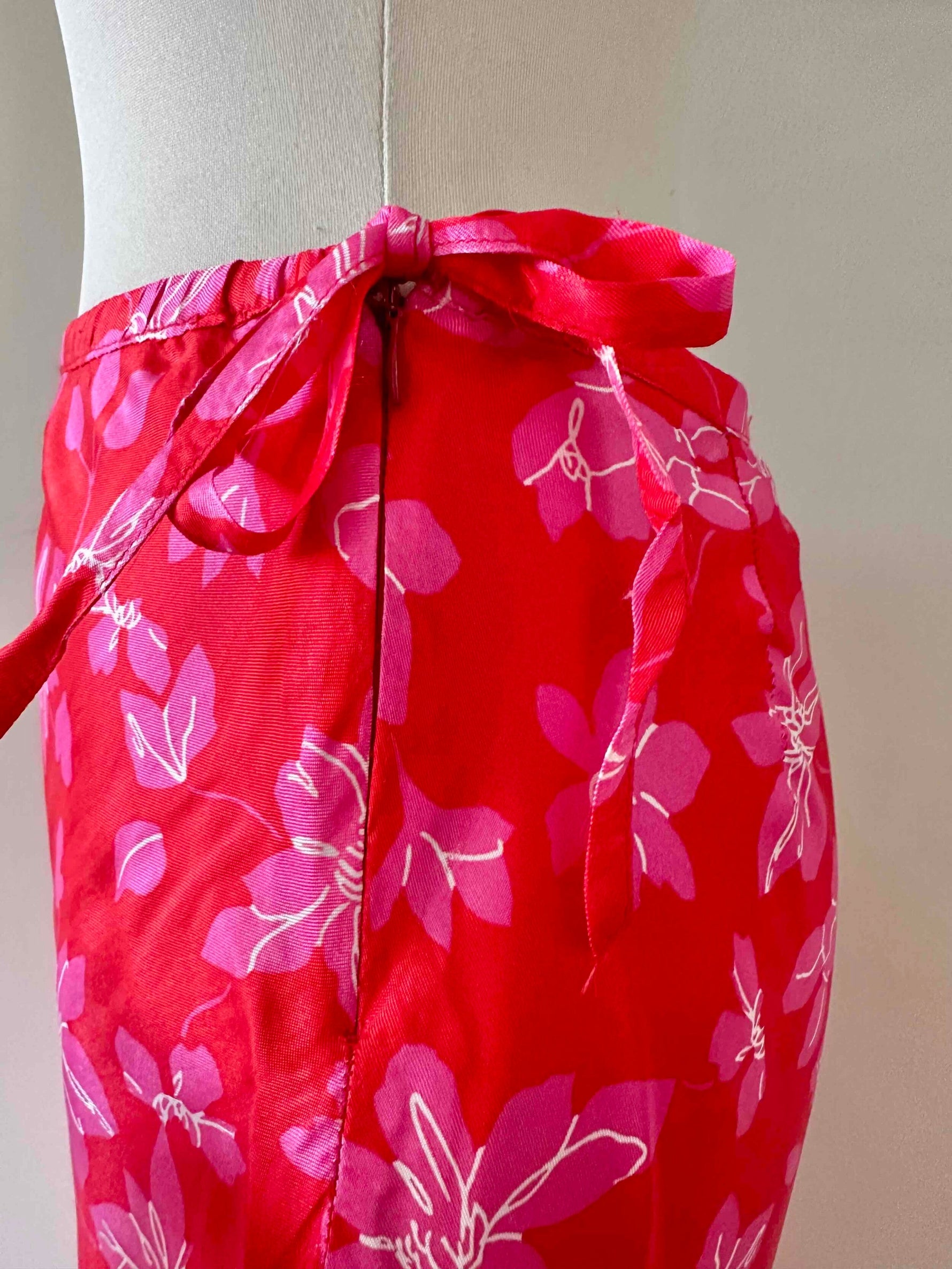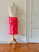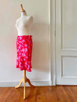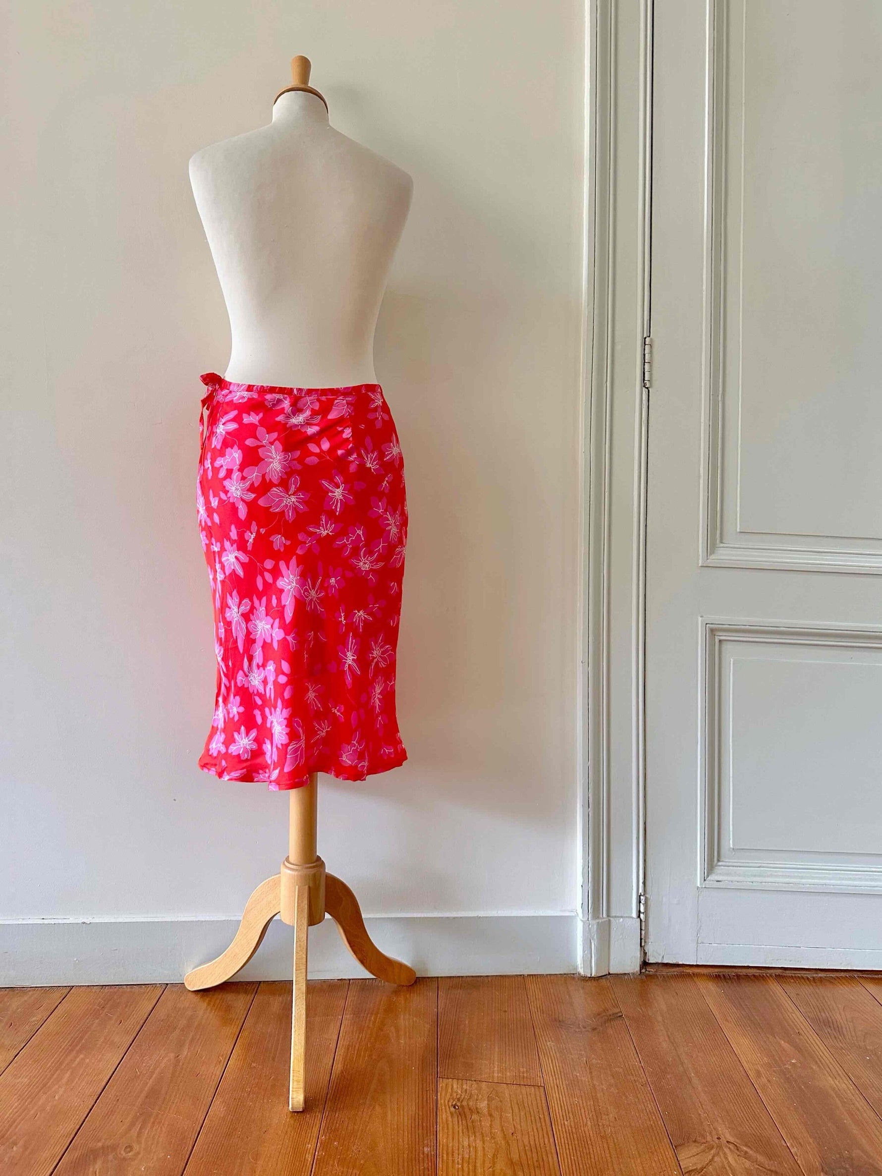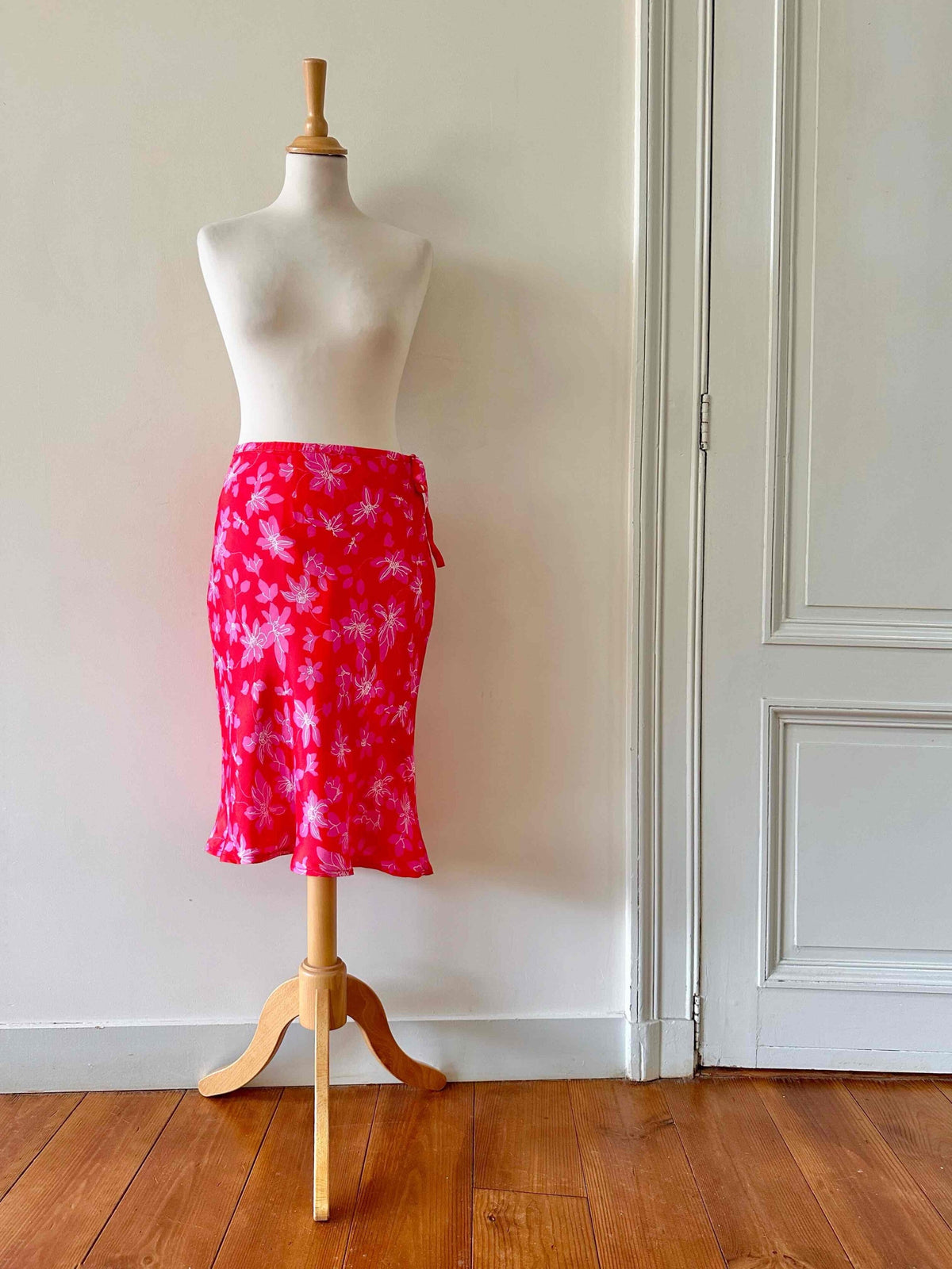 Jupe satinée à fleurs, en satin viscose twill rouge vermillon, imprimée fleurs rose fuchsia, fermeture Éclair invisible côté et lien à nouer, longueur midi et forme fit and flare en biais, fabriquée en France, taille 36 actuelle, portée ici sur un mannequin T36, hanches 44 cm.
