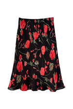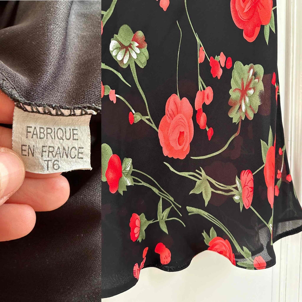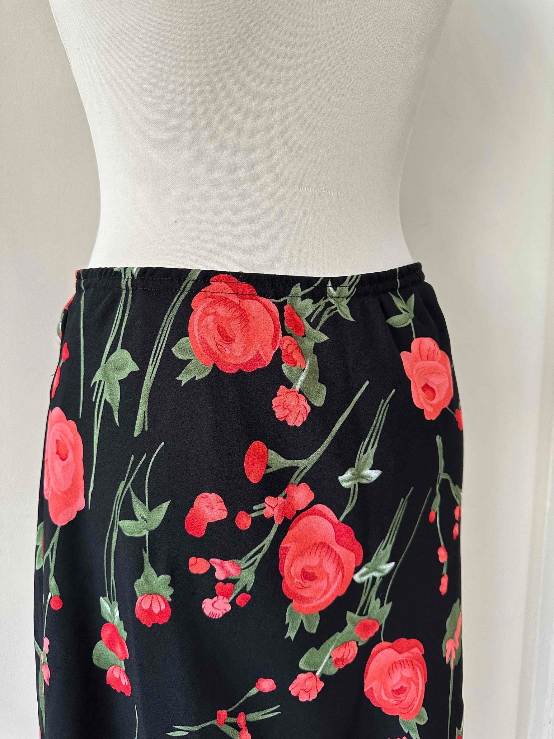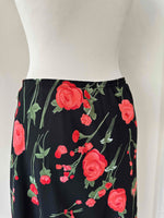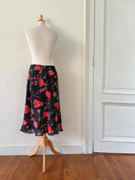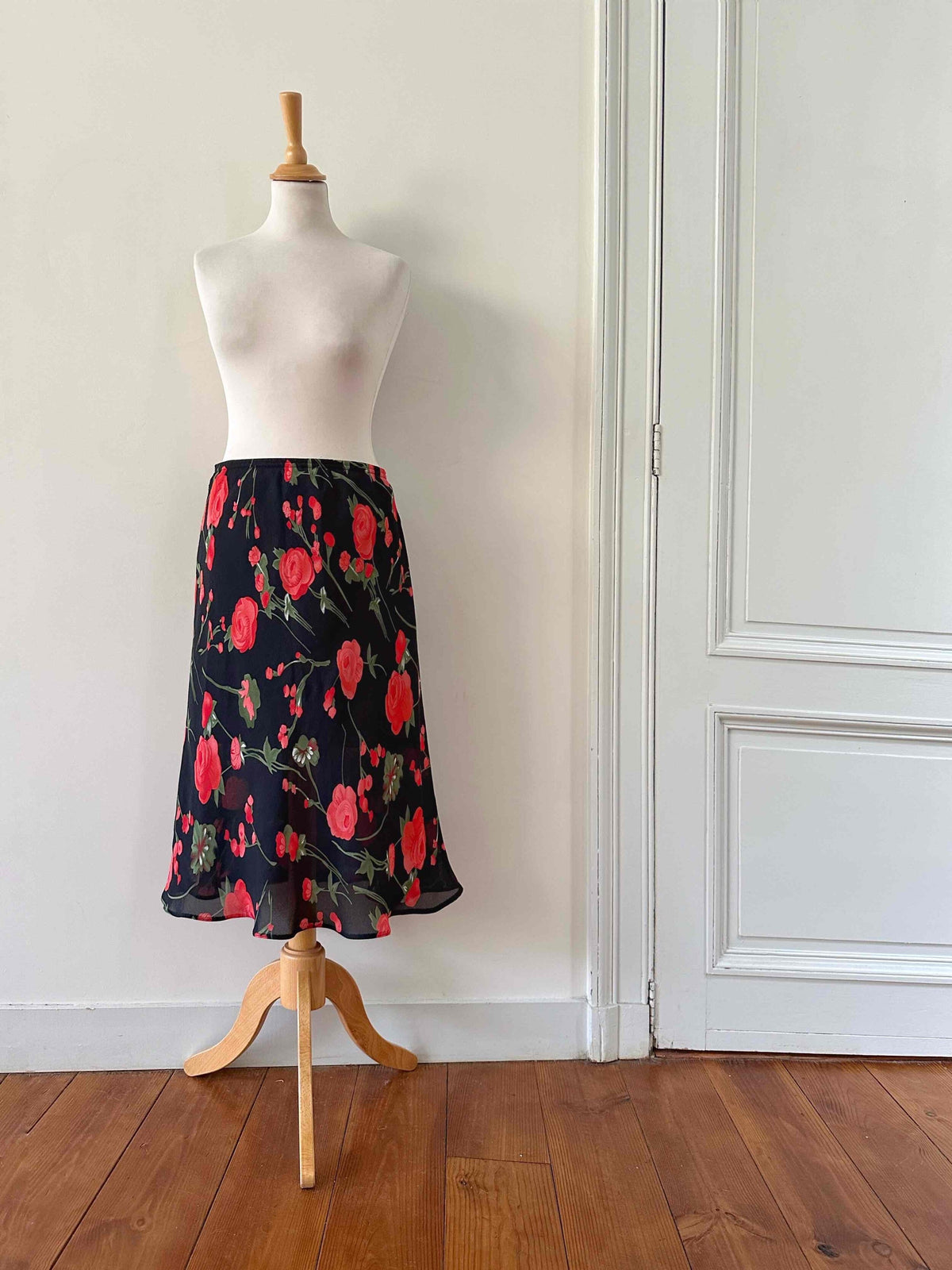 Jupe midi à fleurs, en voile viscose doublé noir imprimé fleurs rouge et vertes, taille élastique, légèrement évasée, fabriquée en France, s’adapte au 36 et au 38, portée ici sur un mannequin T36.