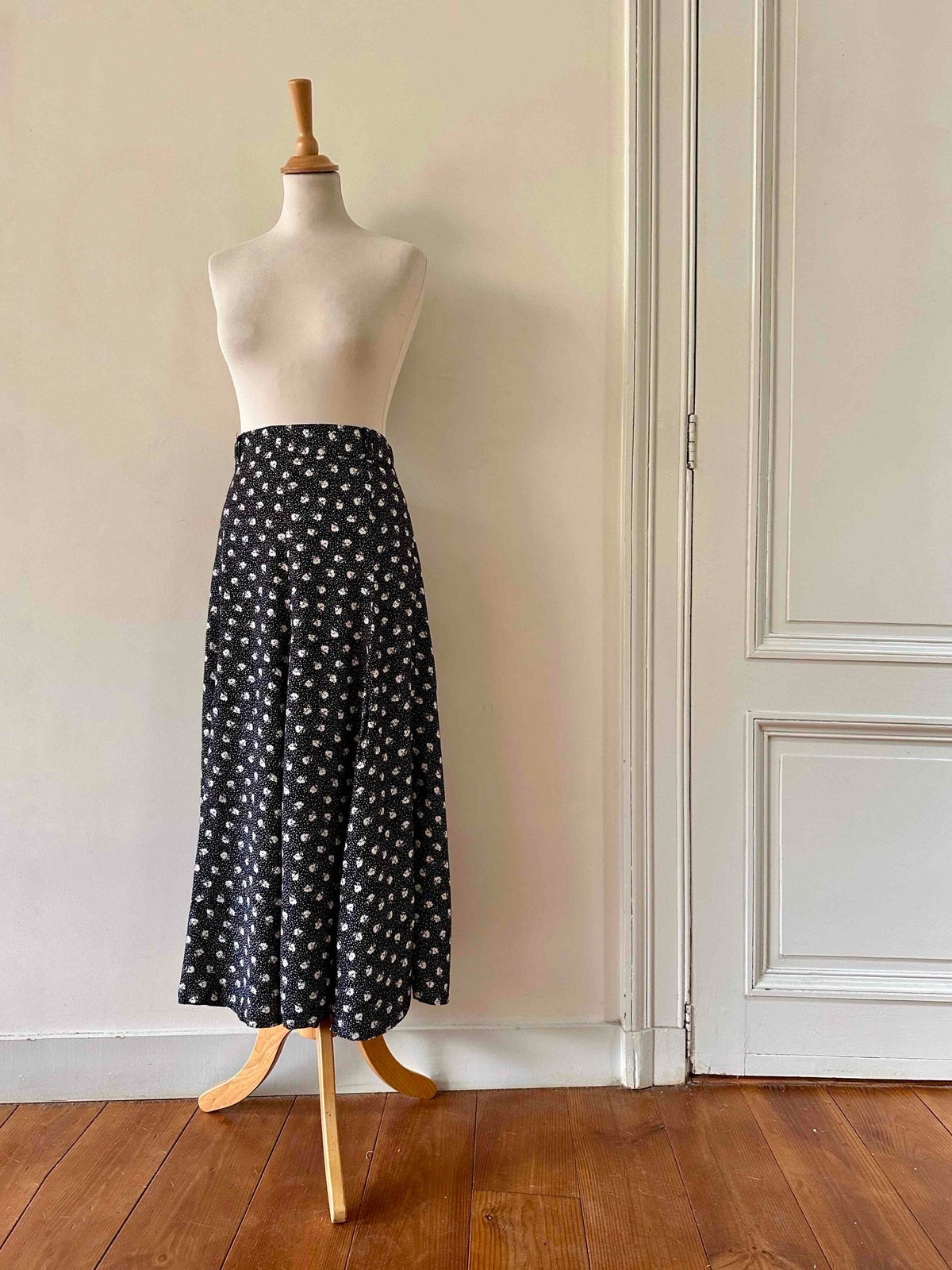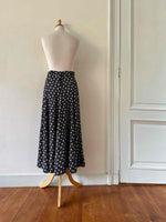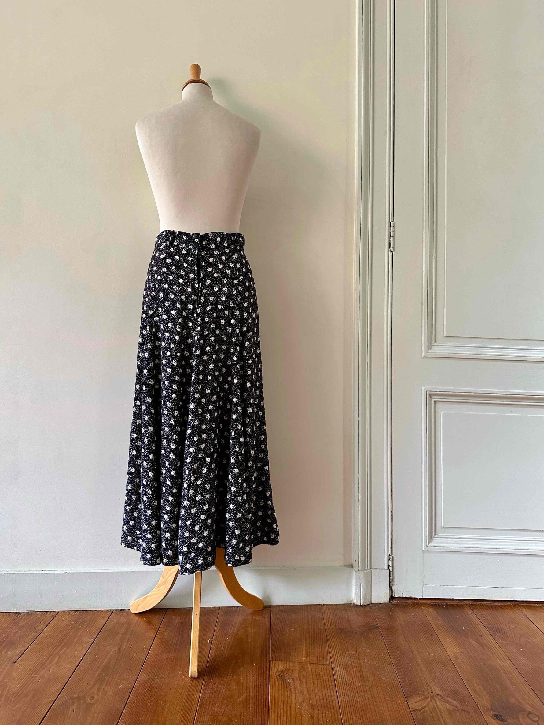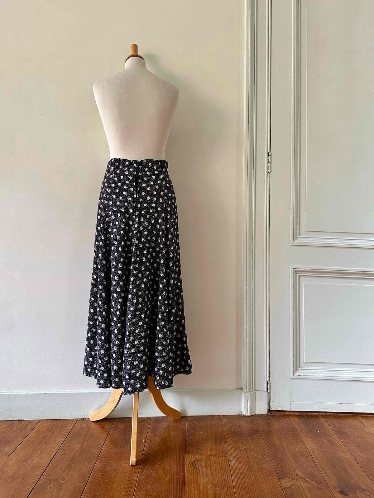 Jupe longue à fleurs, en viscose noire imprimée petites fleurs et pois plumetis blancs, boutons et fermeture Éclair dos, fluide et légèrement évasée, fabriquée en France, taille 36, portée ici sur un mannequin T36.