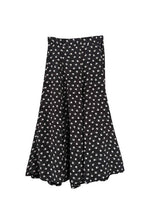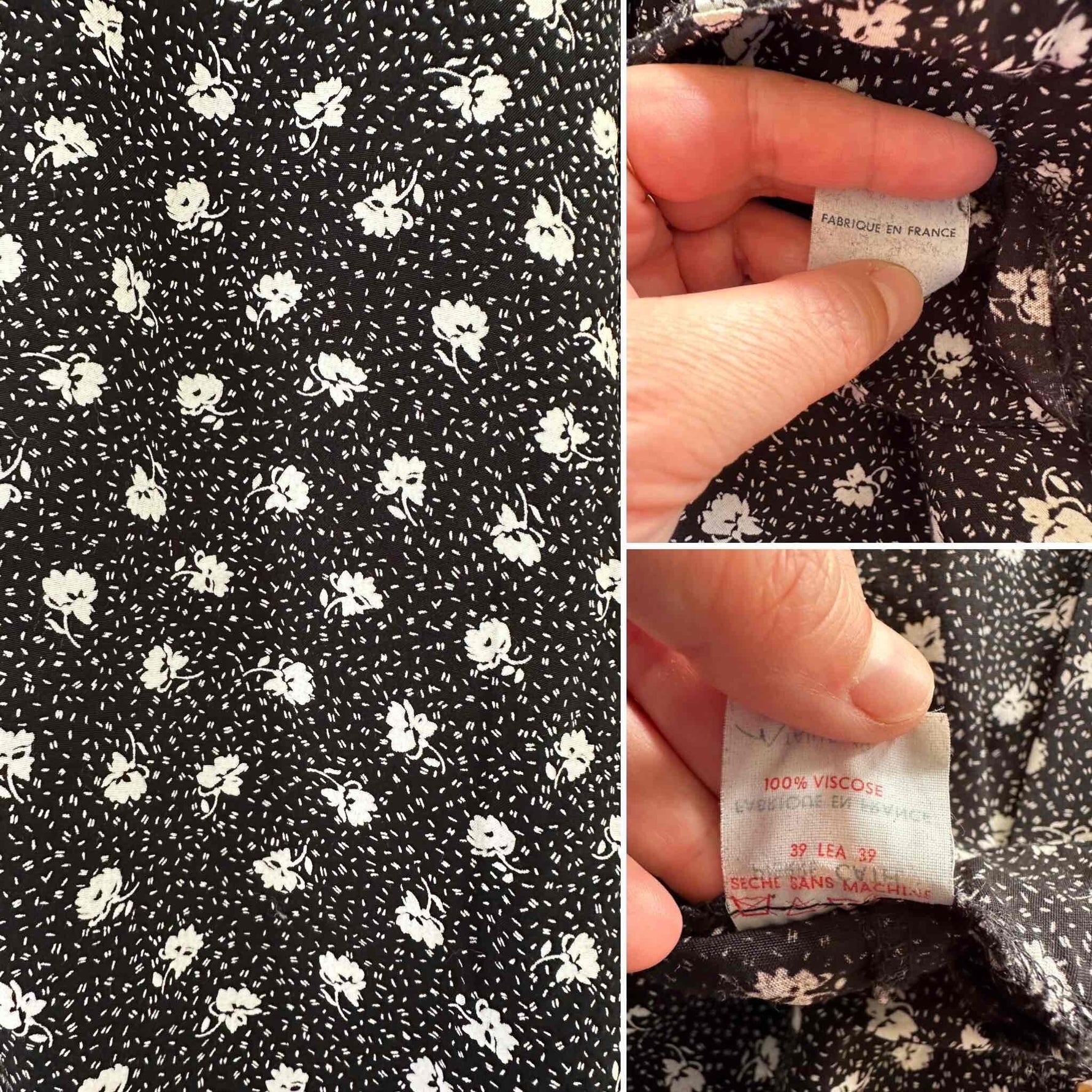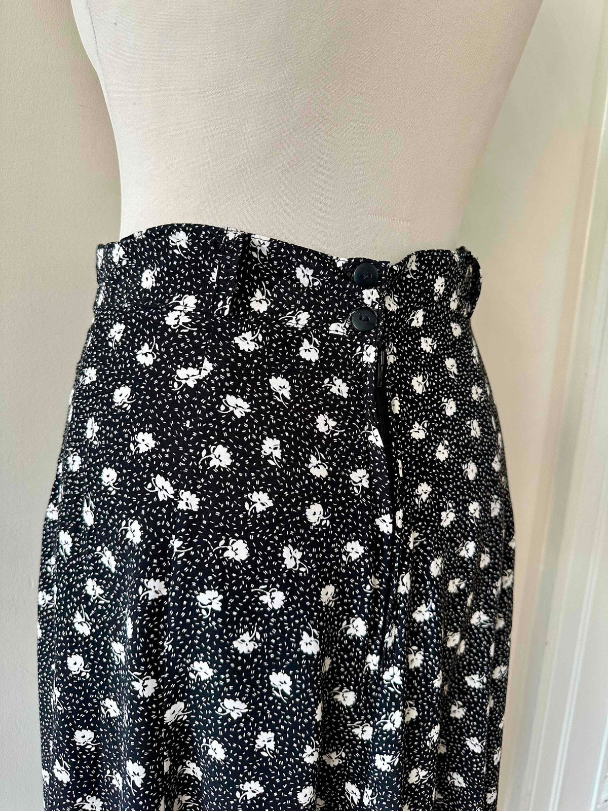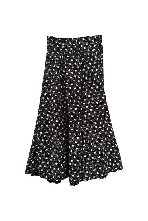 Jupe longue à fleurs, en viscose noire imprimée petites fleurs et pois plumetis blancs, boutons et fermeture Éclair dos, fluide et légèrement évasée, fabriquée en France, taille 36, portée ici sur un mannequin T36.