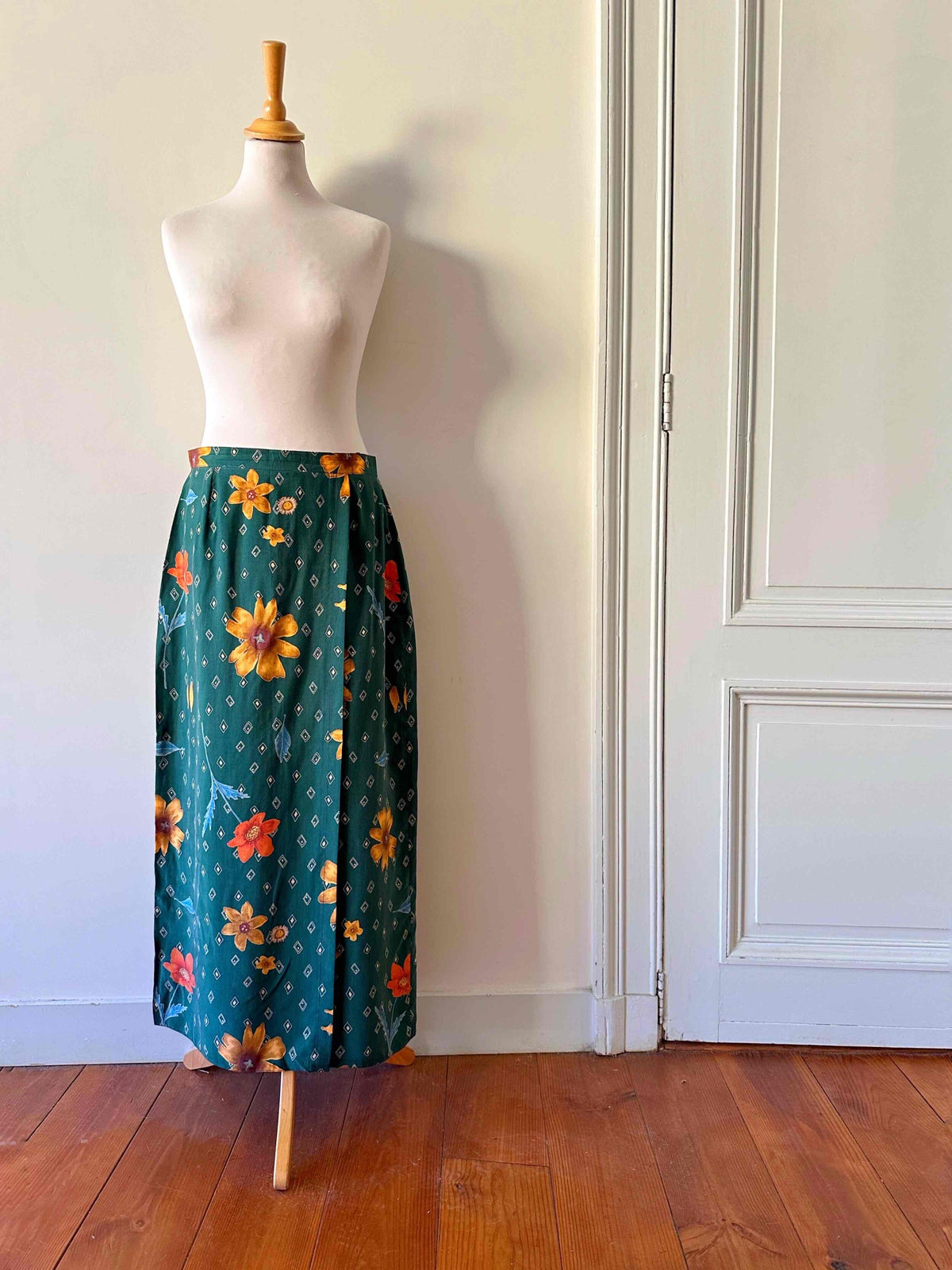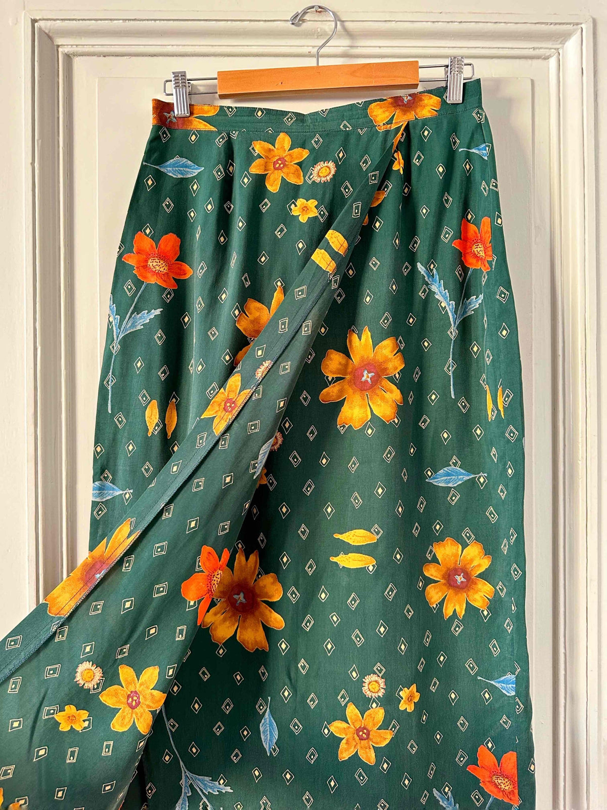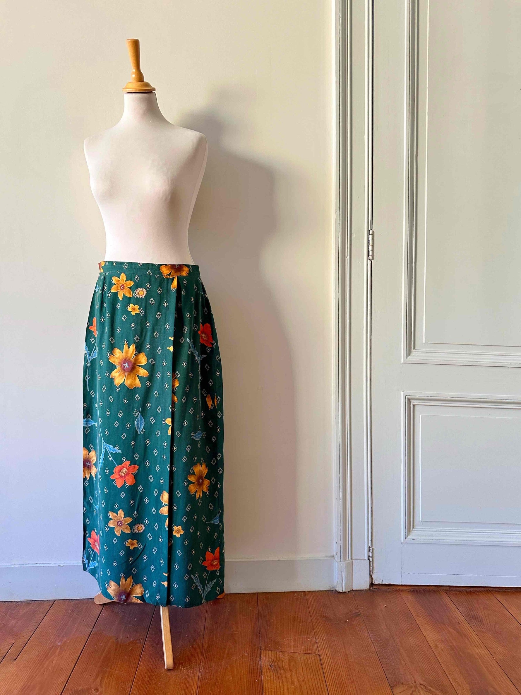 Prix unitaire parJupe longue portefeuille, en cupro soyeux vert bouteille, imprimée fleurs, marguerites, et losanges, effet portefeuille avec pan croisé devant, fermeture Éclair et bouton dos, convient aux tailles 38 et 40, hanches 50 cm.