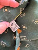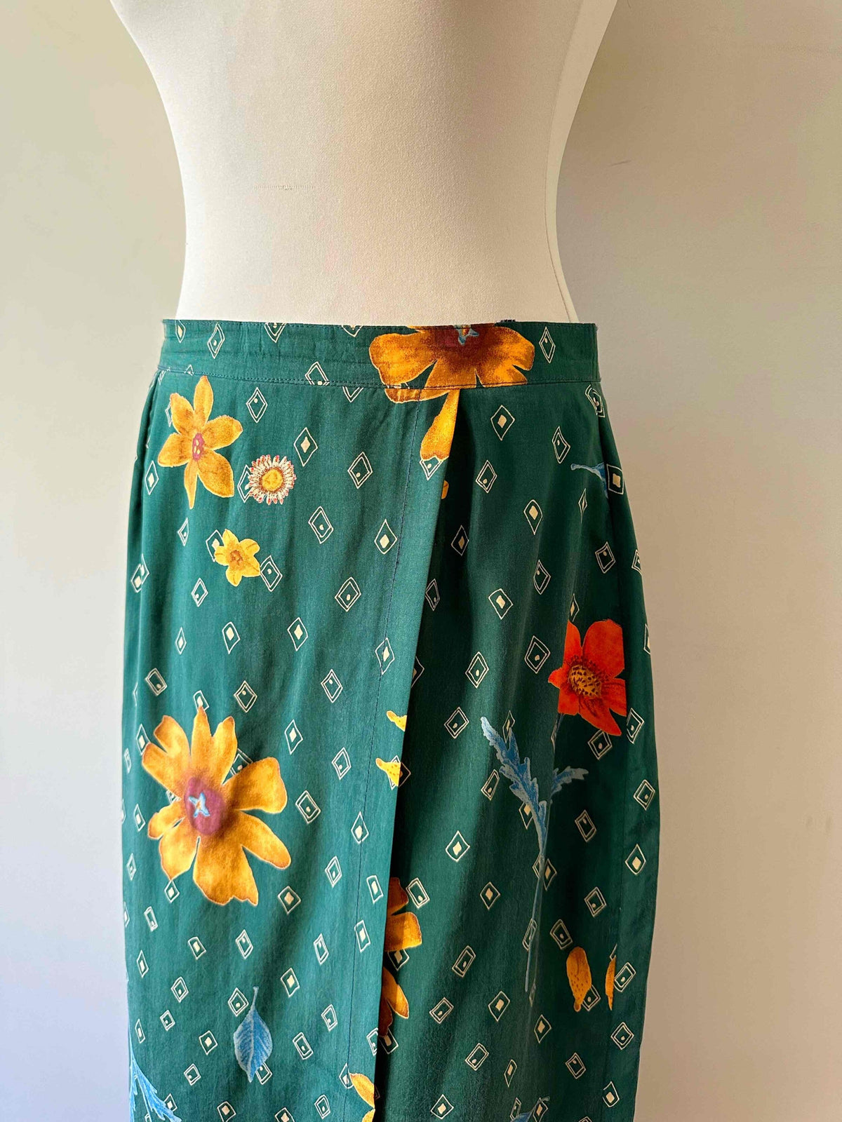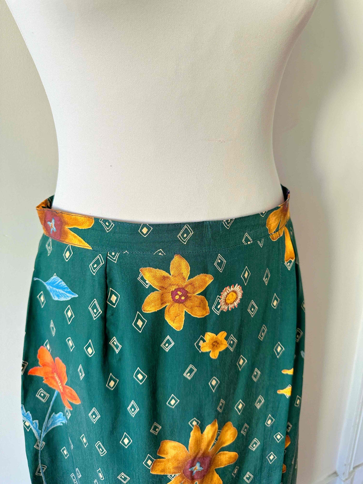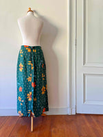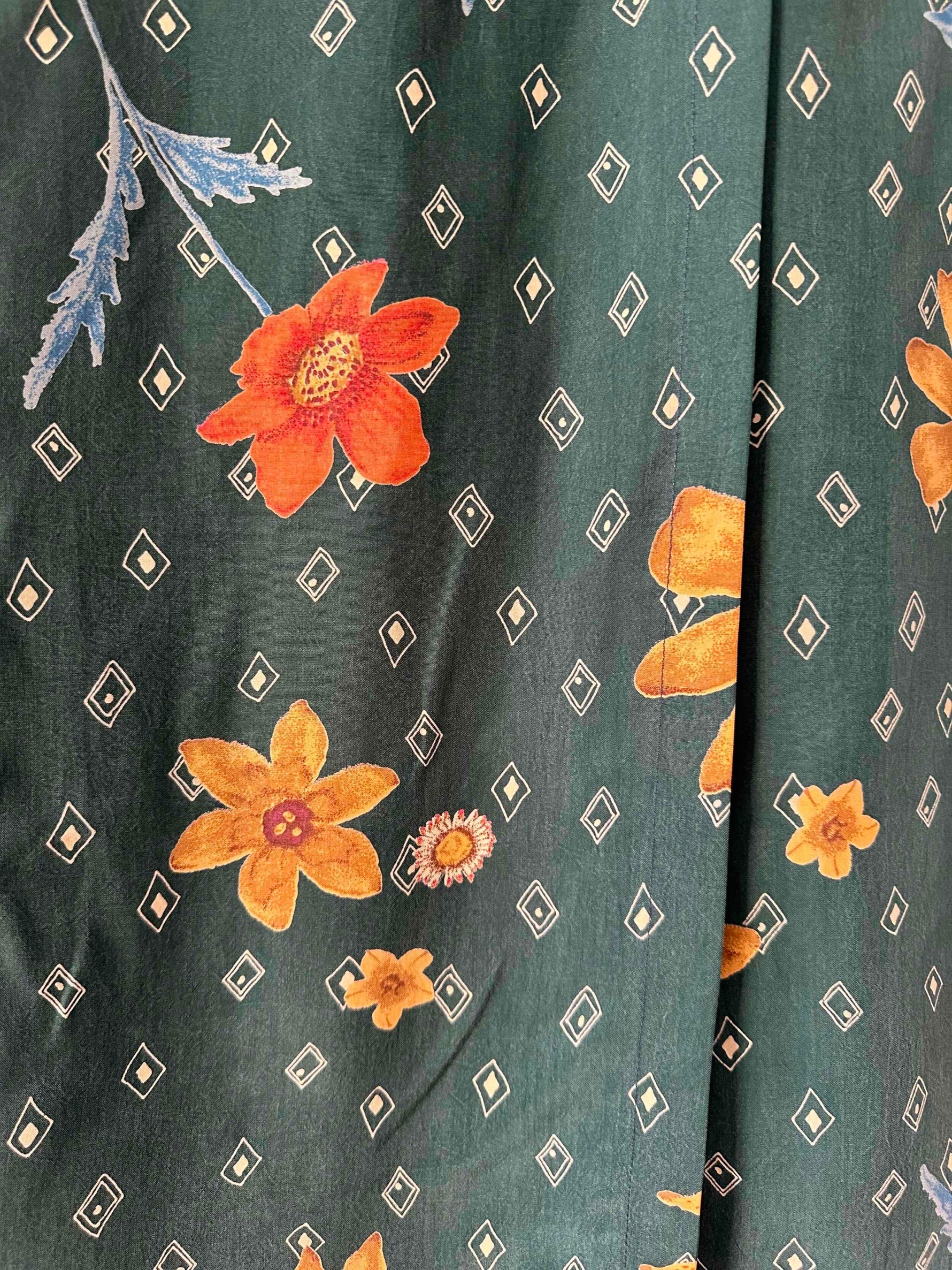 Prix unitaire parJupe longue portefeuille, en cupro soyeux vert bouteille, imprimée fleurs, marguerites, et losanges, effet portefeuille avec pan croisé devant, fermeture Éclair et bouton dos, convient aux tailles 38 et 40, hanches 50 cm.