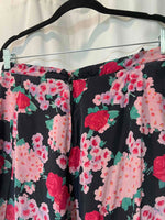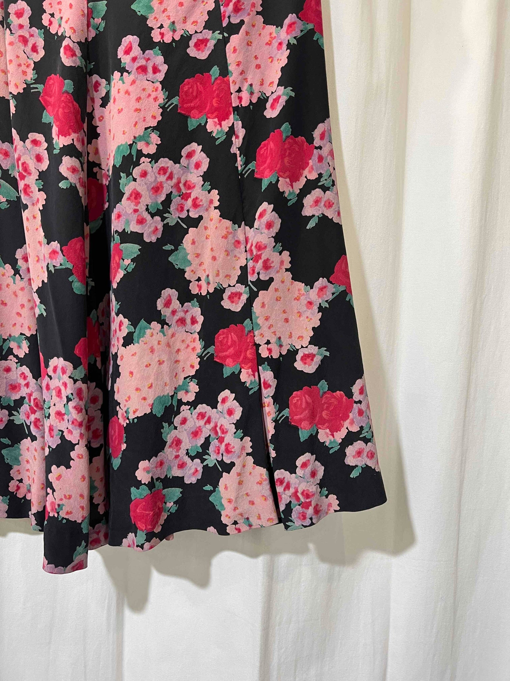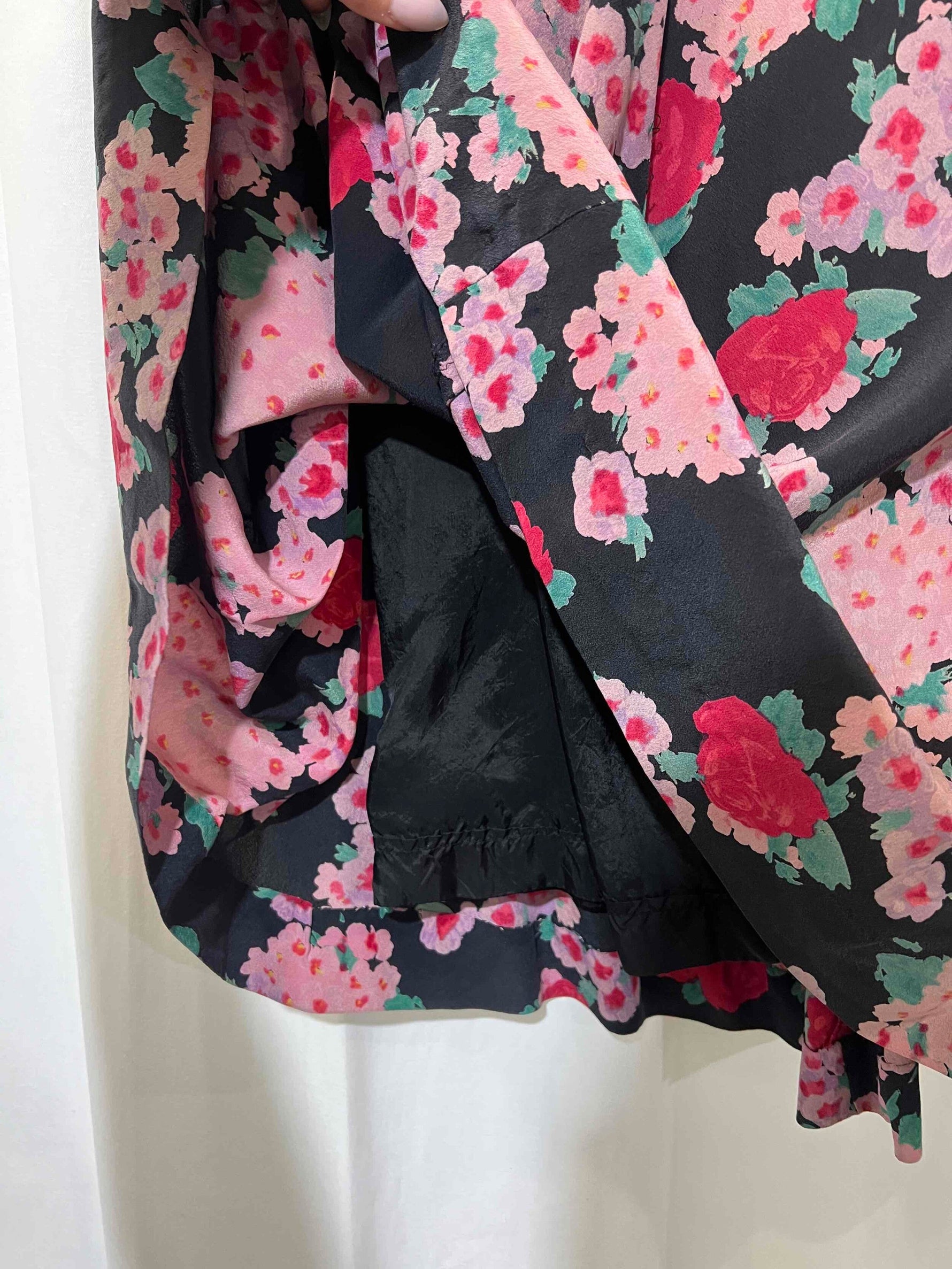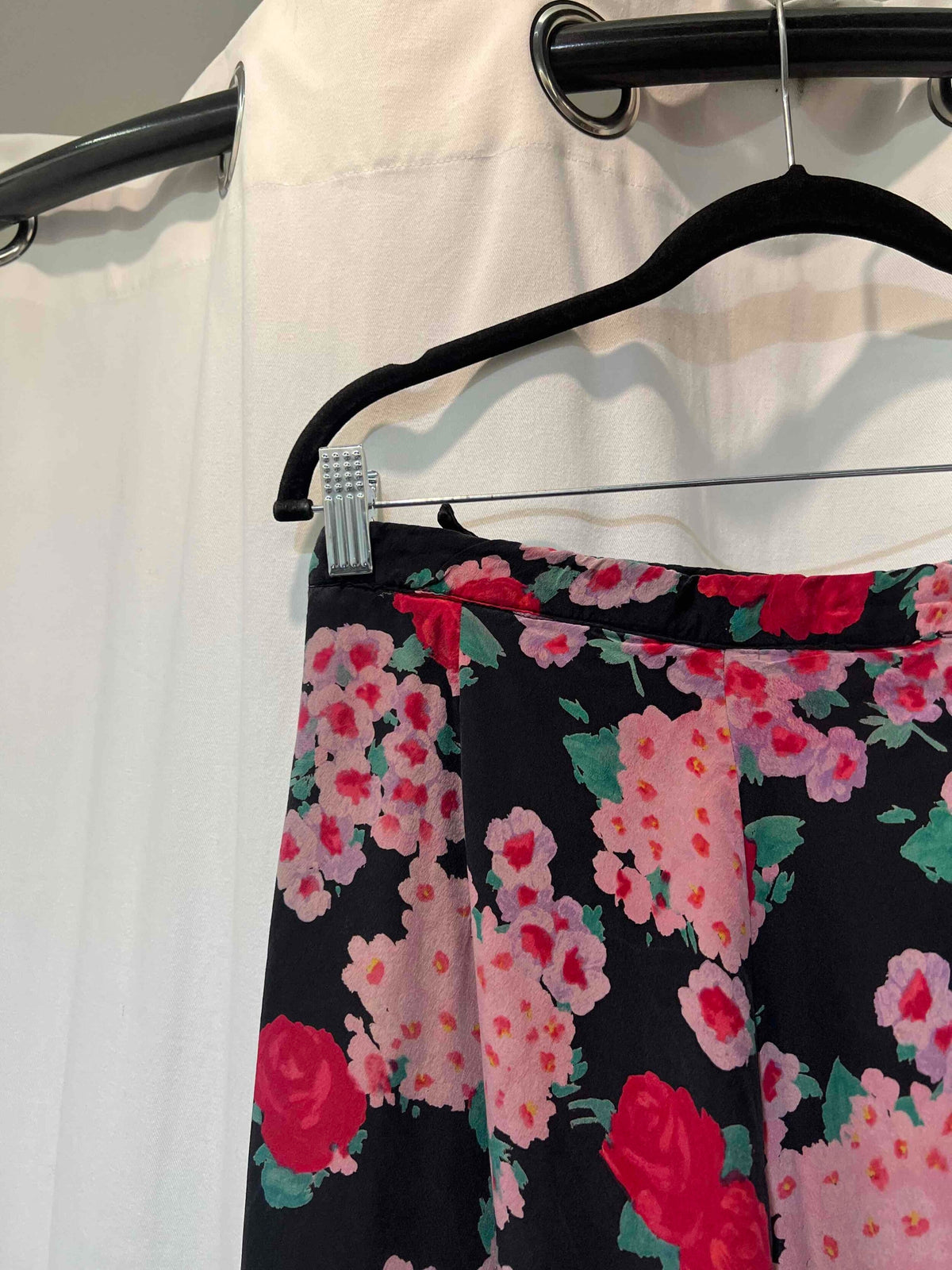 Prix unitaire parJupe midi en soie faire main noire avec des fleurs roses et parme. Doublée. Taille 36/38.