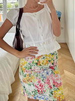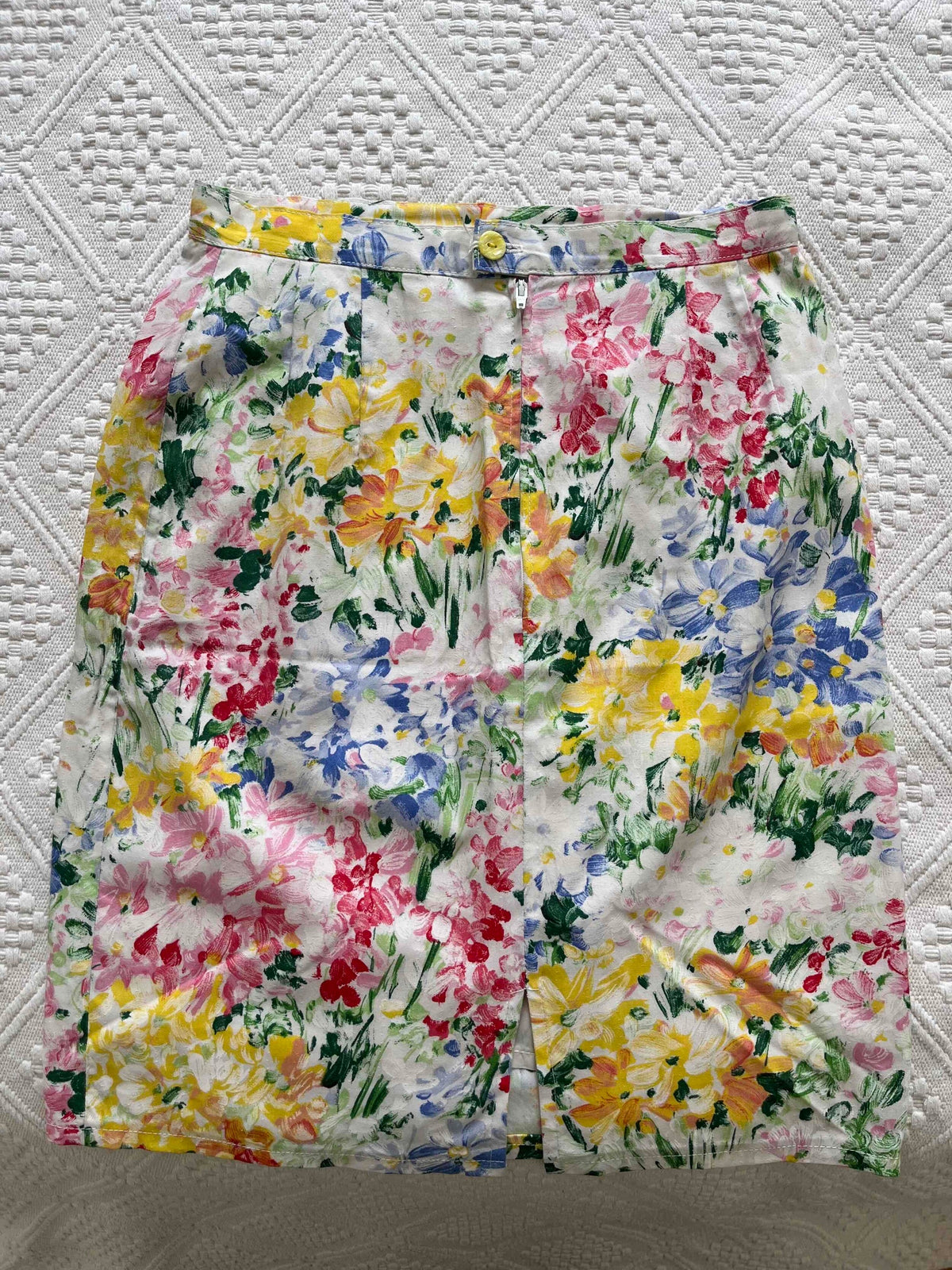 Prix unitaire parJupe à fleurs, taille haute, bouton et petite fermeture éclair à l’arrière, tissu doublé non stretch. Porté ici sur une T36 pour 1m64