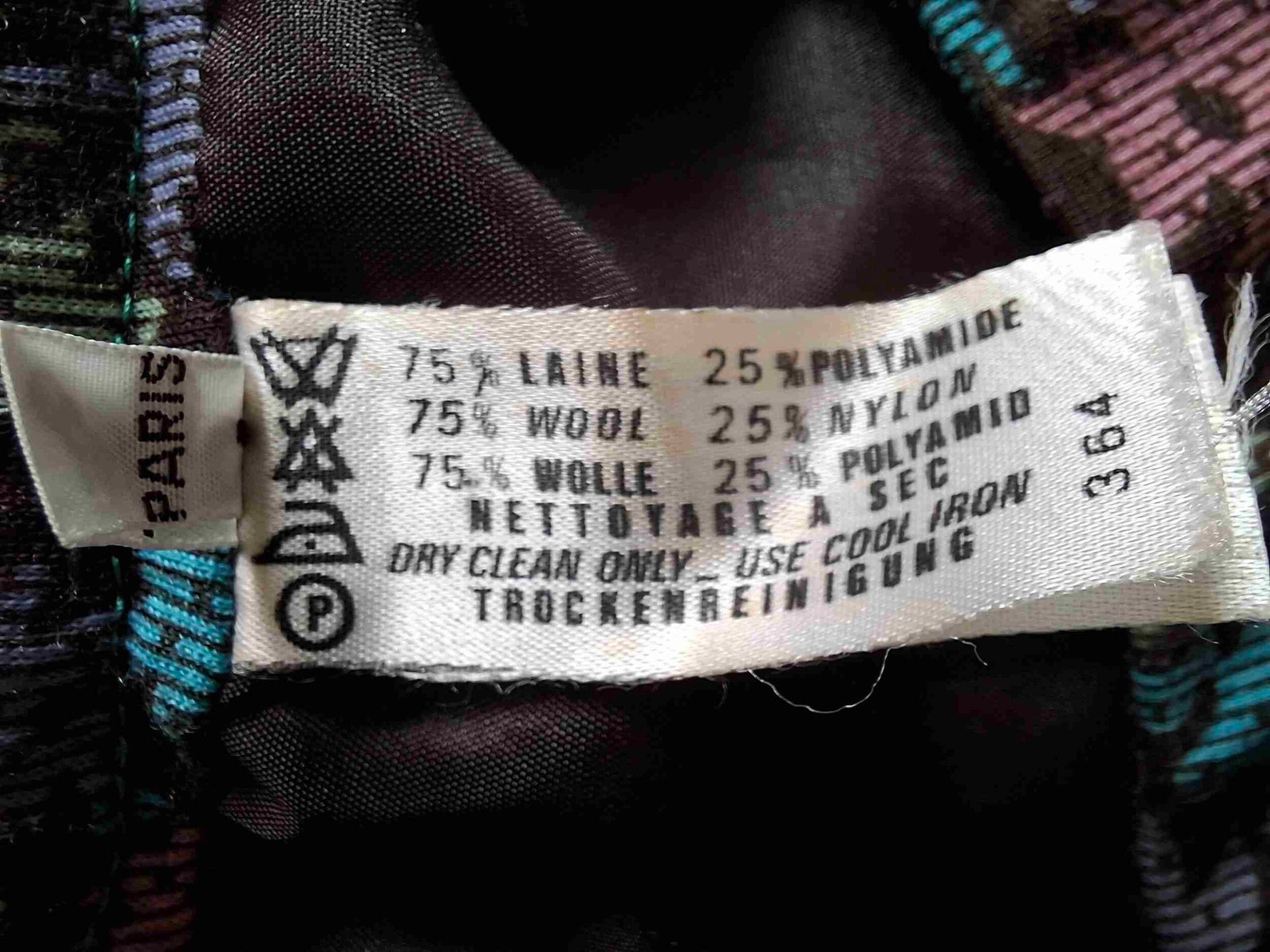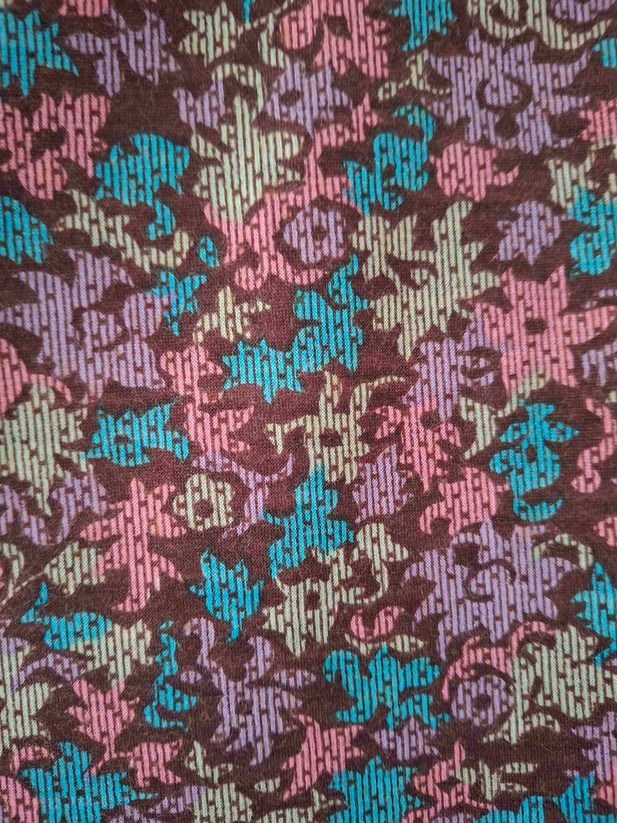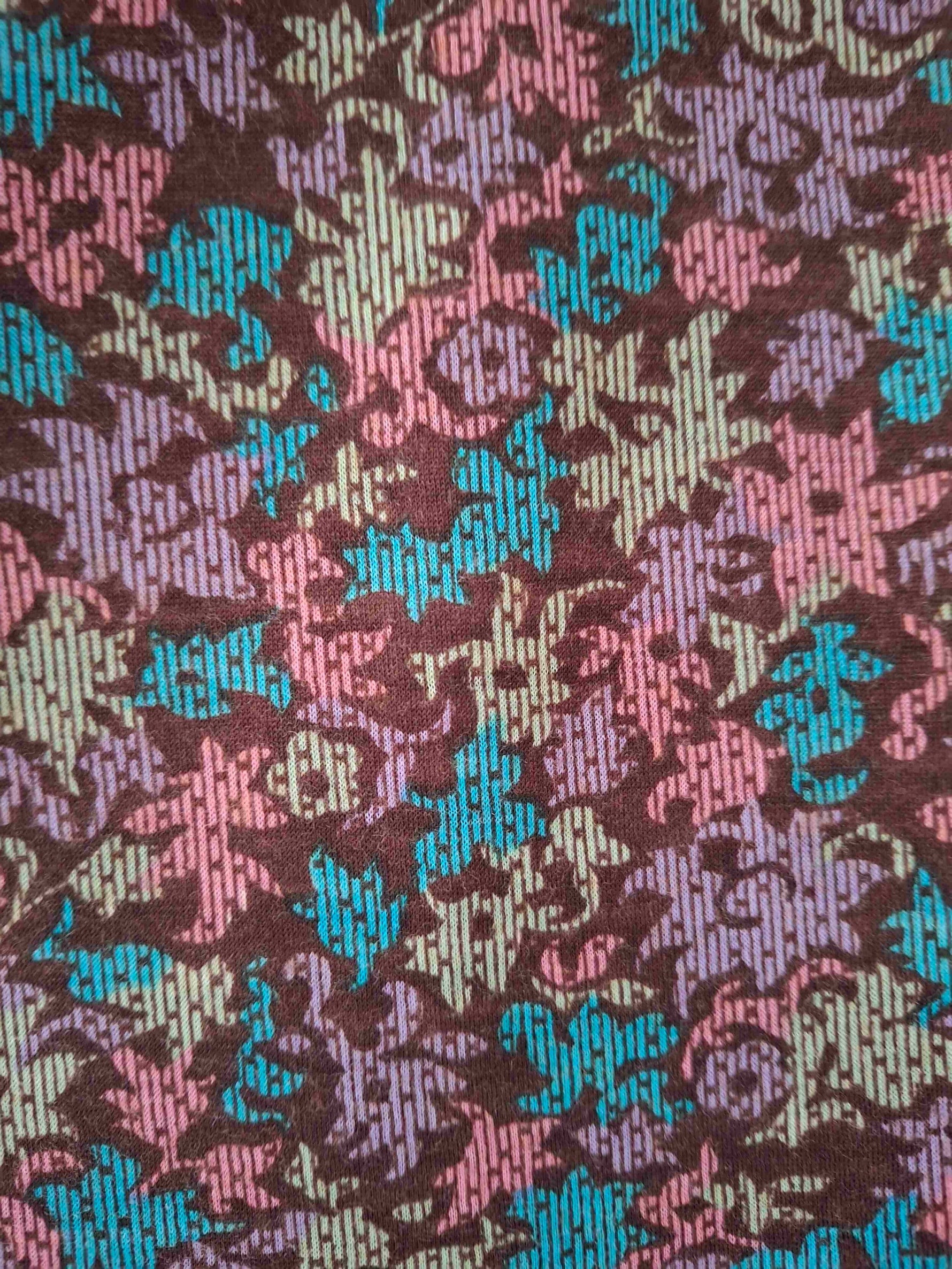 En laine à 75% marron et petites fleurs turquoise, rose et vert...