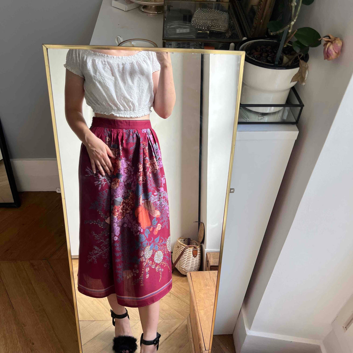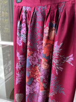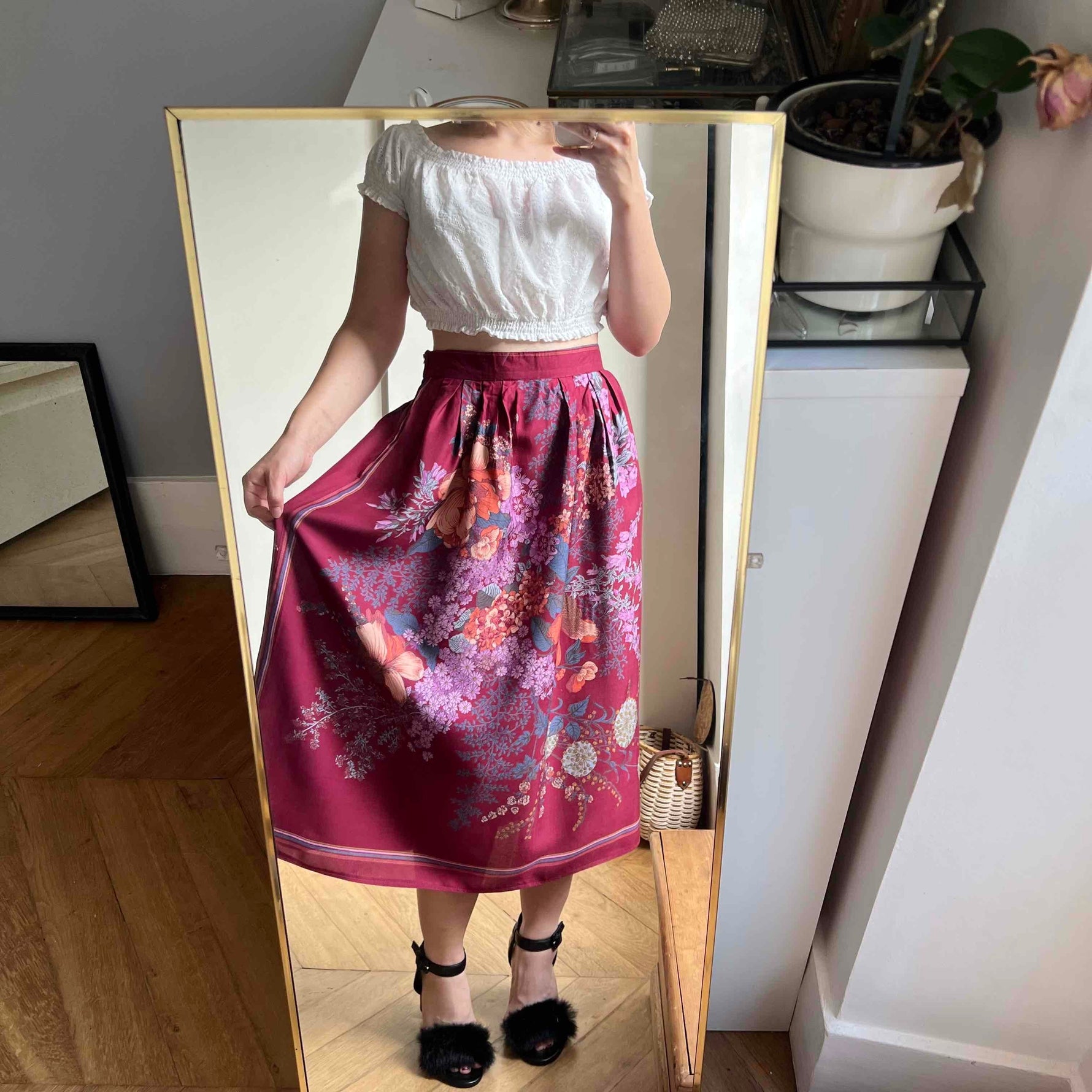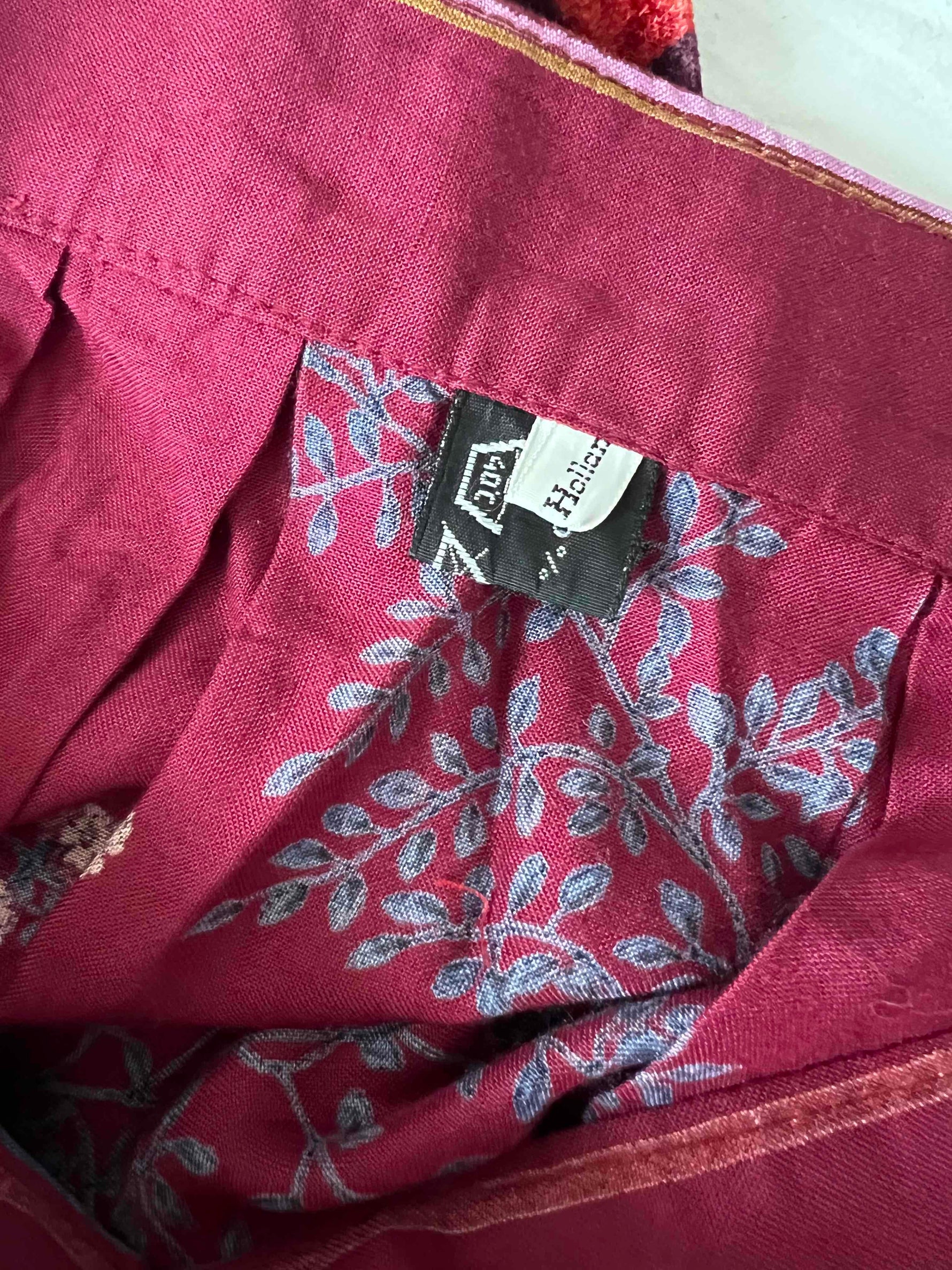 Prix unitaire parJupe long violet Bordeaux avec un motif de fleurs au centre. Viscose, fluide et agréable avec un zip sur le côté. Longueur mi-mollet. Jupe traditionnelle fabriquée en Hollande. Excellent état, aucun défaut années 70. Taille 36/38.