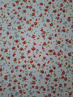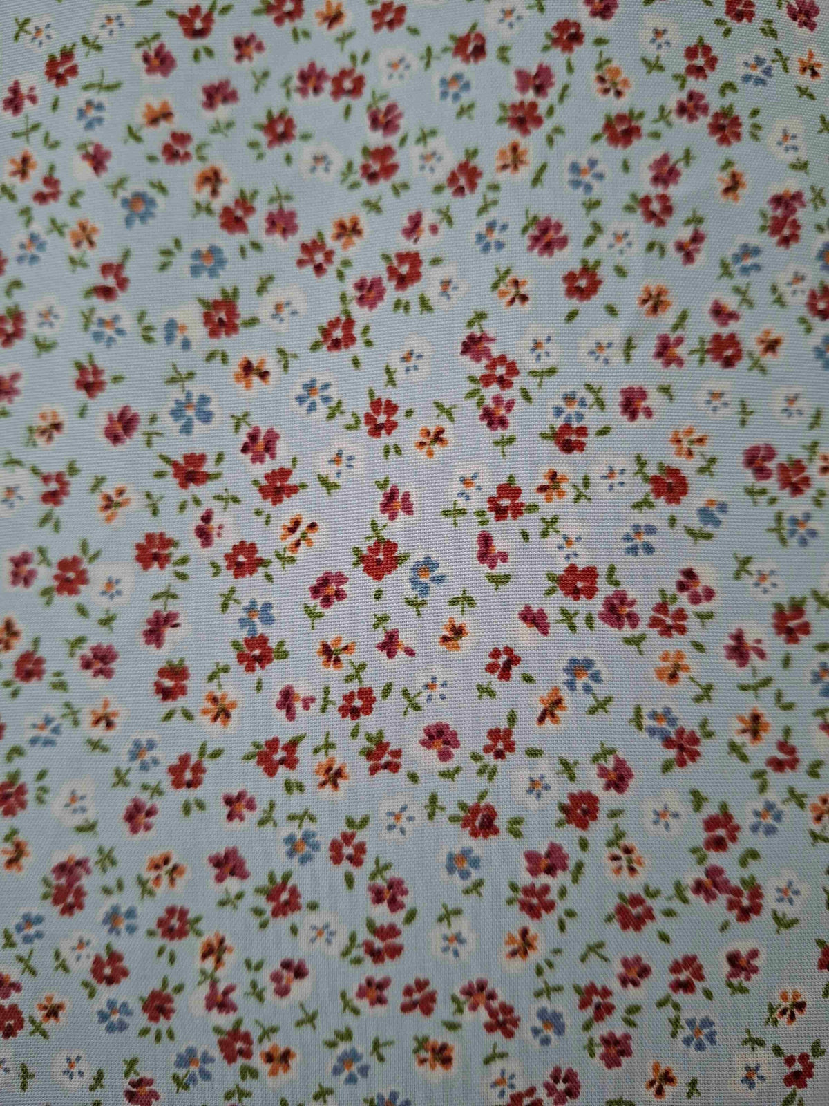 En viscose bleu clair et petites fleurs rouges, blanches,orangé, vert...