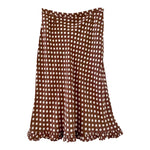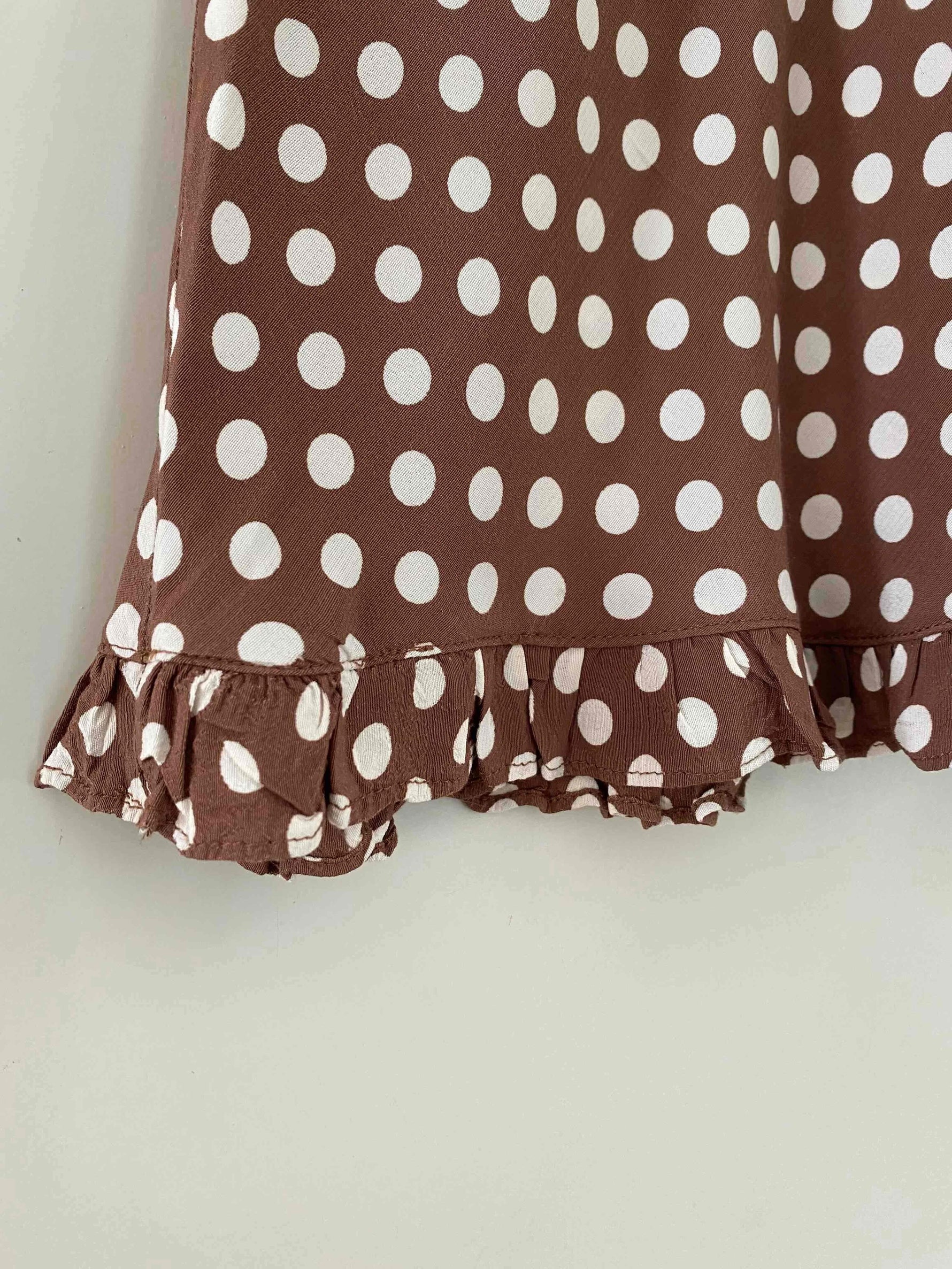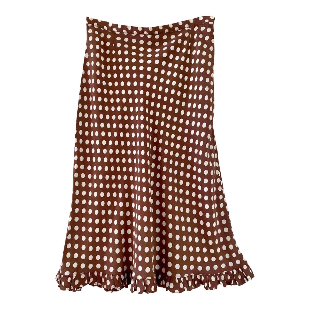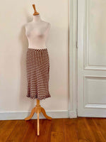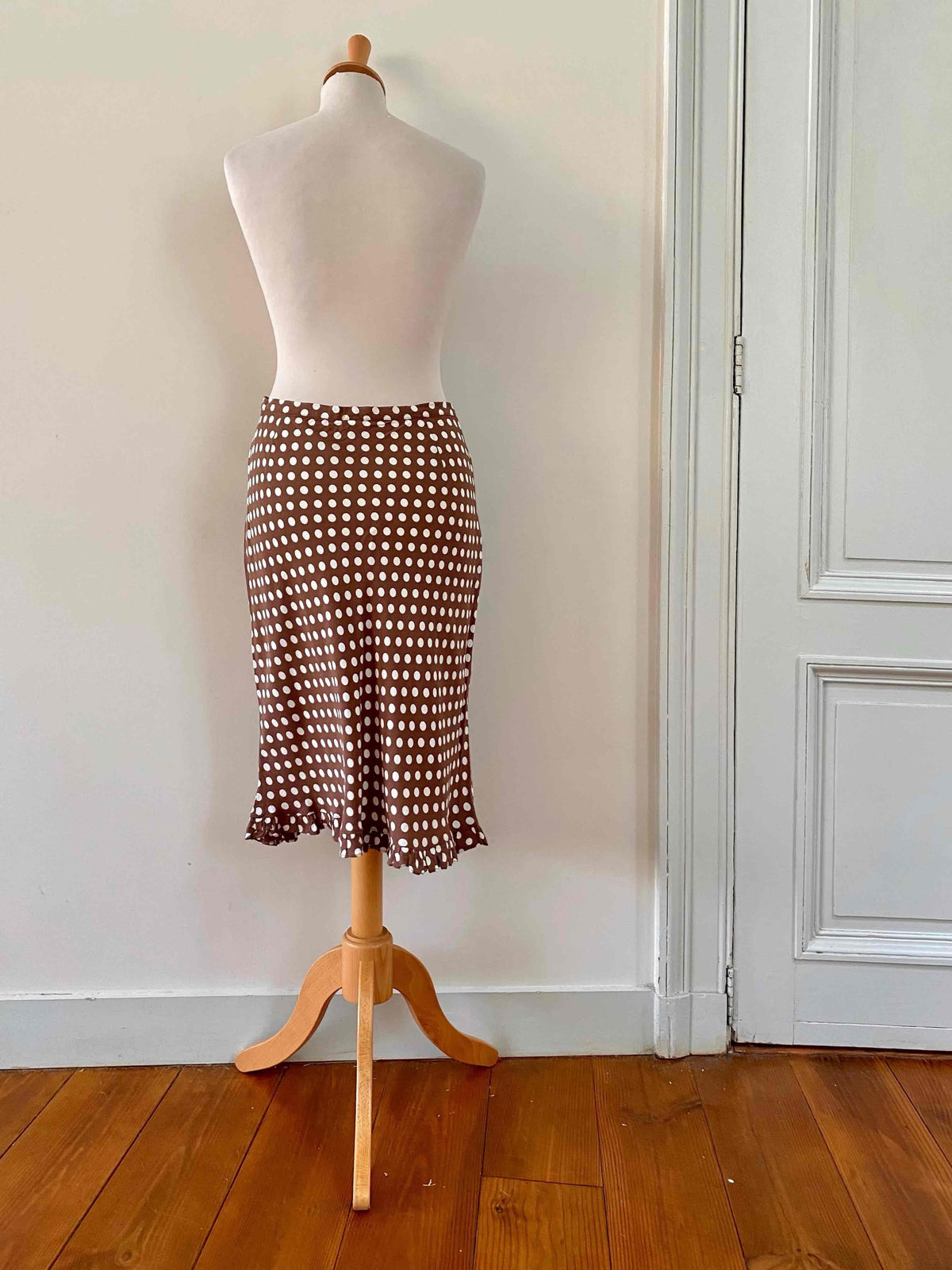 Prix unitaire parJupe midi à pois, en viscose chocolat au lait imprimée pois blancs, bas à petit volant, forme fit and flare en biais, taille 36 portée ici sur un mannequin T36.