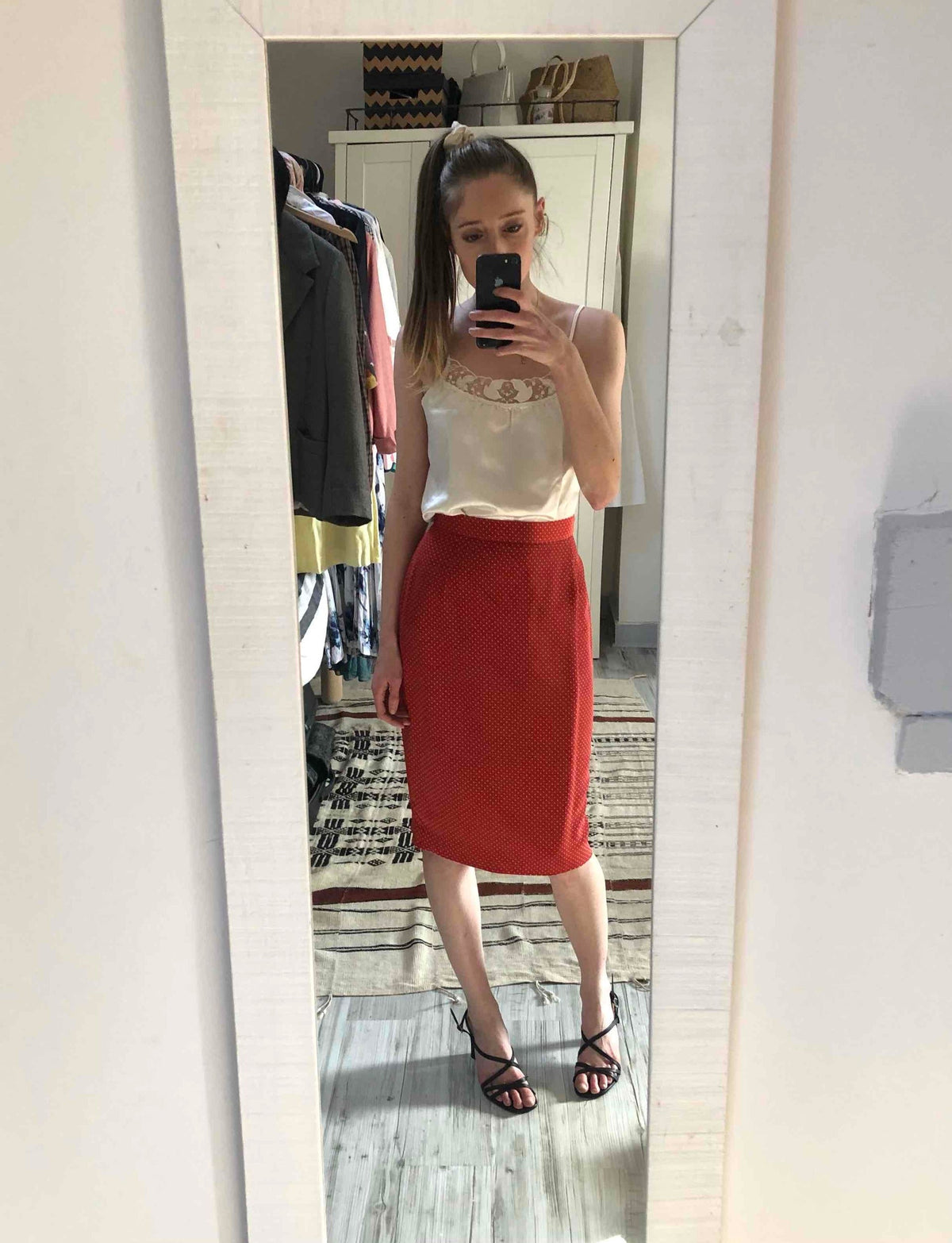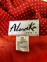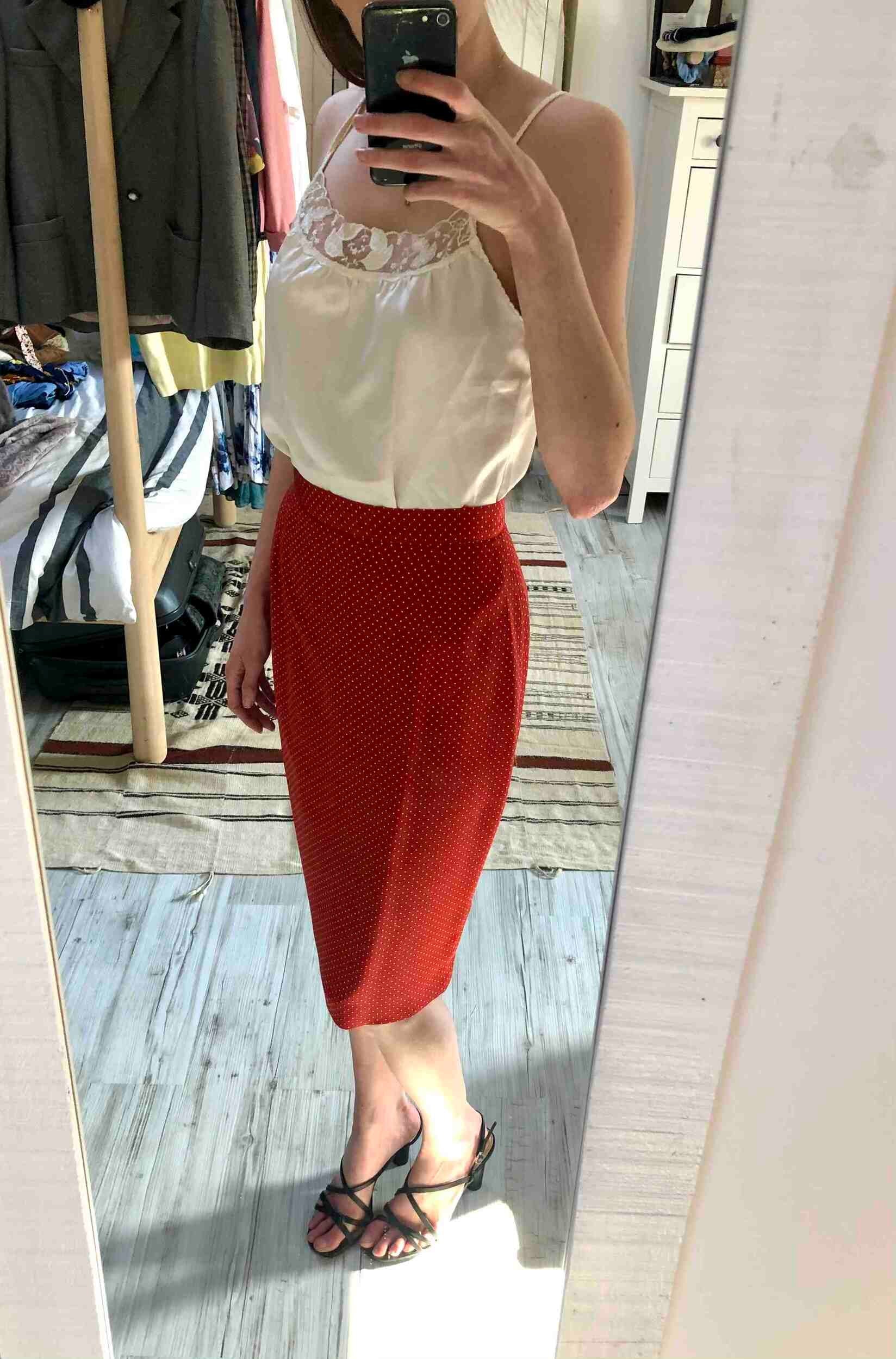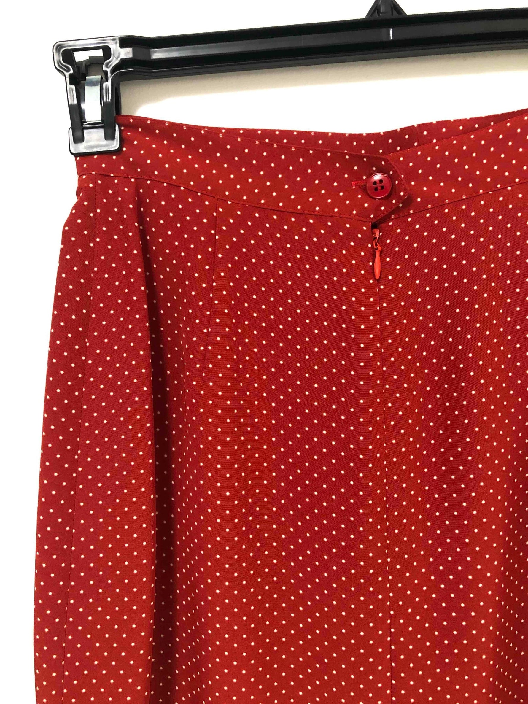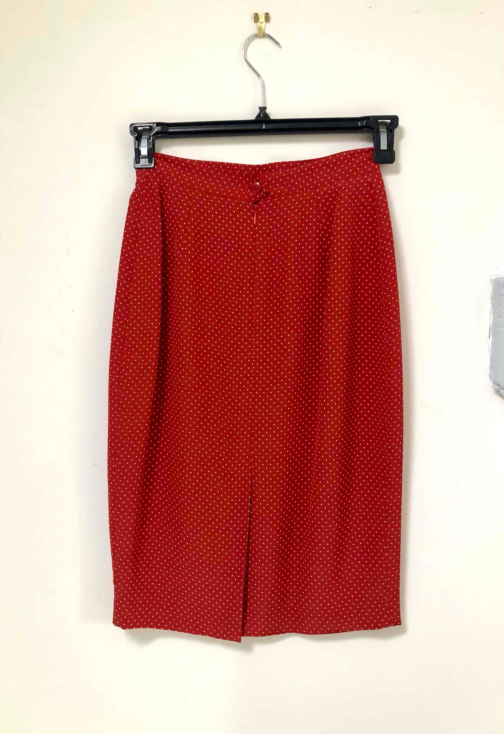 Prix unitaire parJupe rouge à pois. Une pièce vintage des années 70/80 fabriquée en France. Coupe près du corps, taille haute, longueur sous le genou. Pinces à la taille et aux hanches qui dessine la silhouette, légèrement fendue à l’arrière, doublée.