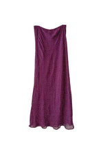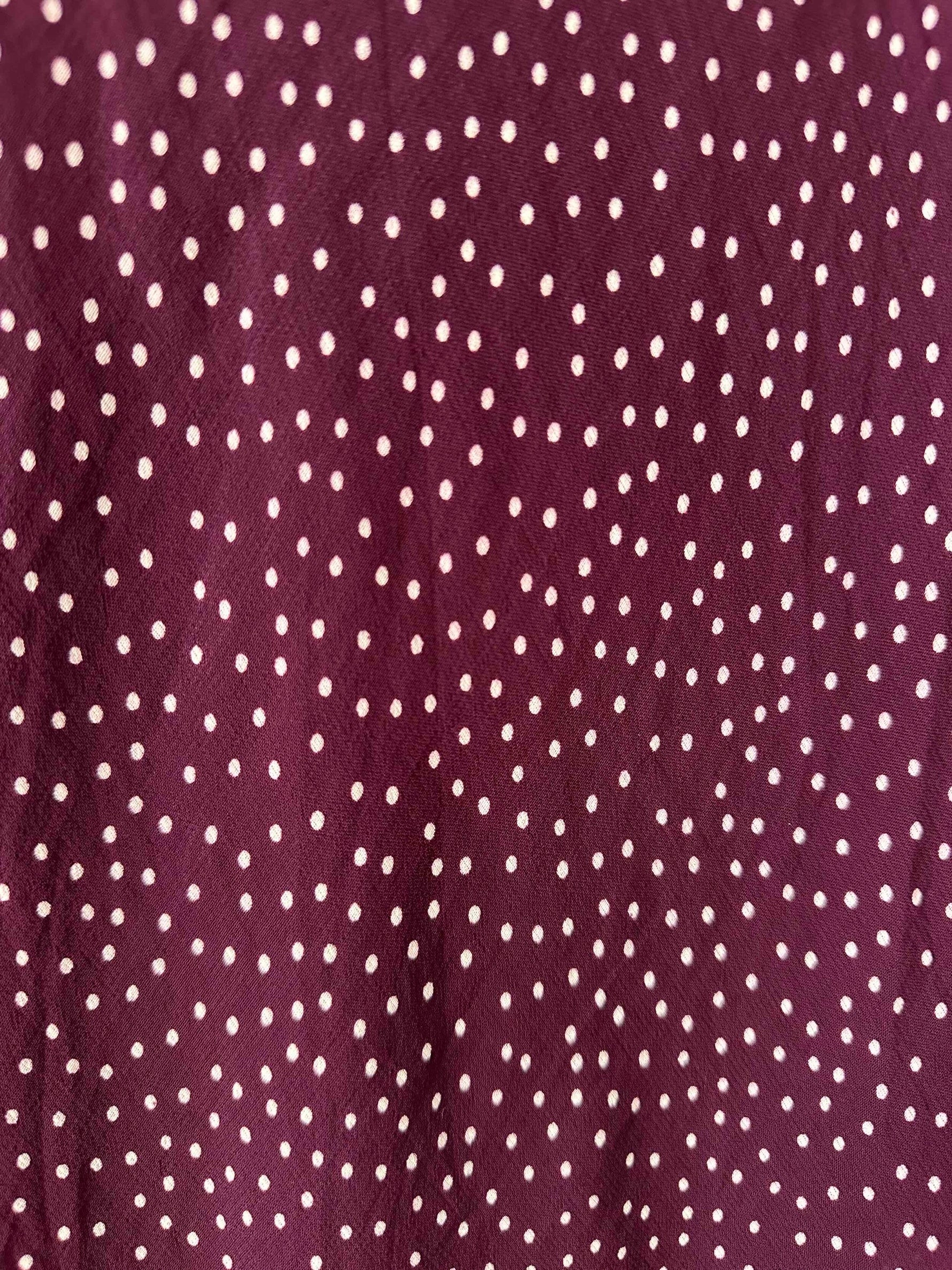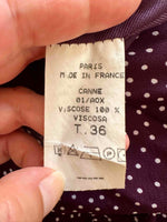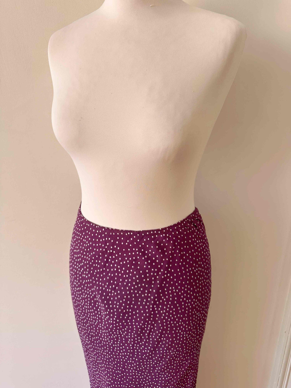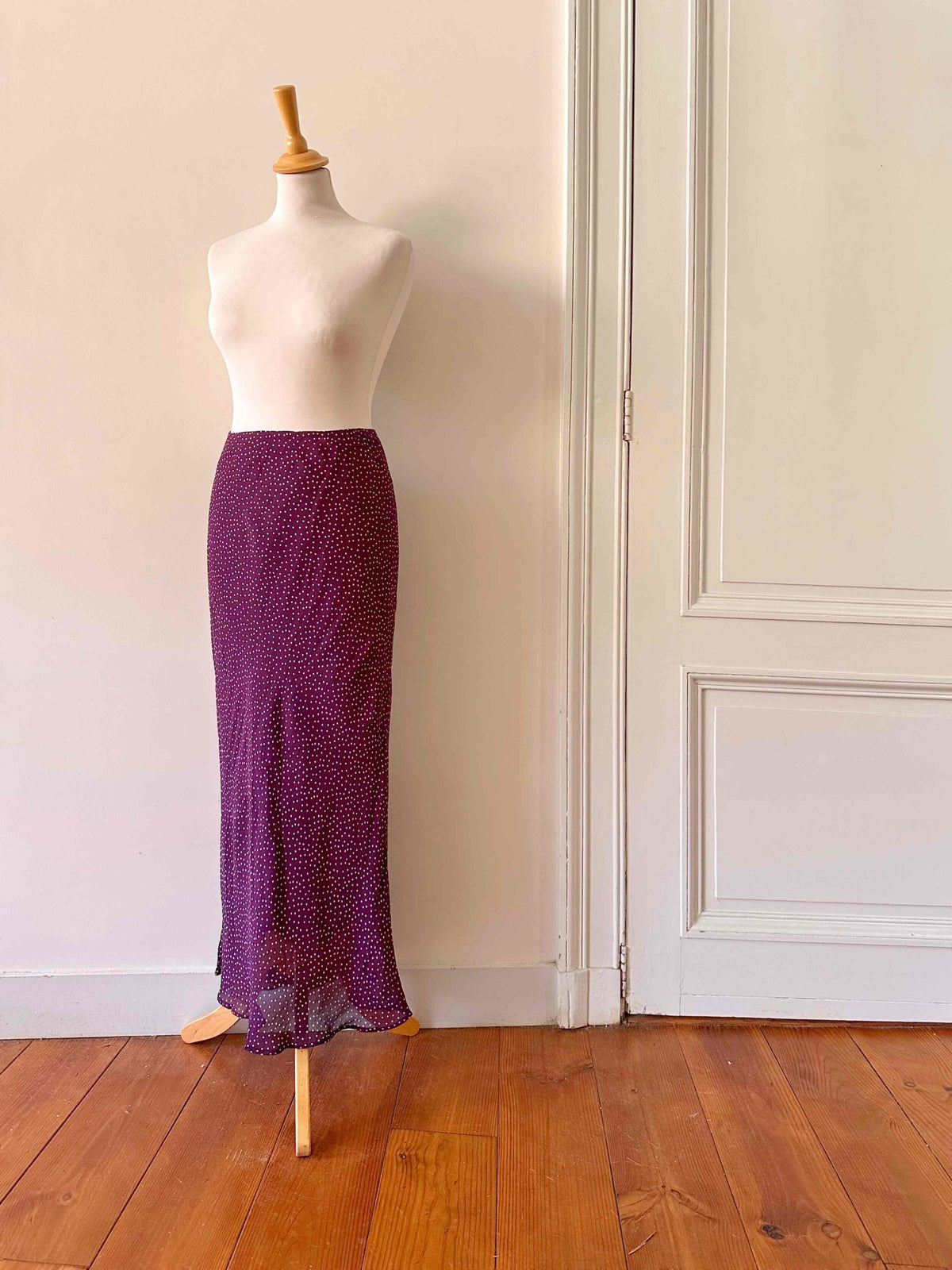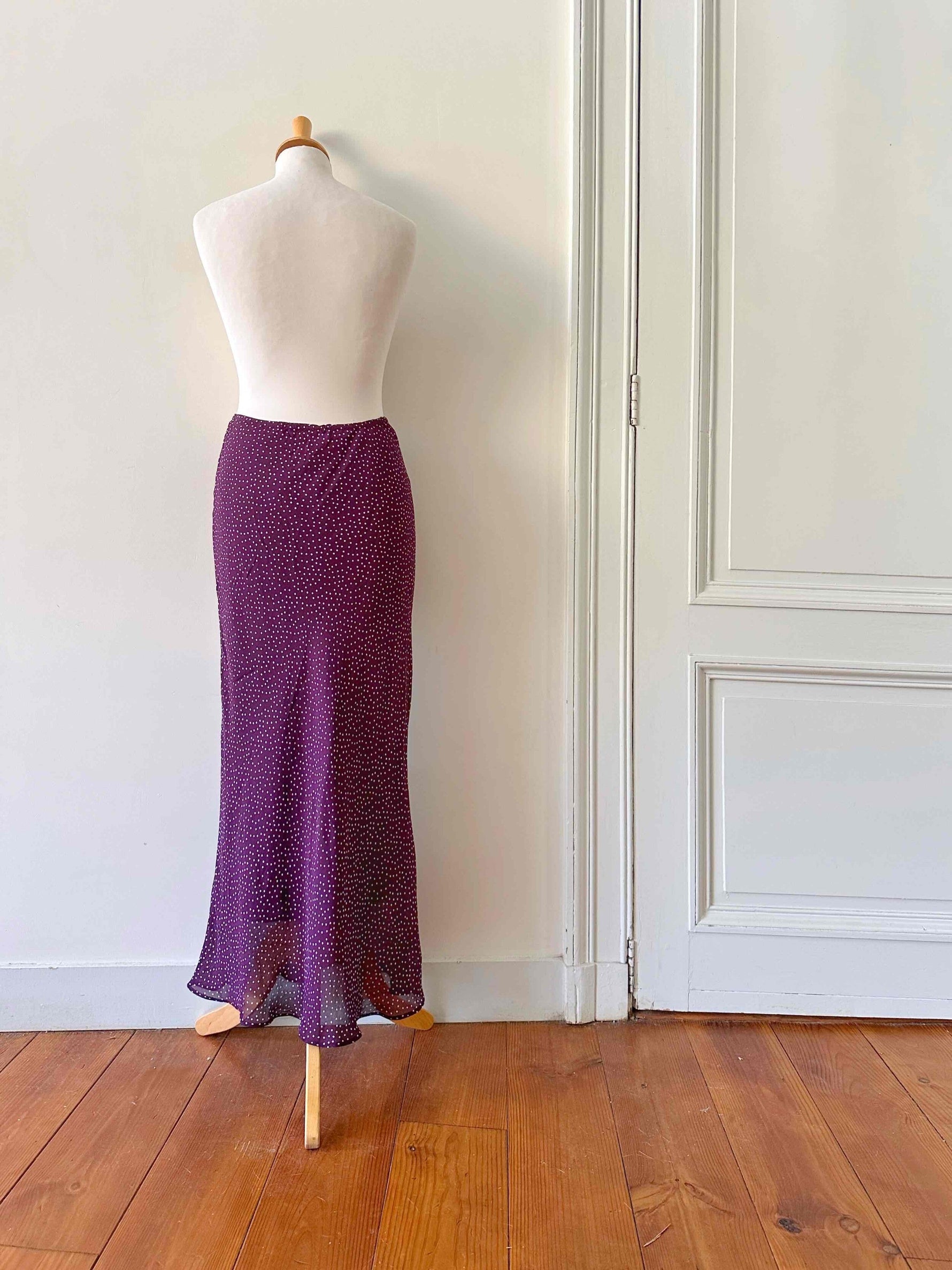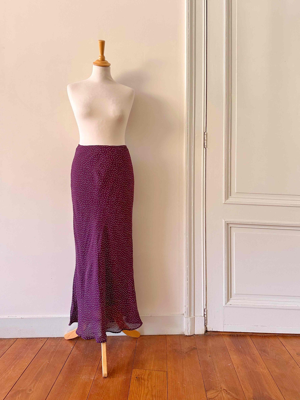 Prix unitaire parJupe longue à pois, en voile viscose violet imprimée minis pois blancs, taillée en biais, taille élastique, fabriquée en France, taille 36 portée ici sur un mannequin T36.