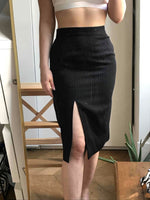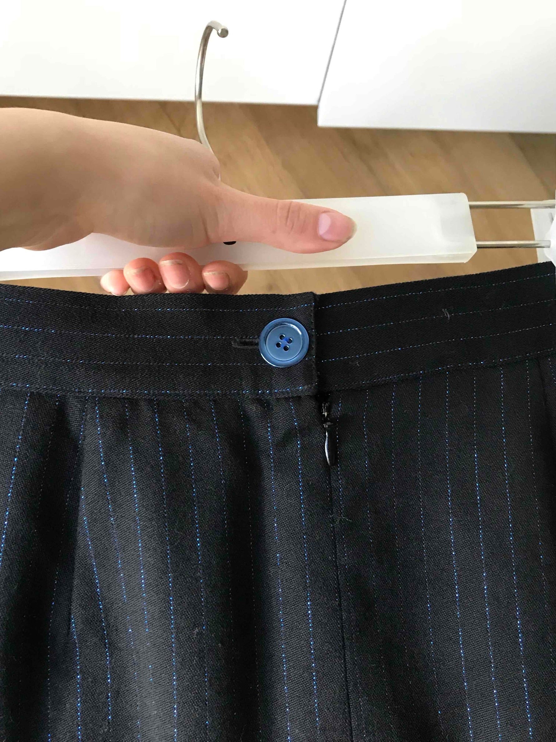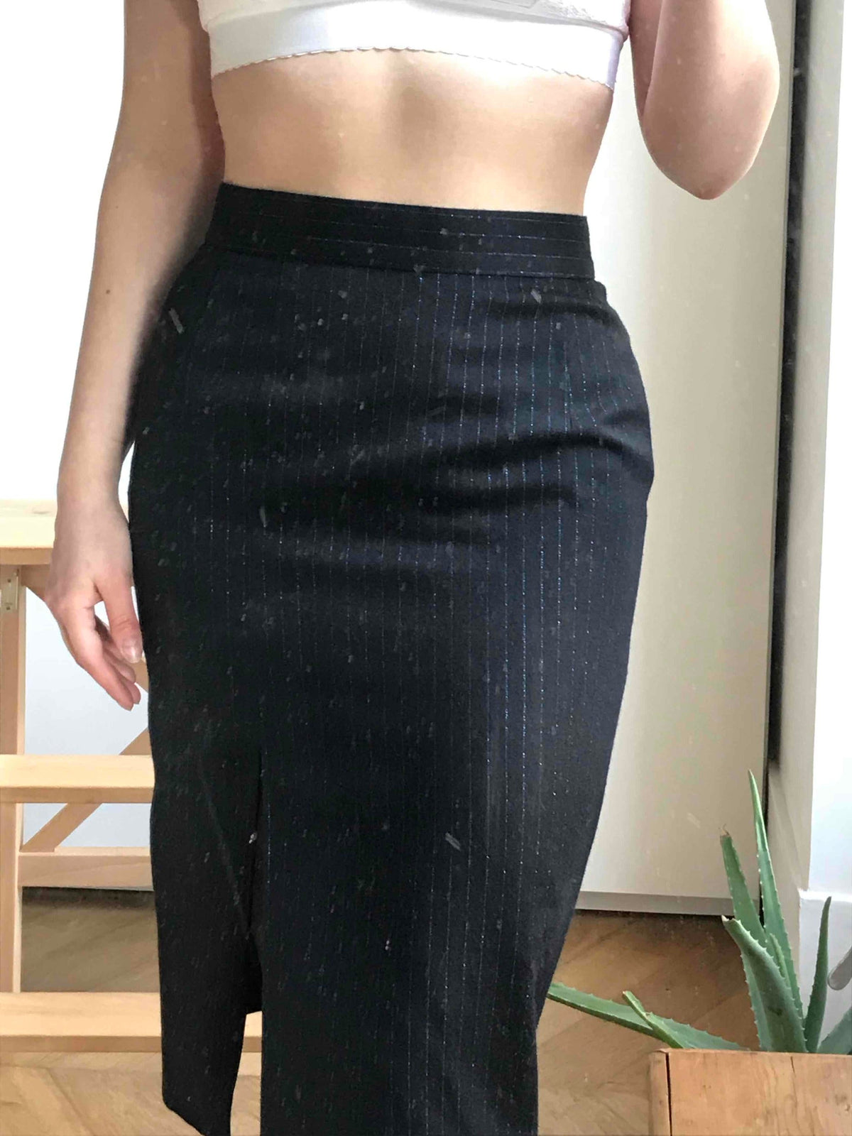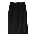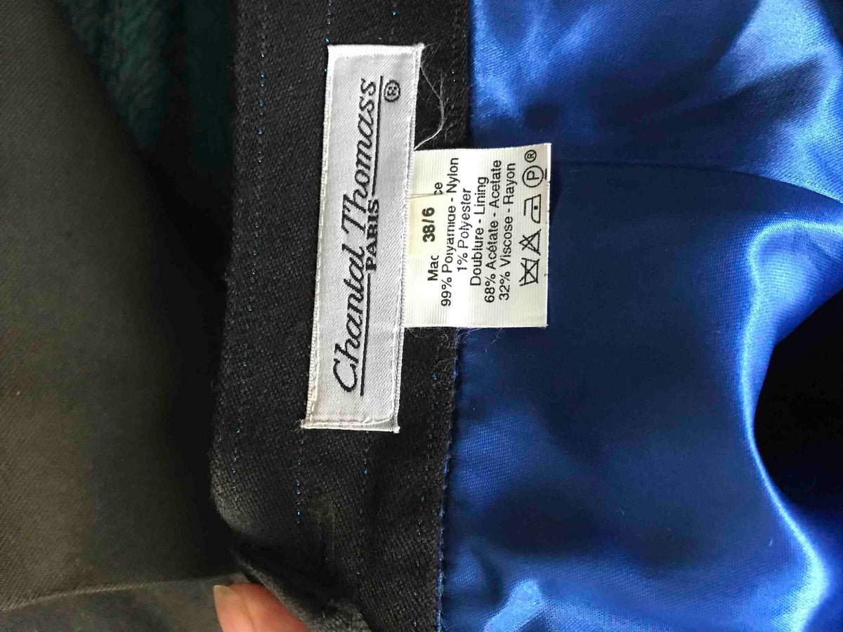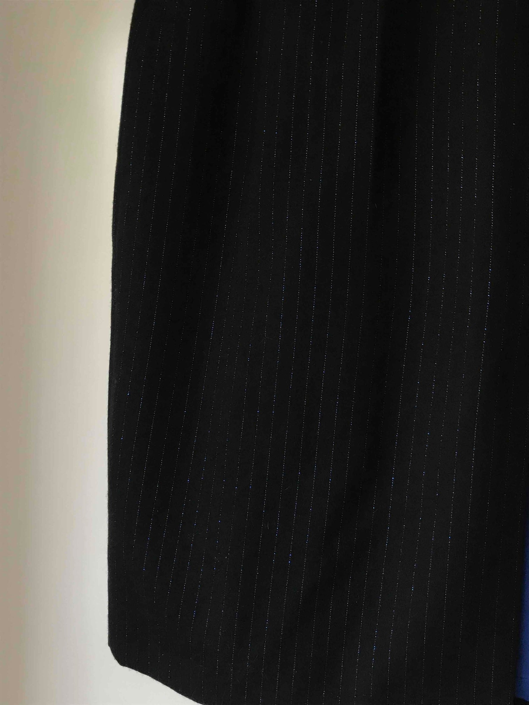 Prix unitaire parJupe tailleur à fente, noire et lignes verticales bleu pailleté de la marque Française Chantal Thomass. Taille 38 (assez petit au niveau des fesses plutôt un 36). Fabrication française.