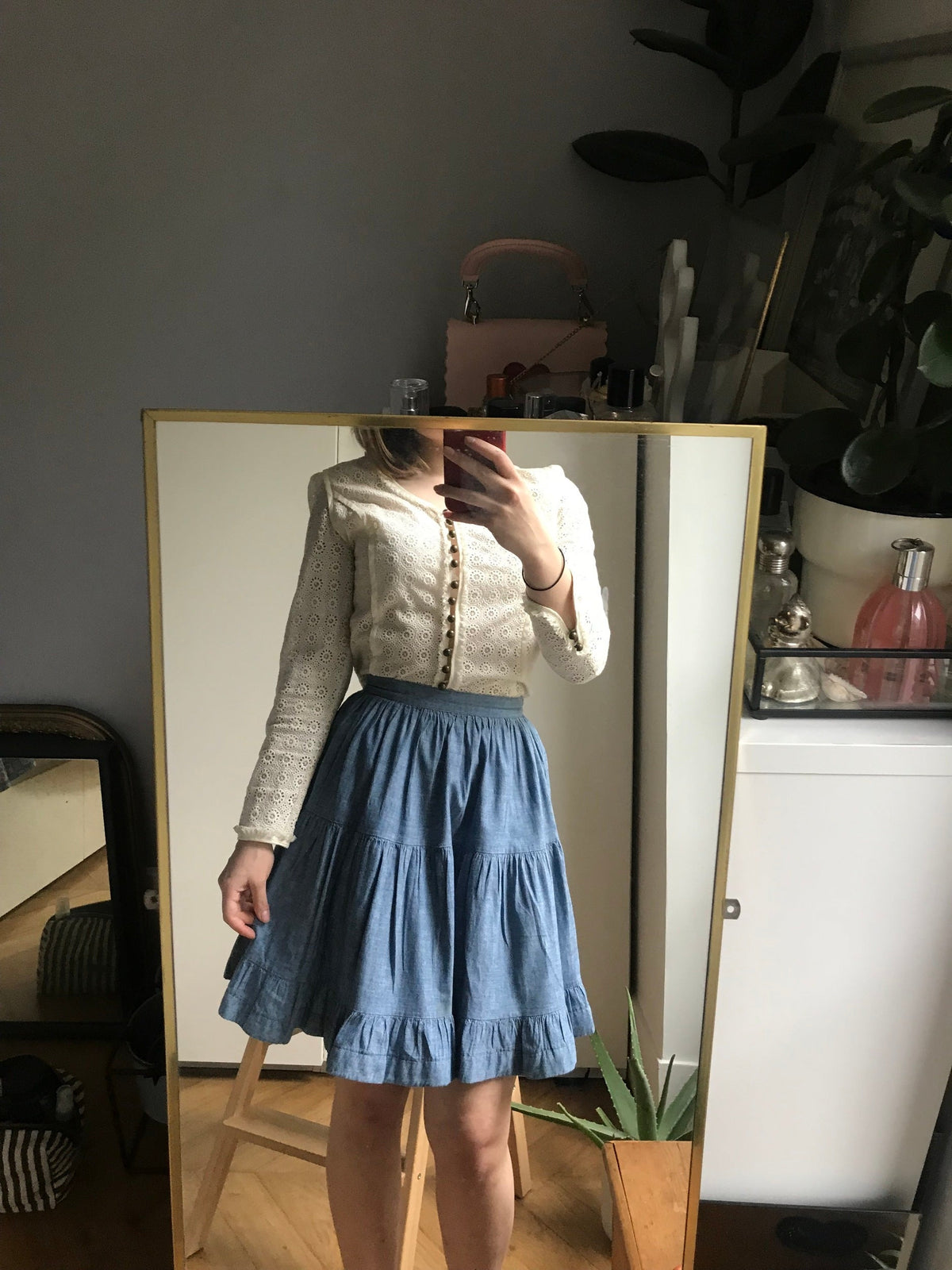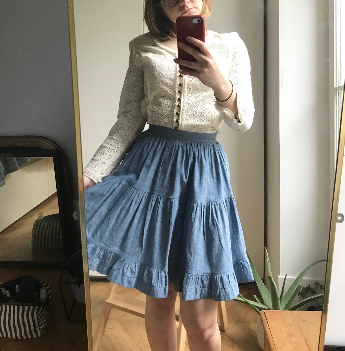 Prix unitaire parJupe à volants, bleu, coton chambray, 100 % coton de belle qualité, fabriquée en France. Taille 38 mais fit également un 36.
