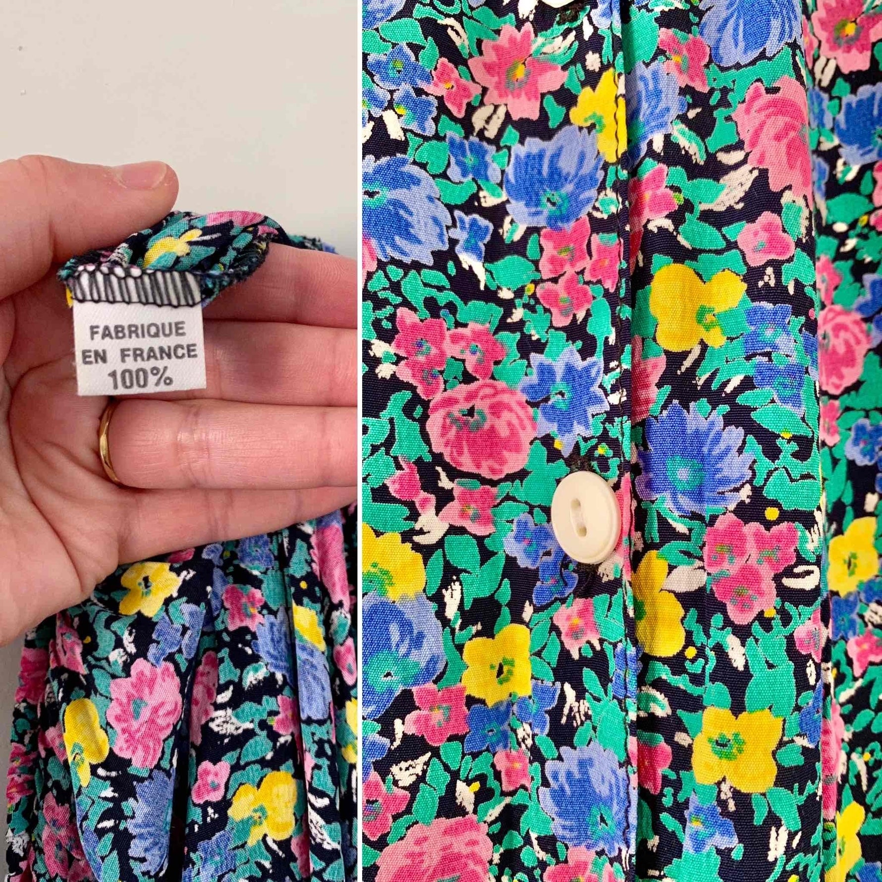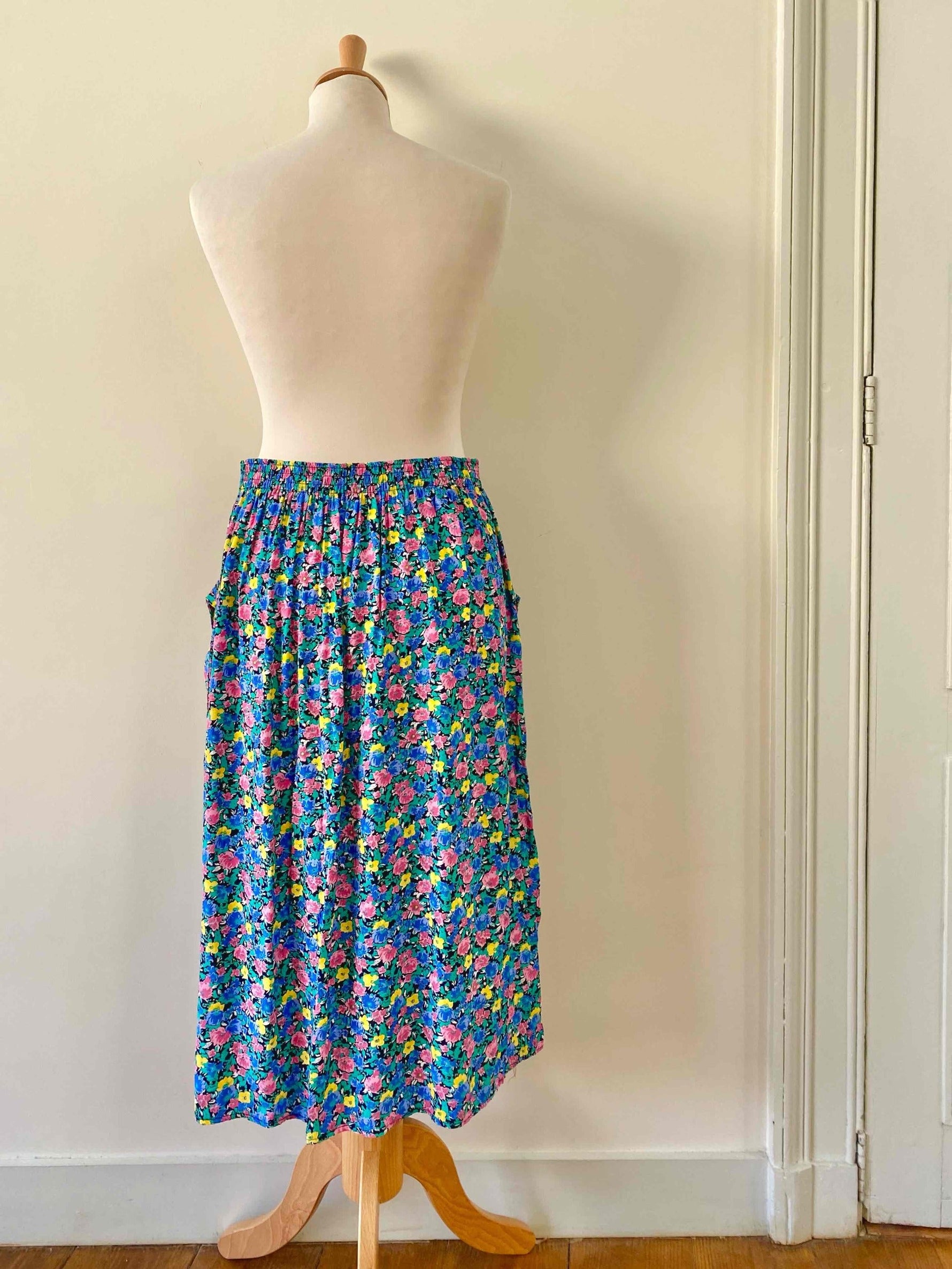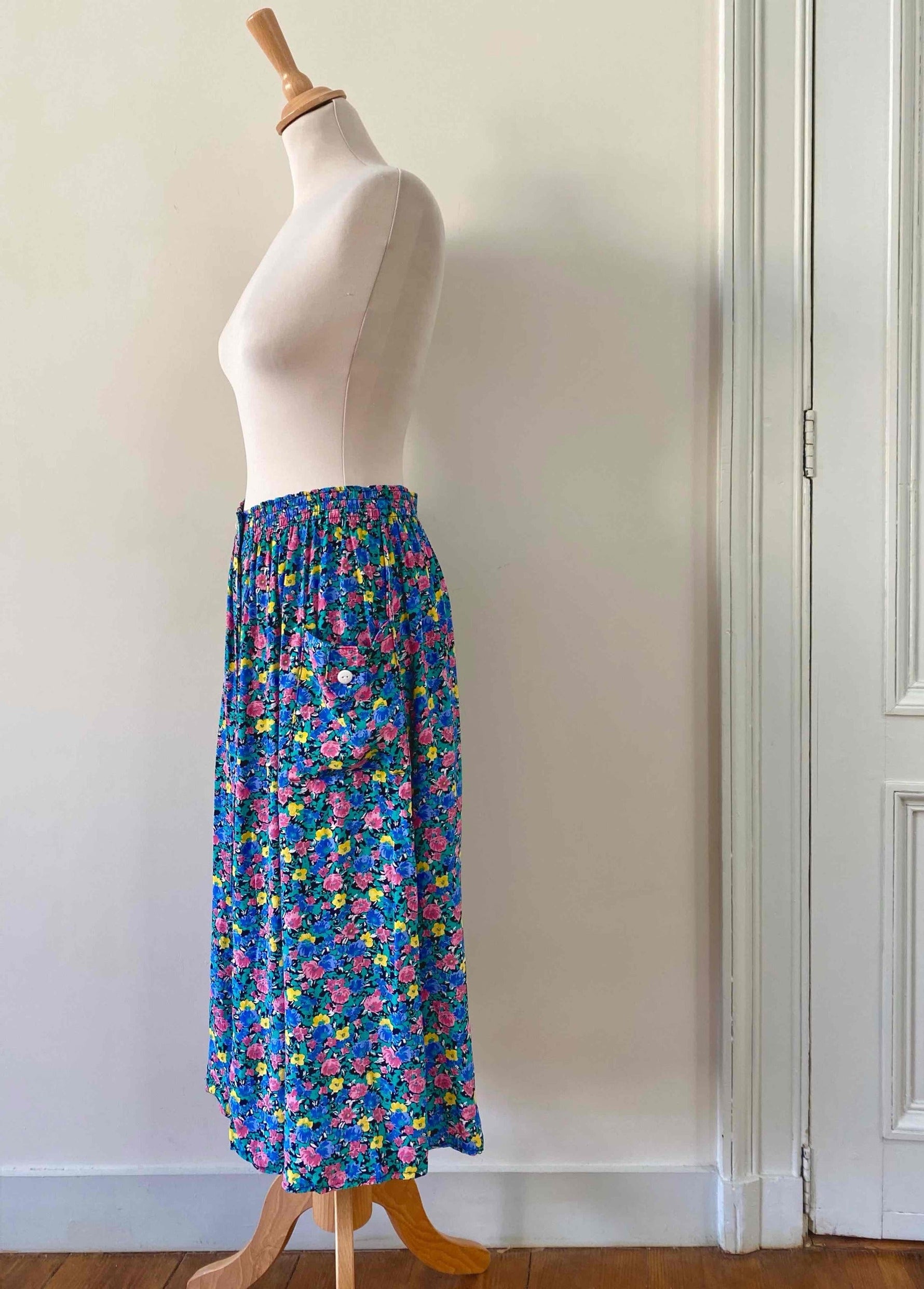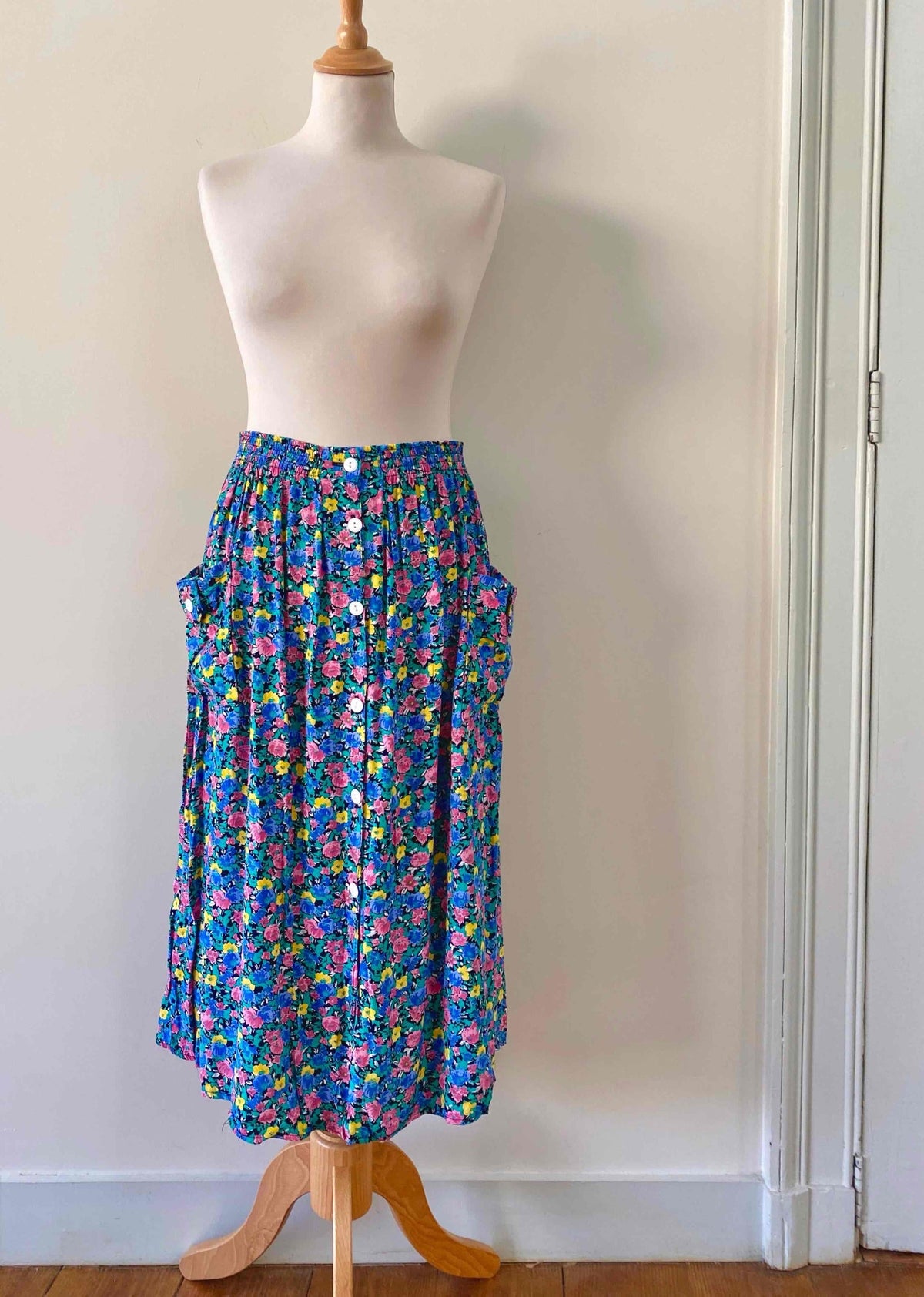 Jupe Boutonnée à Fleurs multicolores, longueur midi, poches côtés boutonnées, taille élastique et boutons, fabriquée en France. Taille élastique de 35cm à 40cm