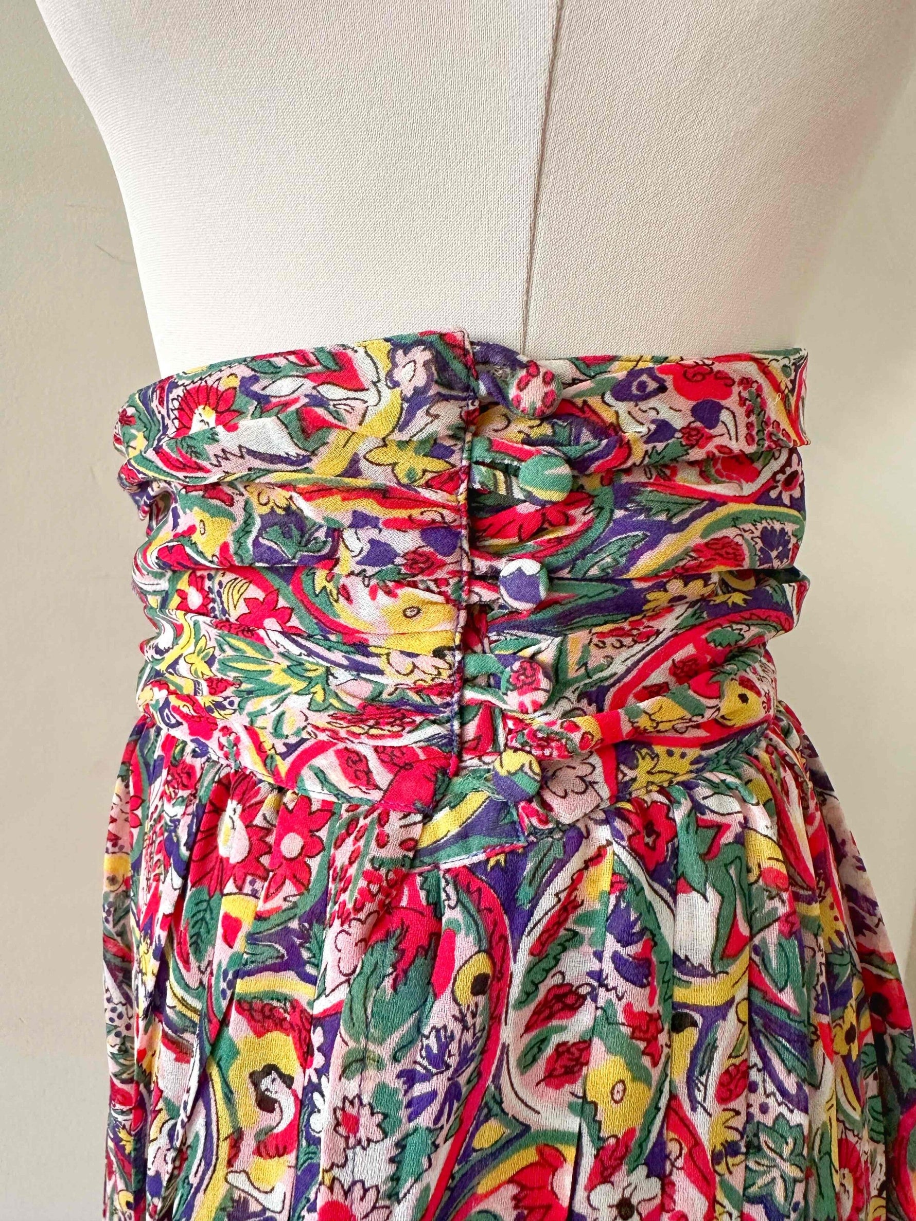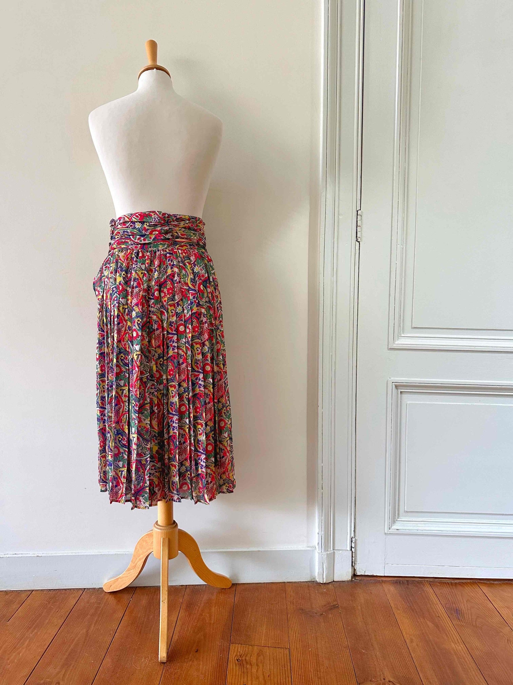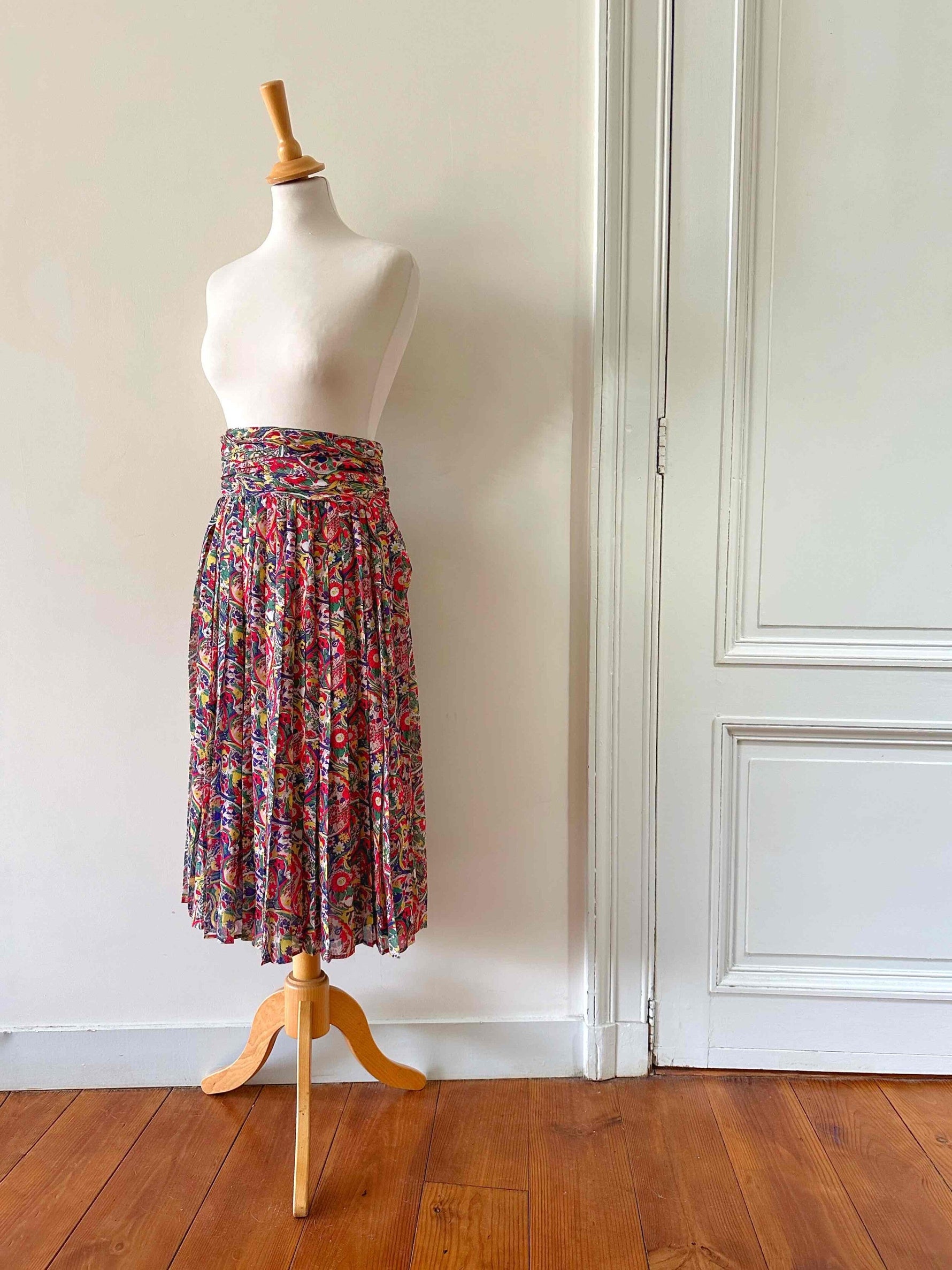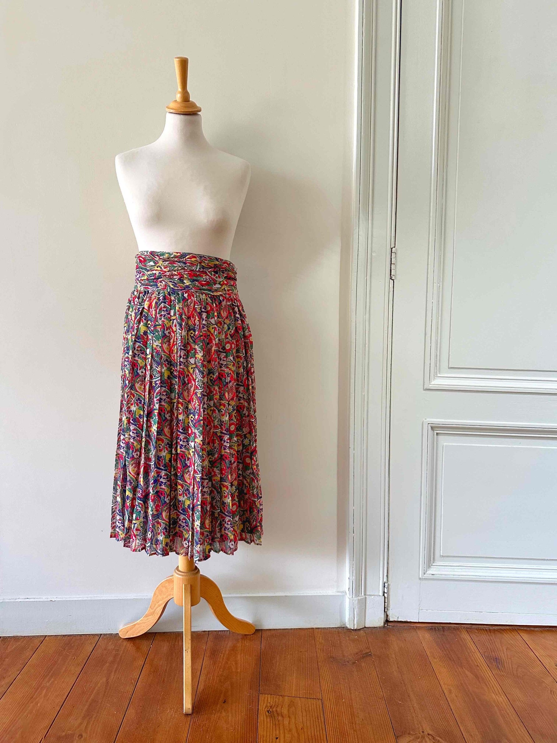 Prix unitaire parJupe plissée Cacharel, en acétate effet crêpe de soie, superbe imprimé fleurs, paisley et personnages multicolores, taille haute et large drapé plissée, rangée de boutons pour fermeture, fabriquée en France, taille 36 taille haute, portée ici sur un mannequin T36.