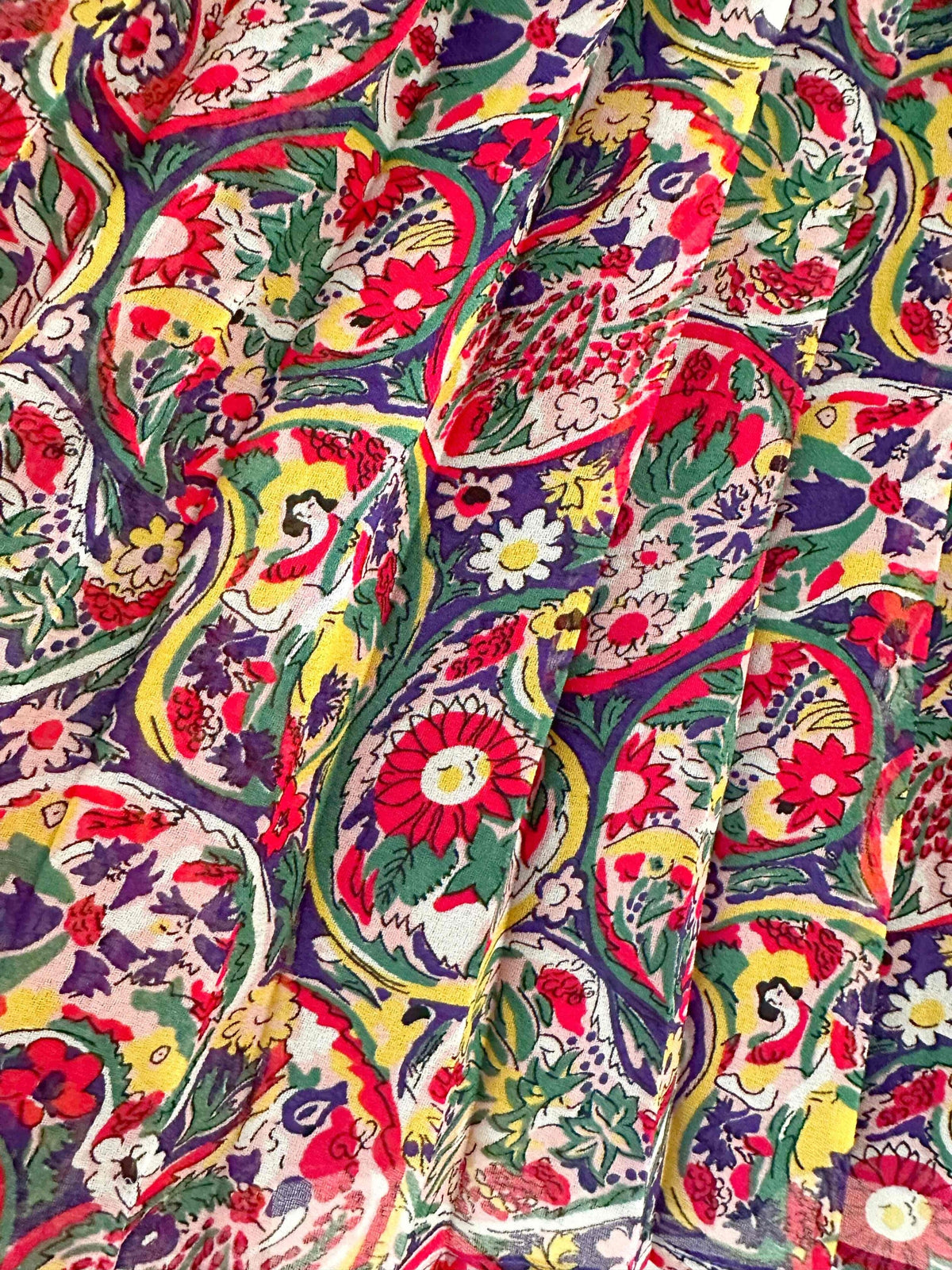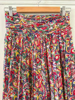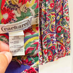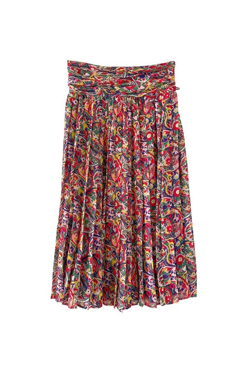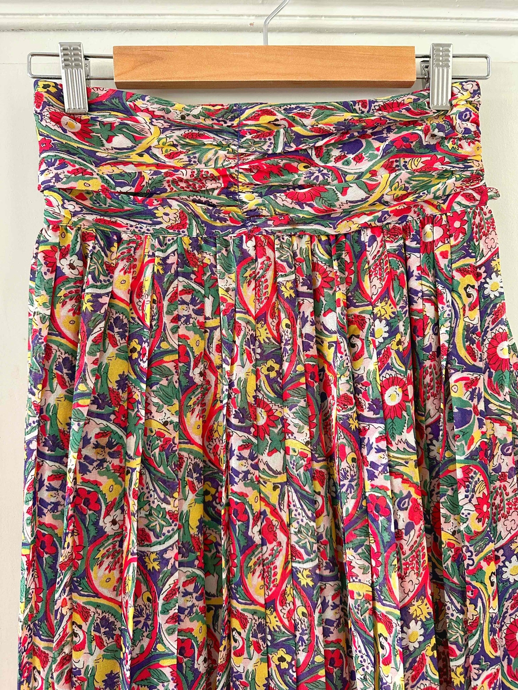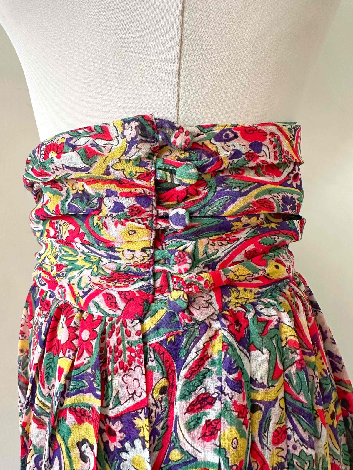 Prix unitaire parJupe plissée Cacharel, en acétate effet crêpe de soie, superbe imprimé fleurs, paisley et personnages multicolores, taille haute et large drapé plissée, rangée de boutons pour fermeture, fabriquée en France, taille 36 taille haute, portée ici sur un mannequin T36.