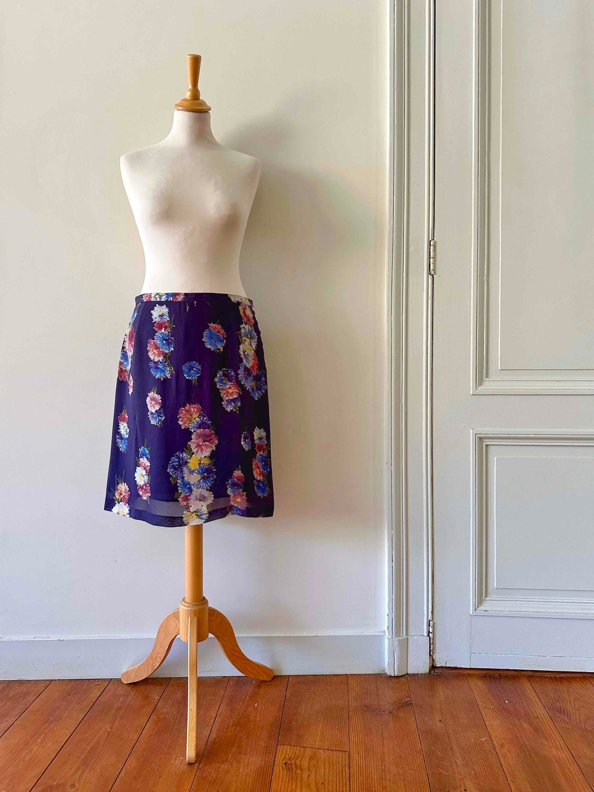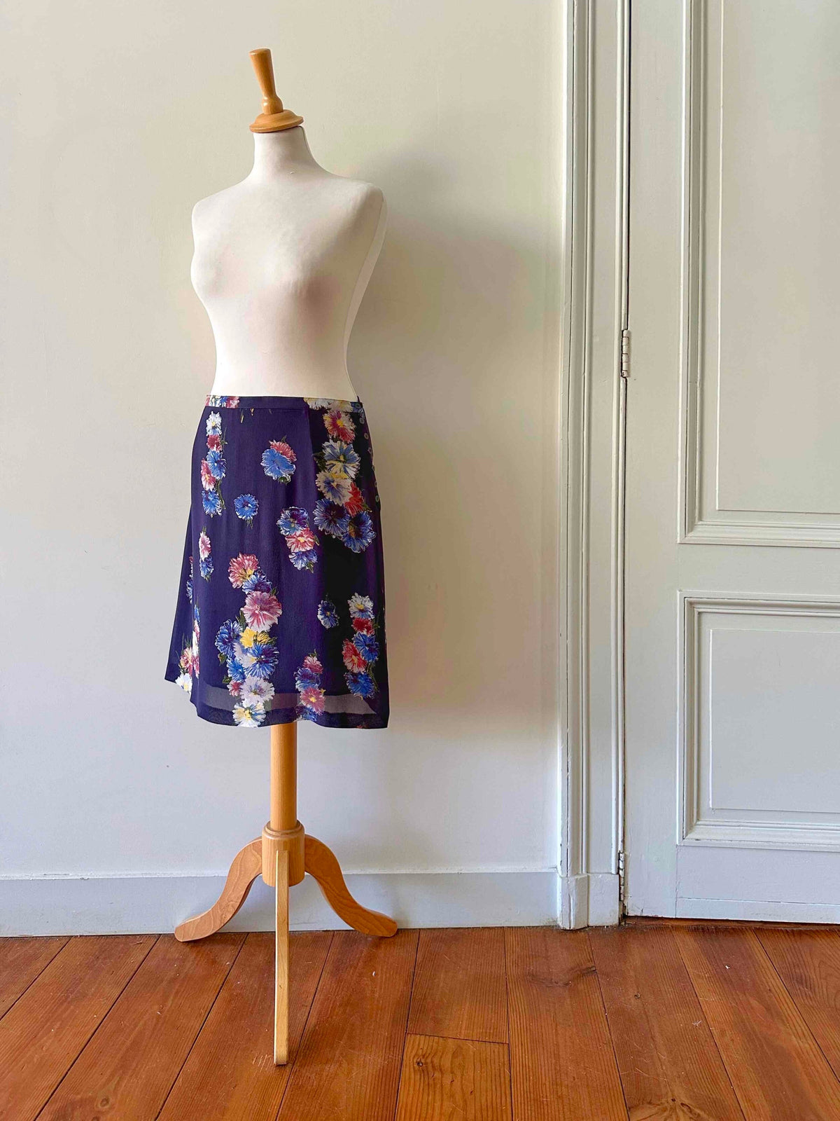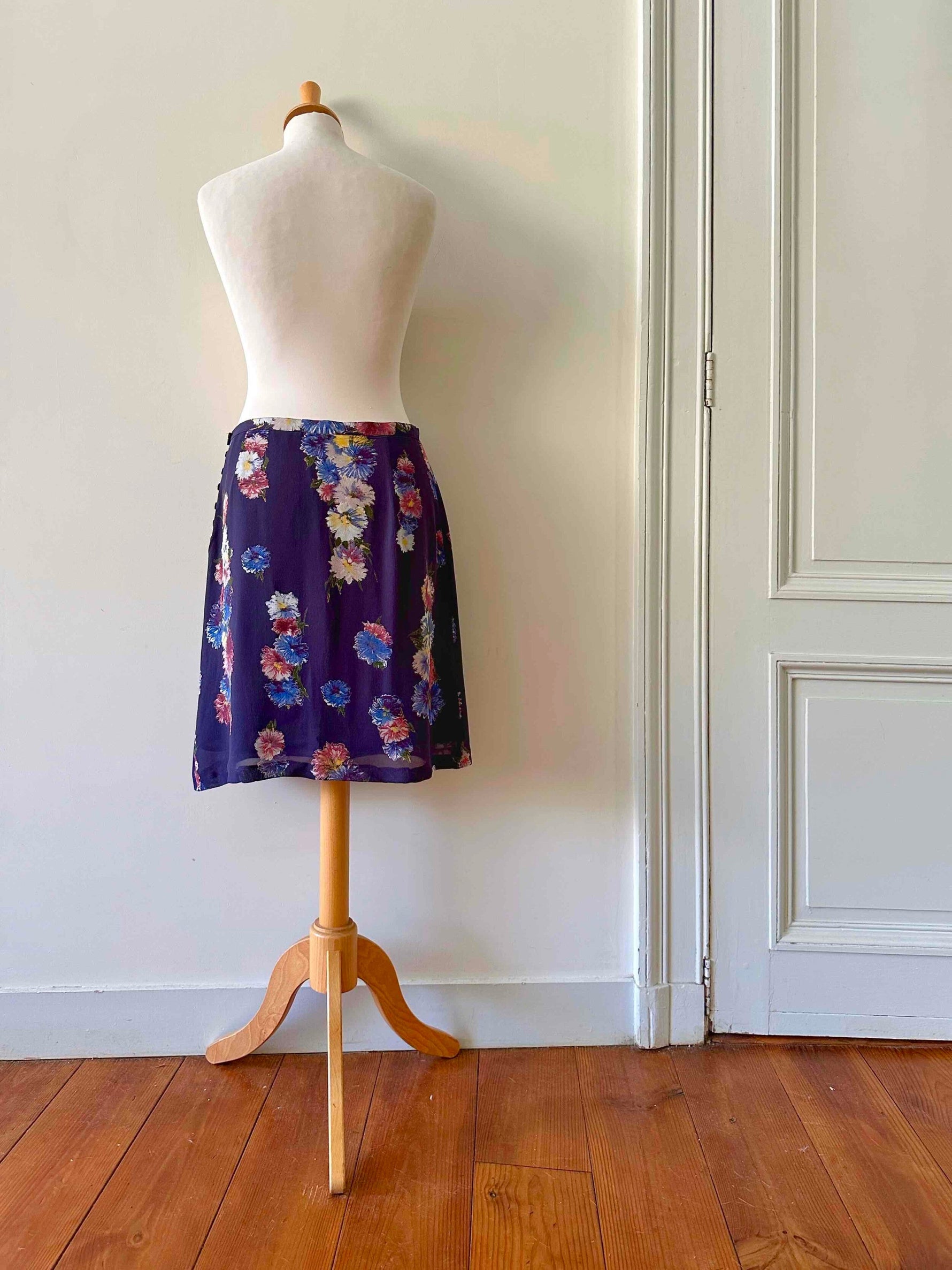 Prix unitaire parMini Jupe Cacharel en voile viscose violet foncé, imprimée fleurs marguerites multicolores, rangée de boutons à boutonner sur le côté, fabriquée en France. Taille 38 actuelle portée ici sur un mannequin T36, hanches 48 cm.