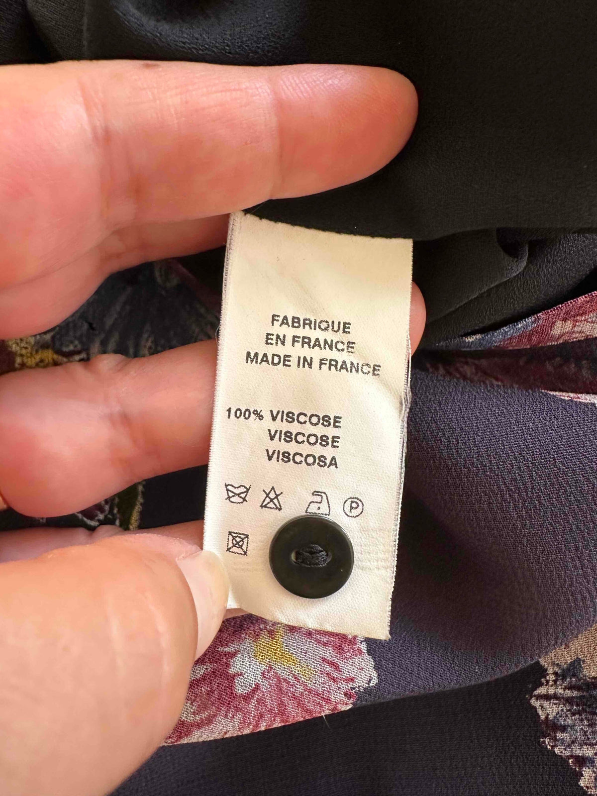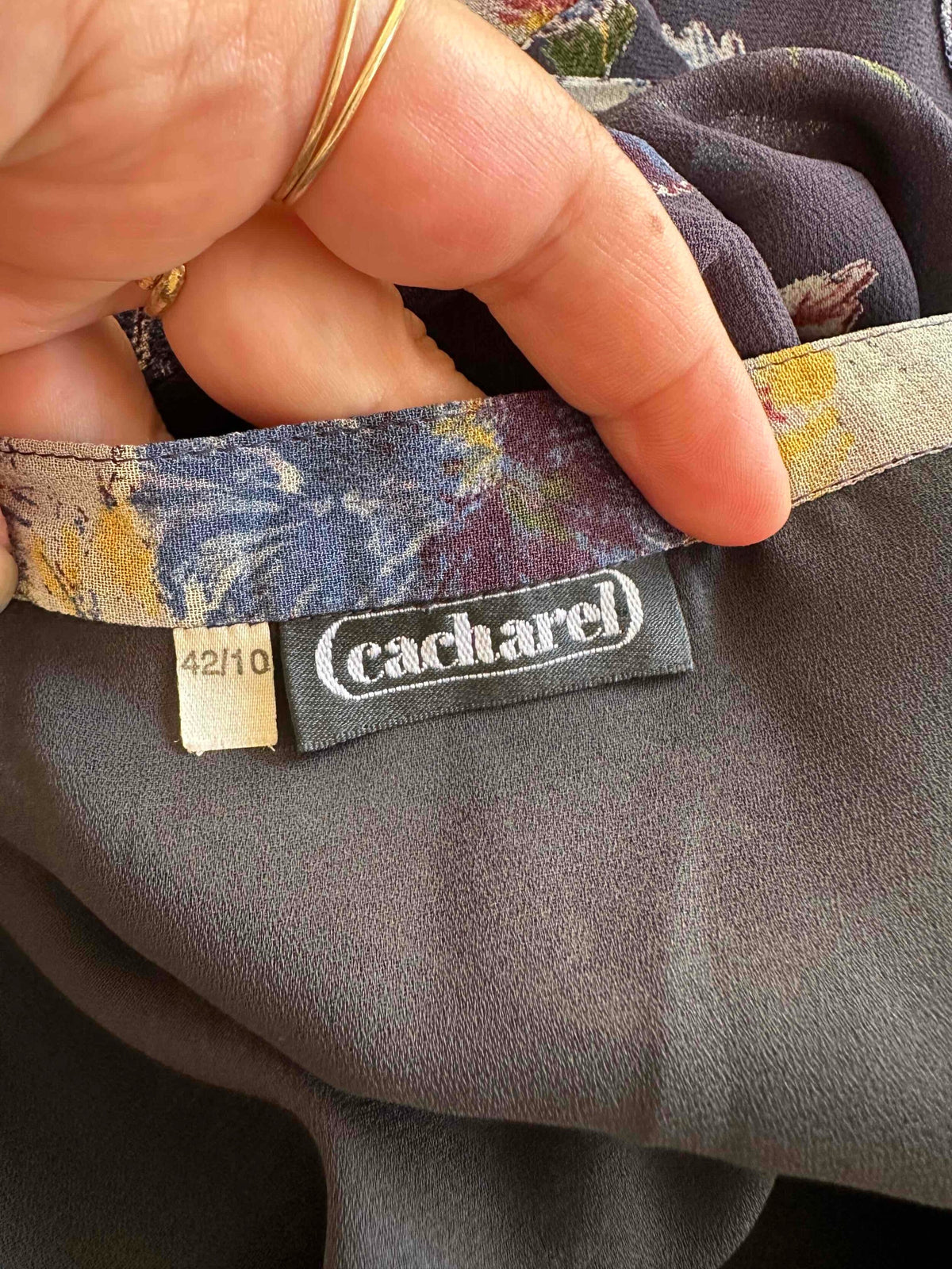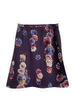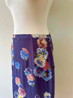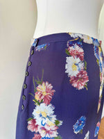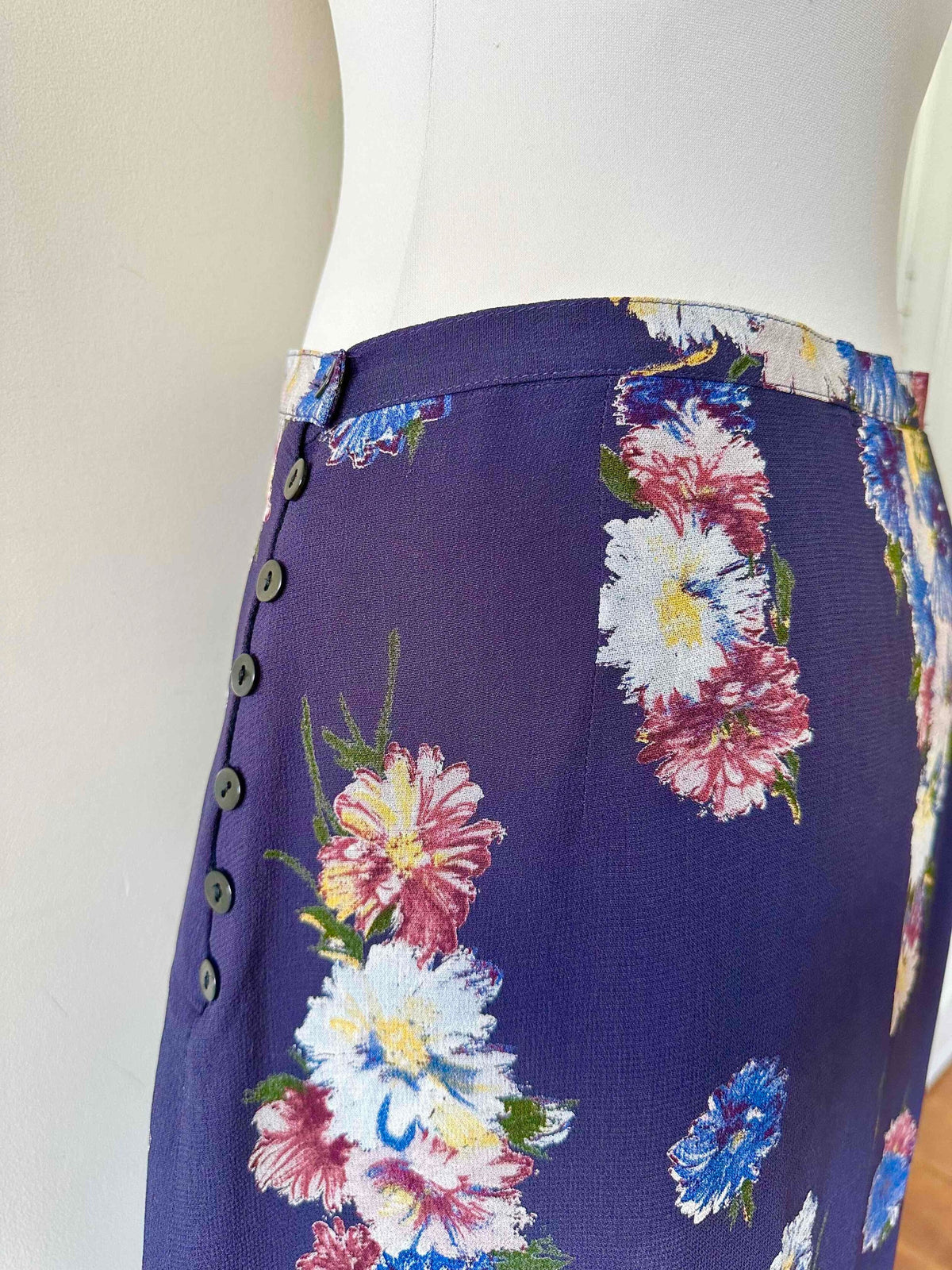 Prix unitaire parMini Jupe Cacharel en voile viscose violet foncé, imprimée fleurs marguerites multicolores, rangée de boutons à boutonner sur le côté, fabriquée en France. Taille 38 actuelle portée ici sur un mannequin T36, hanches 48 cm.