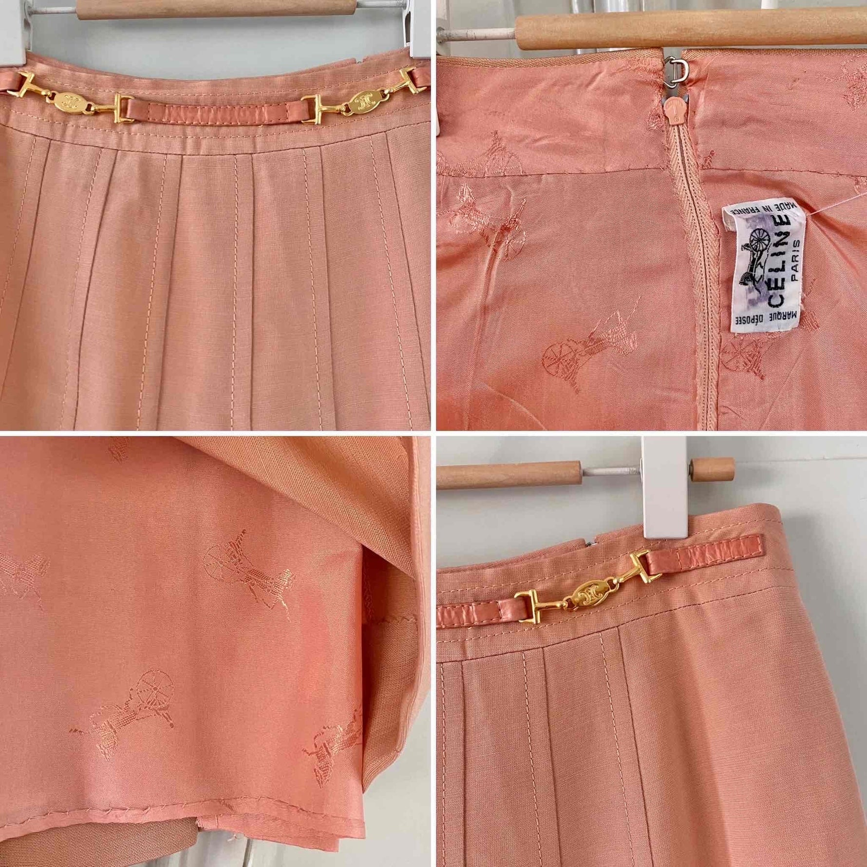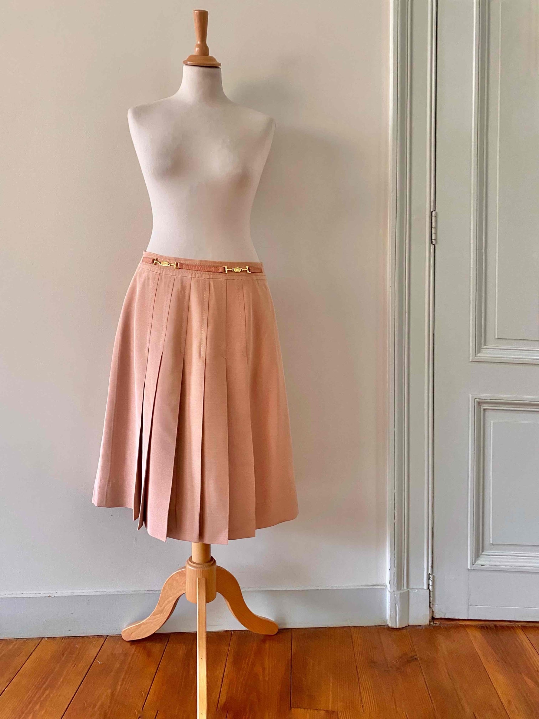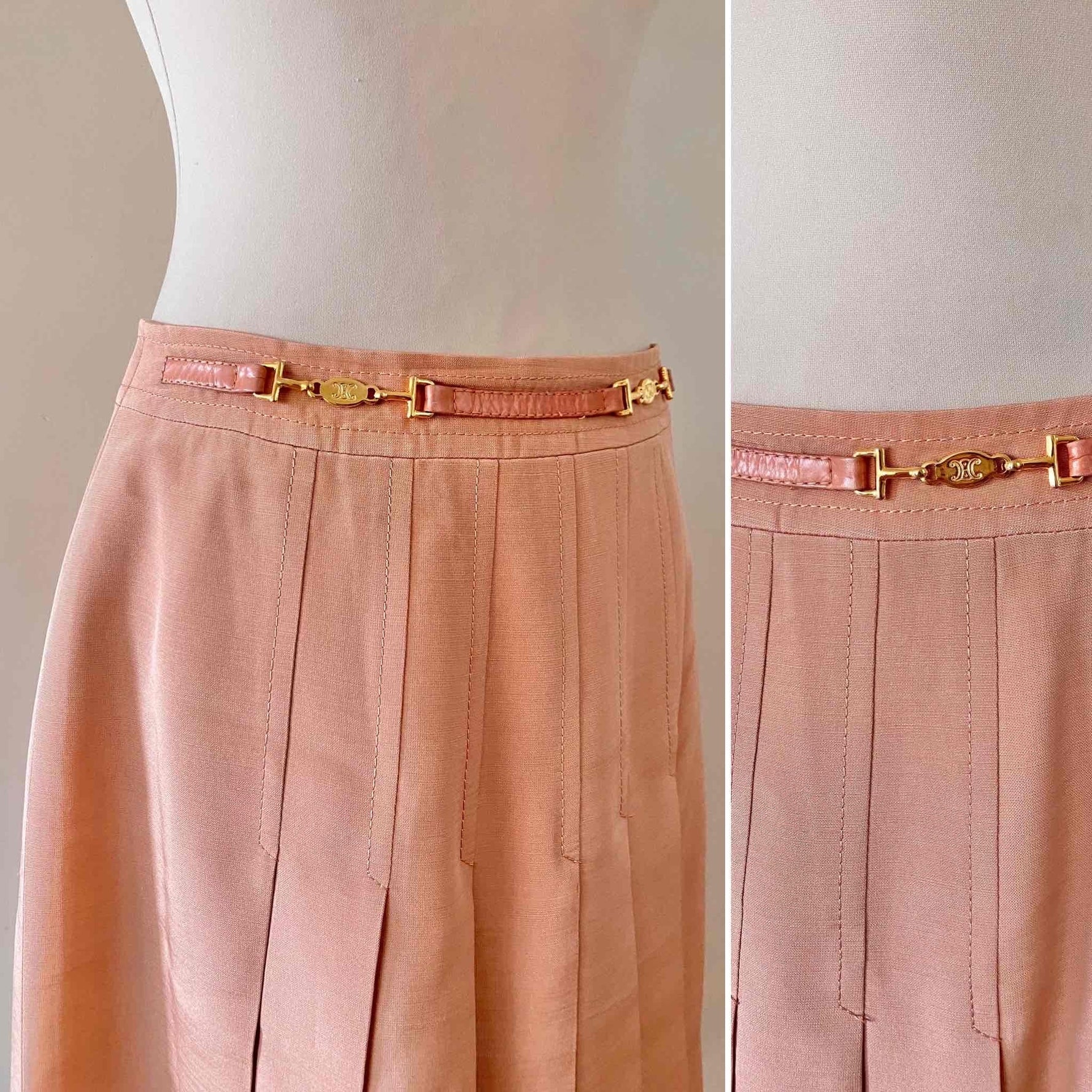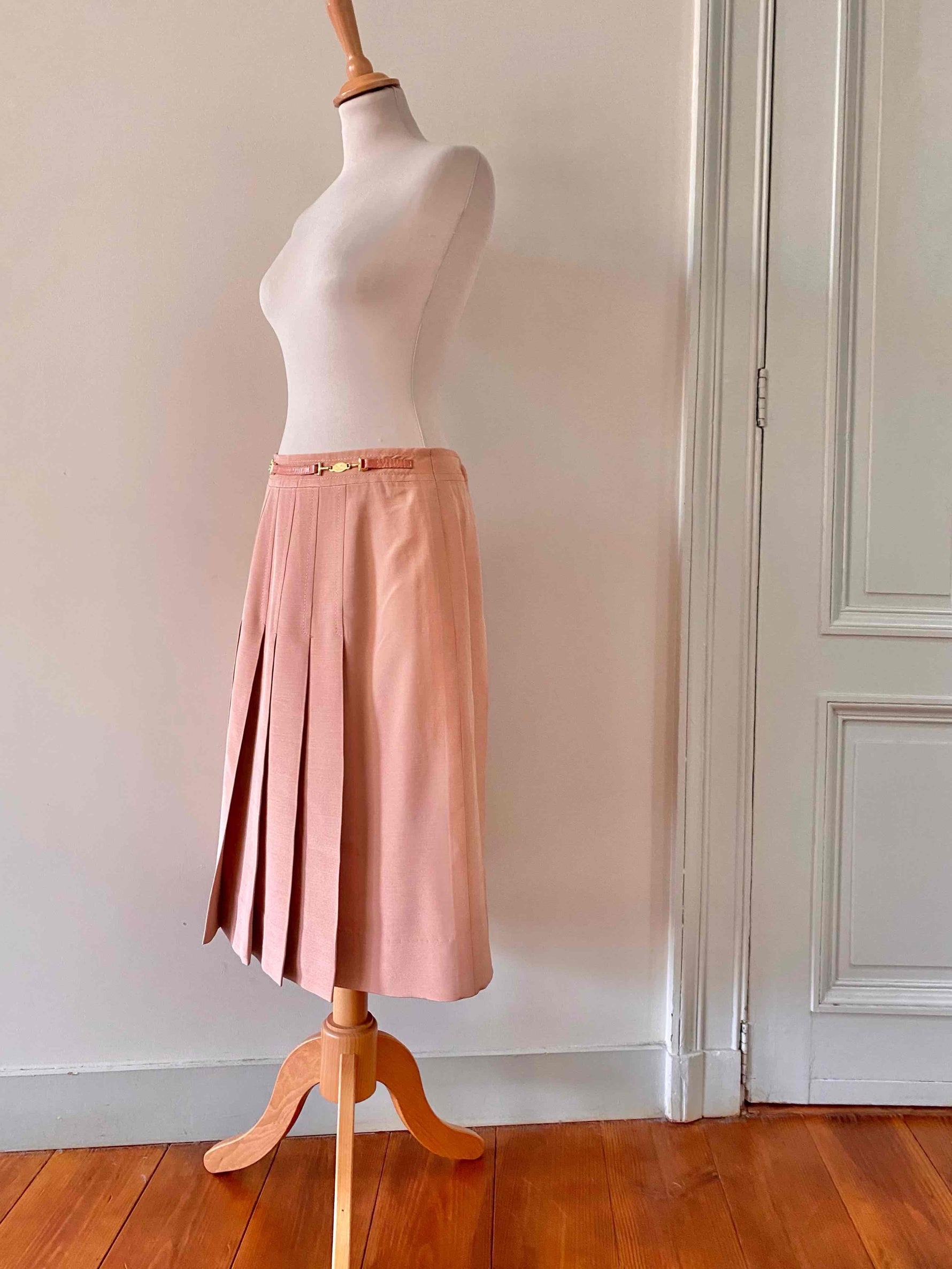 Prix unitaire parJupe Céline en soie rose poudré, plissée longueur genoux, taille haute avec bande de cuir ton sur ton et médaillon gravés monogrammés double C triomphe, doublure monogrammée « calèche », fabriquée en France, fin 70’s, taille 38 portée ici sur les hanches d’un mannequin T36 et ouverte sur une personne T40, hanches 48cm.