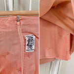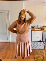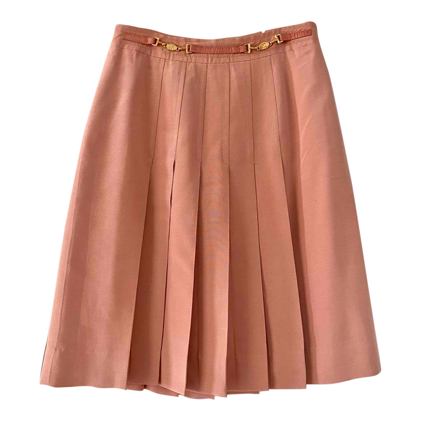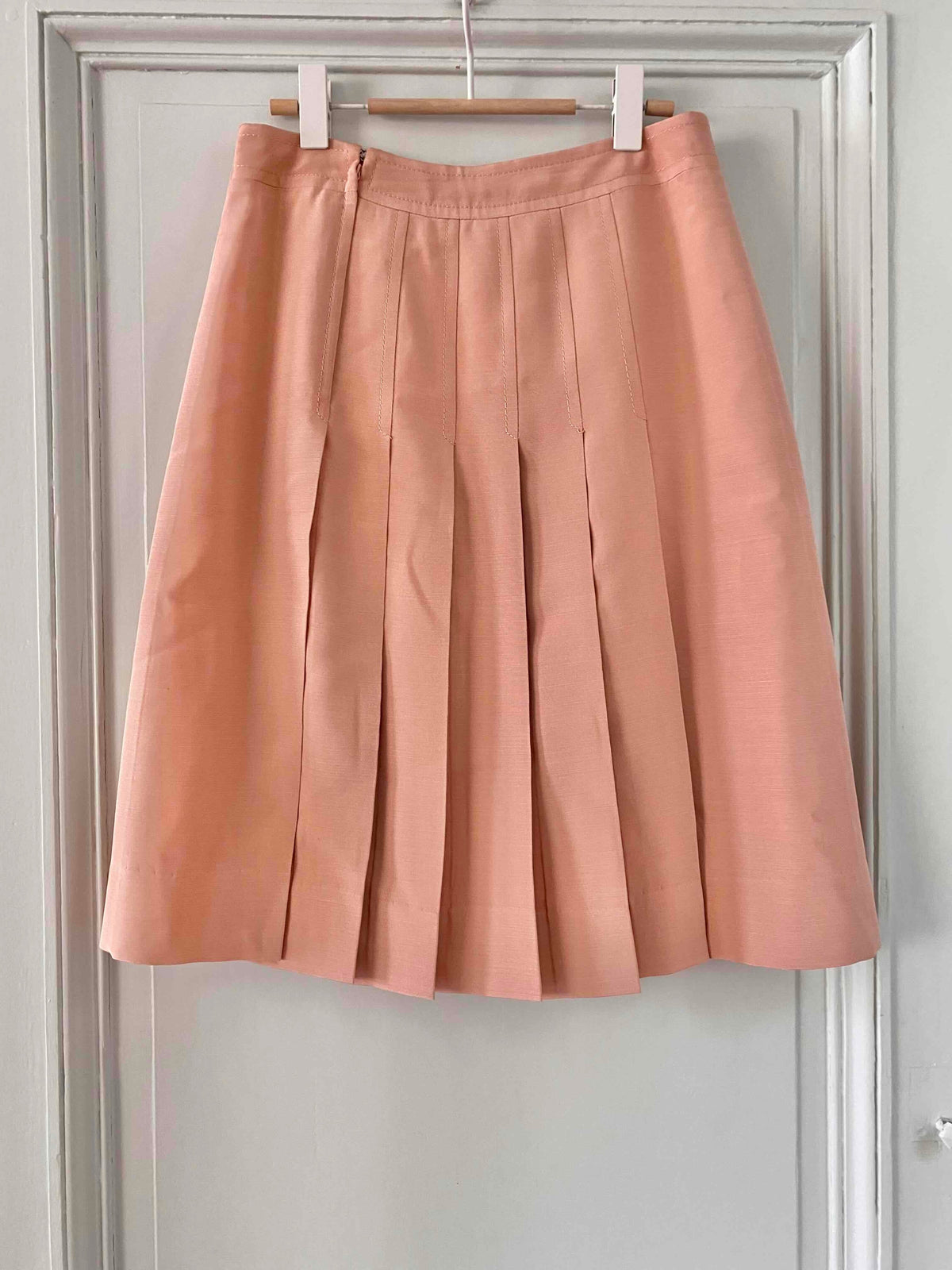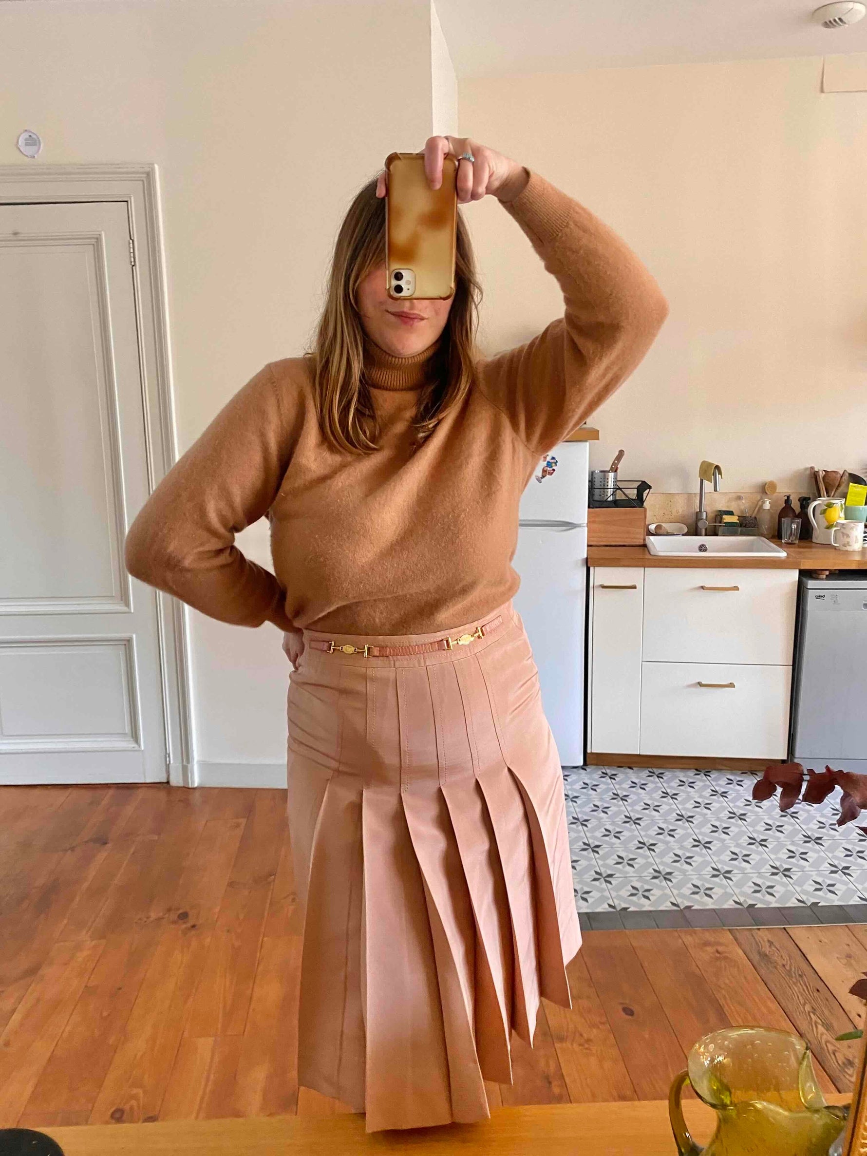 Prix unitaire parJupe Céline en soie rose poudré, plissée longueur genoux, taille haute avec bande de cuir ton sur ton et médaillon gravés monogrammés double C triomphe, doublure monogrammée « calèche », fabriquée en France, fin 70’s, taille 38 portée ici sur les hanches d’un mannequin T36 et ouverte sur une personne T40, hanches 48cm.