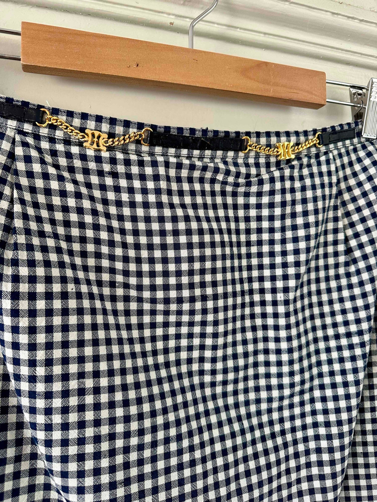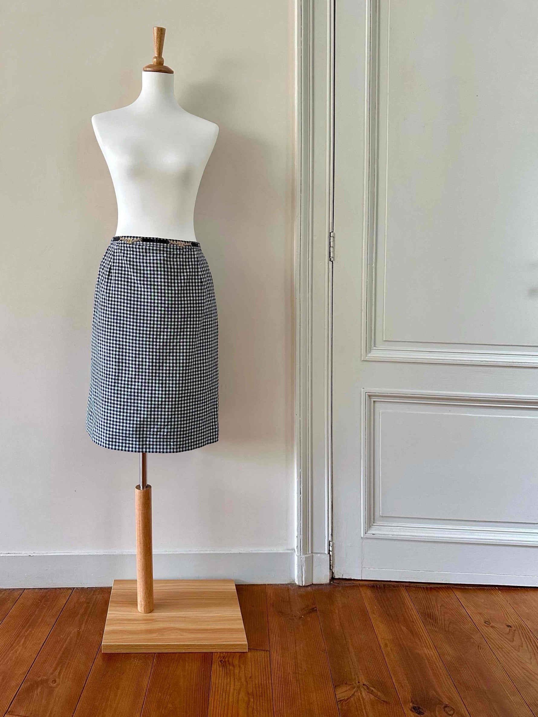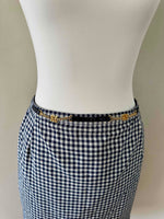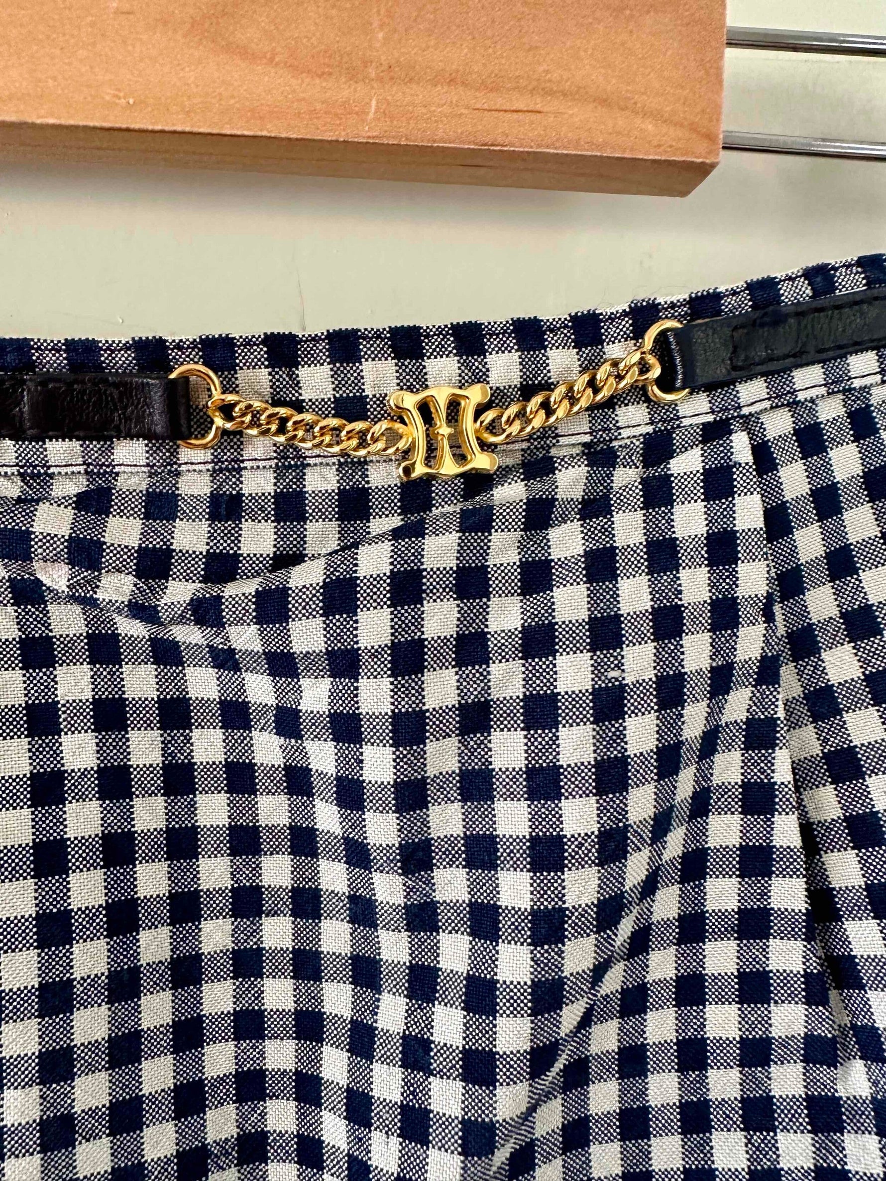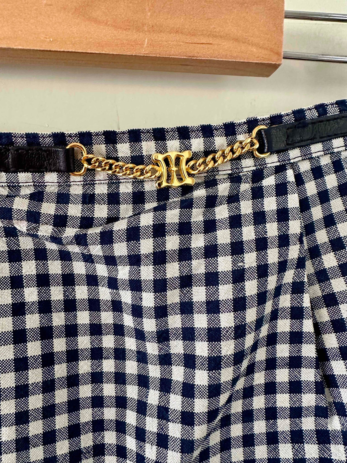 Jupe vichy Celine, en soie carreaux vichy bleus marines et blancs, taille haute avec détails de cuir, chaînes et signes Triomphe en métal doré, fabriquée en France, taille 38 portée ici sur un mannequin T36. Hanches 48cm.