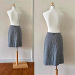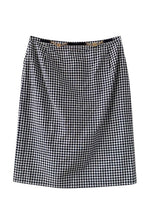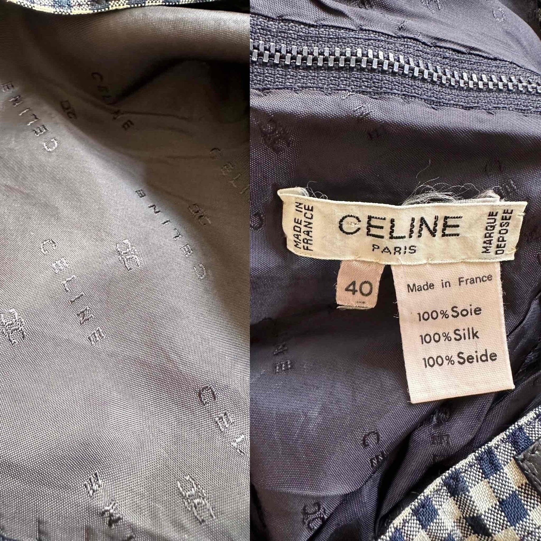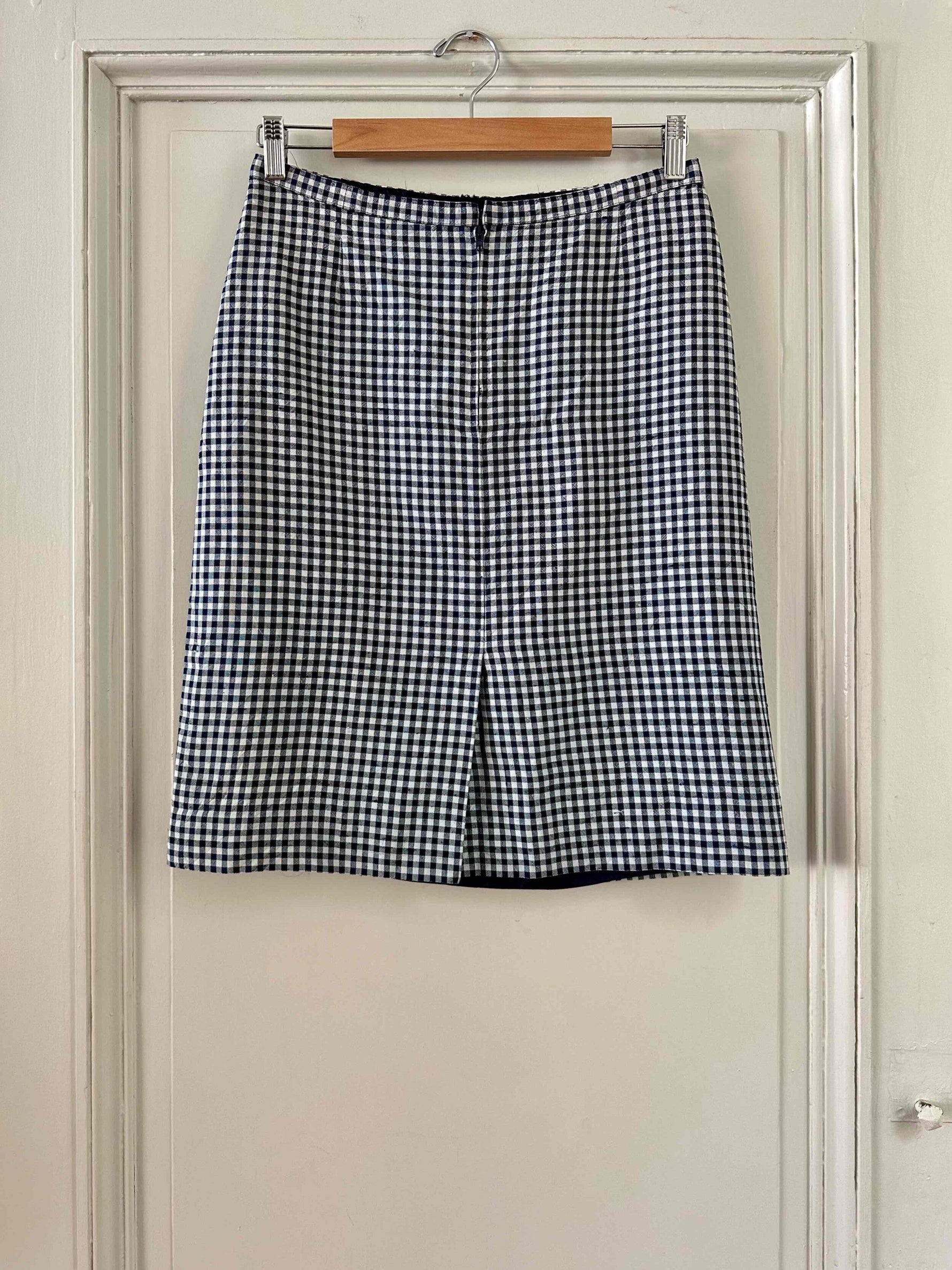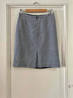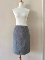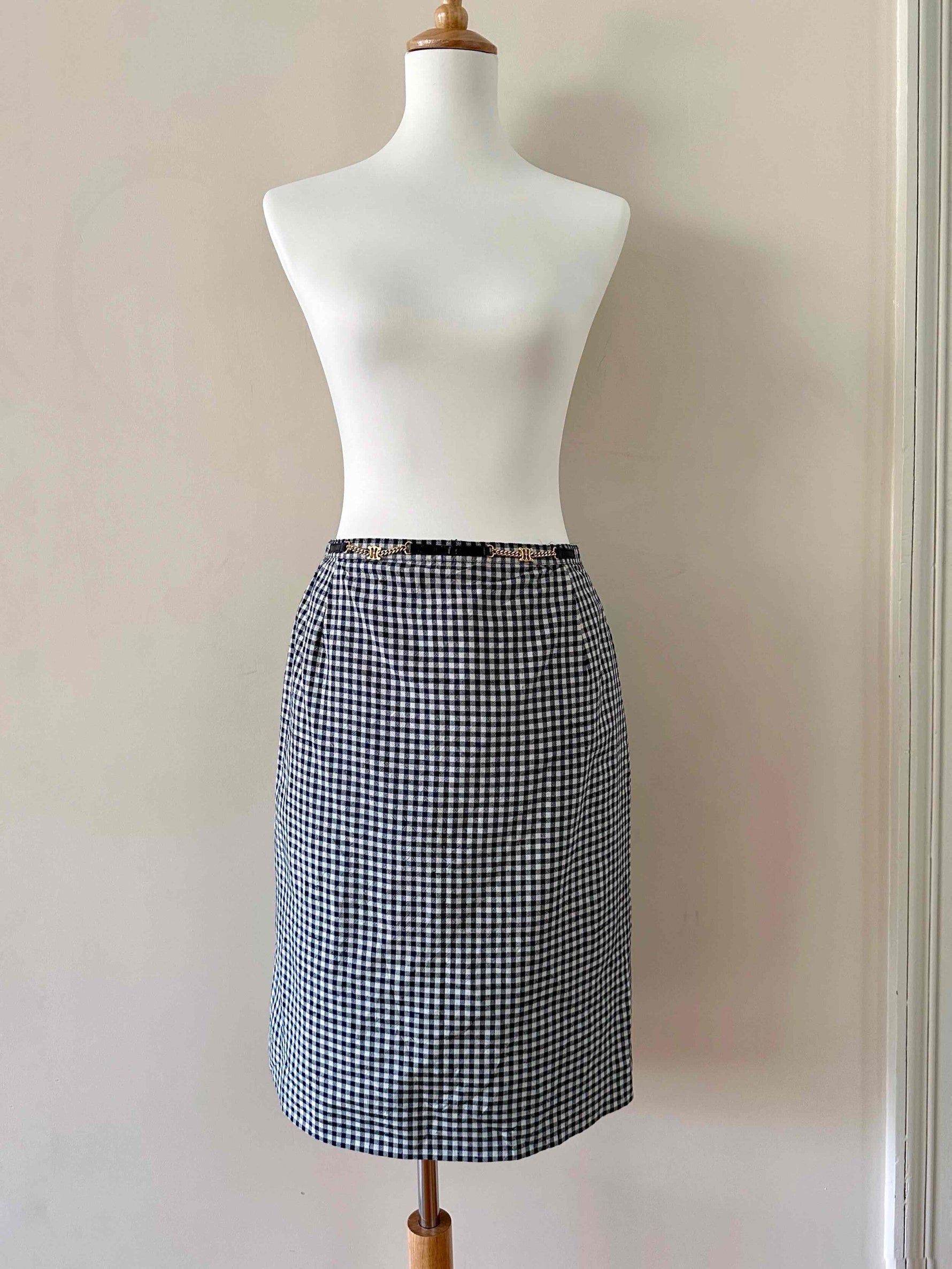 Jupe vichy Celine, en soie carreaux vichy bleus marines et blancs, taille haute avec détails de cuir, chaînes et signes Triomphe en métal doré, fabriquée en France, taille 38 portée ici sur un mannequin T36. Hanches 48cm.
