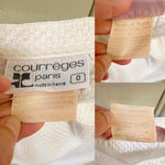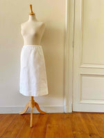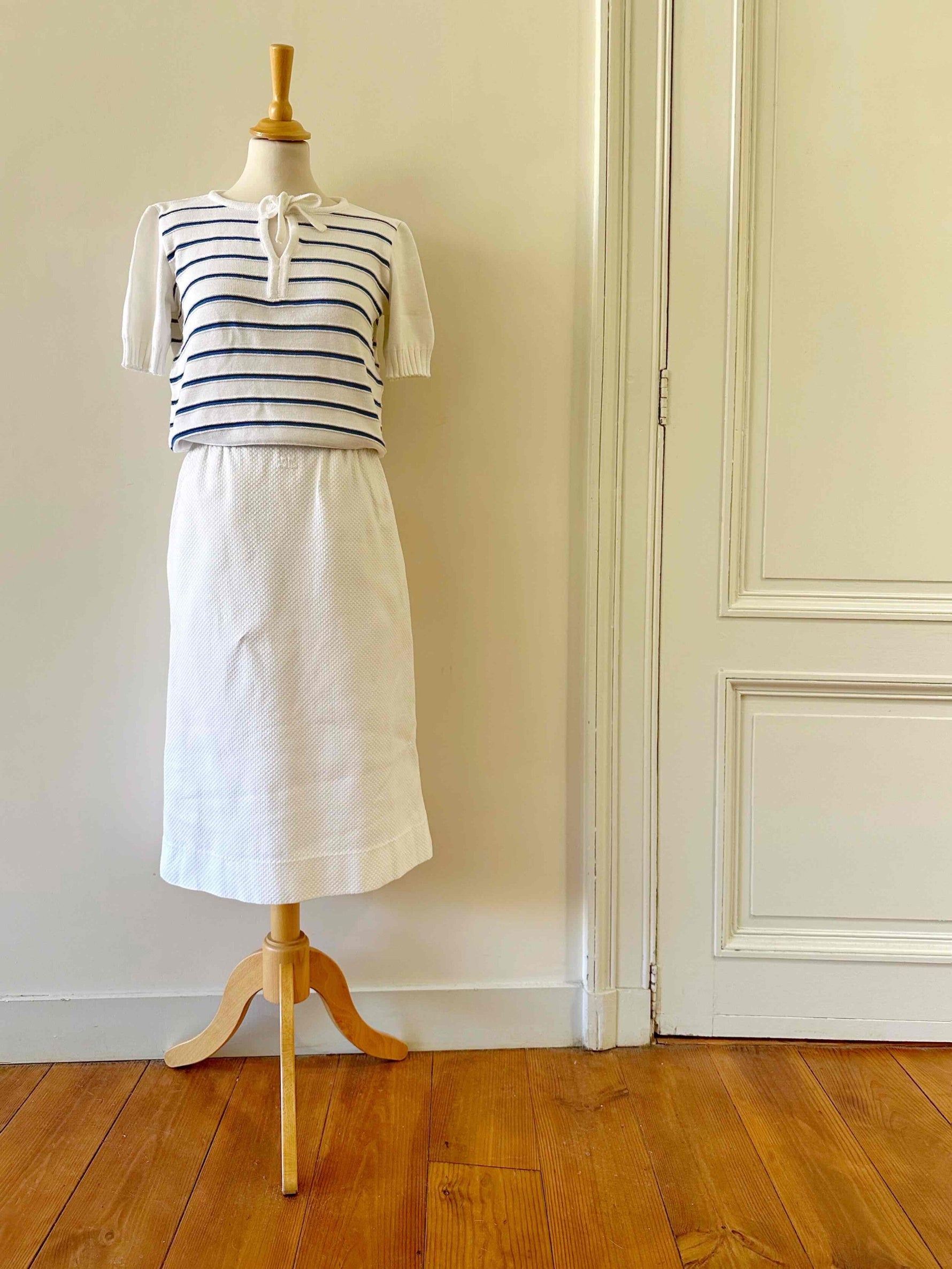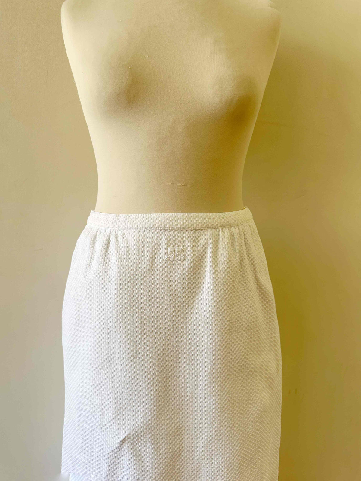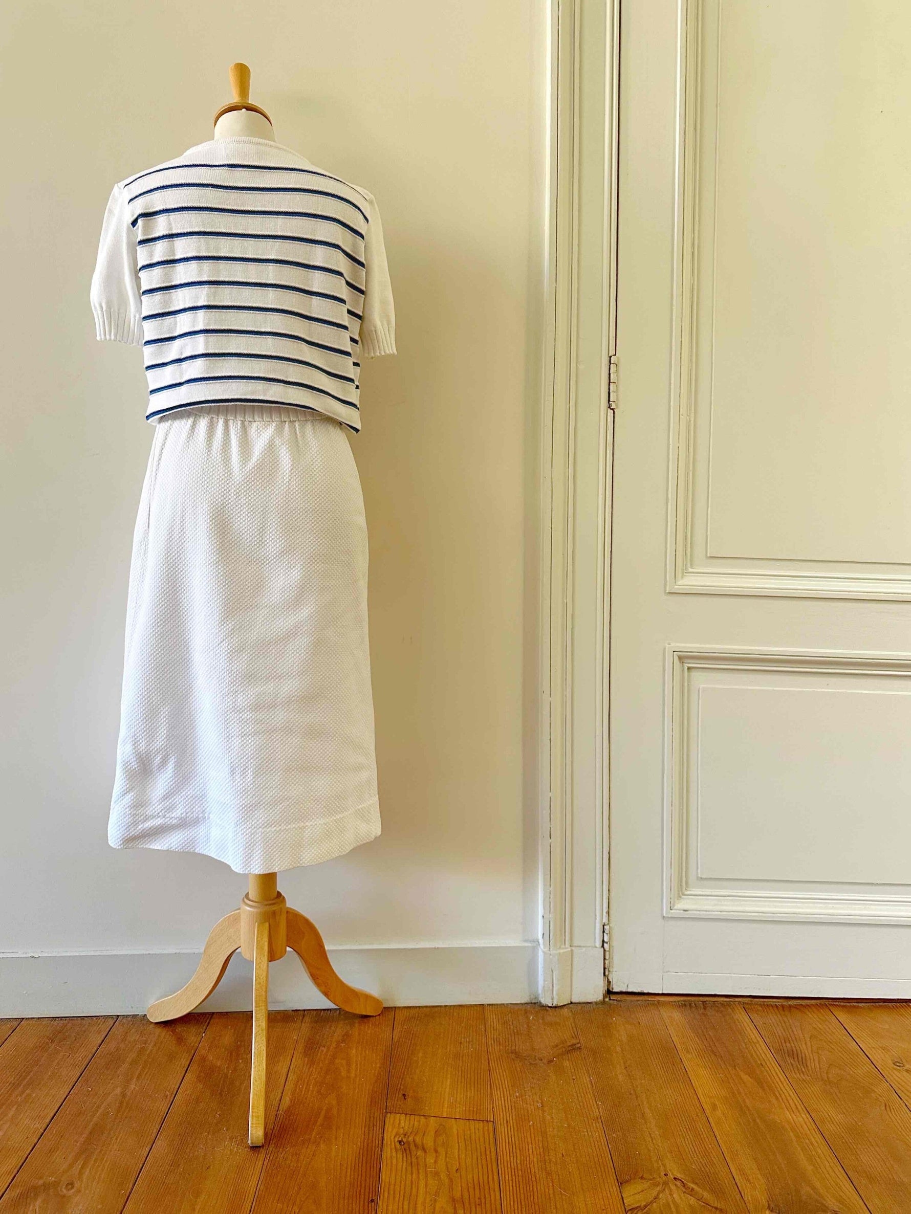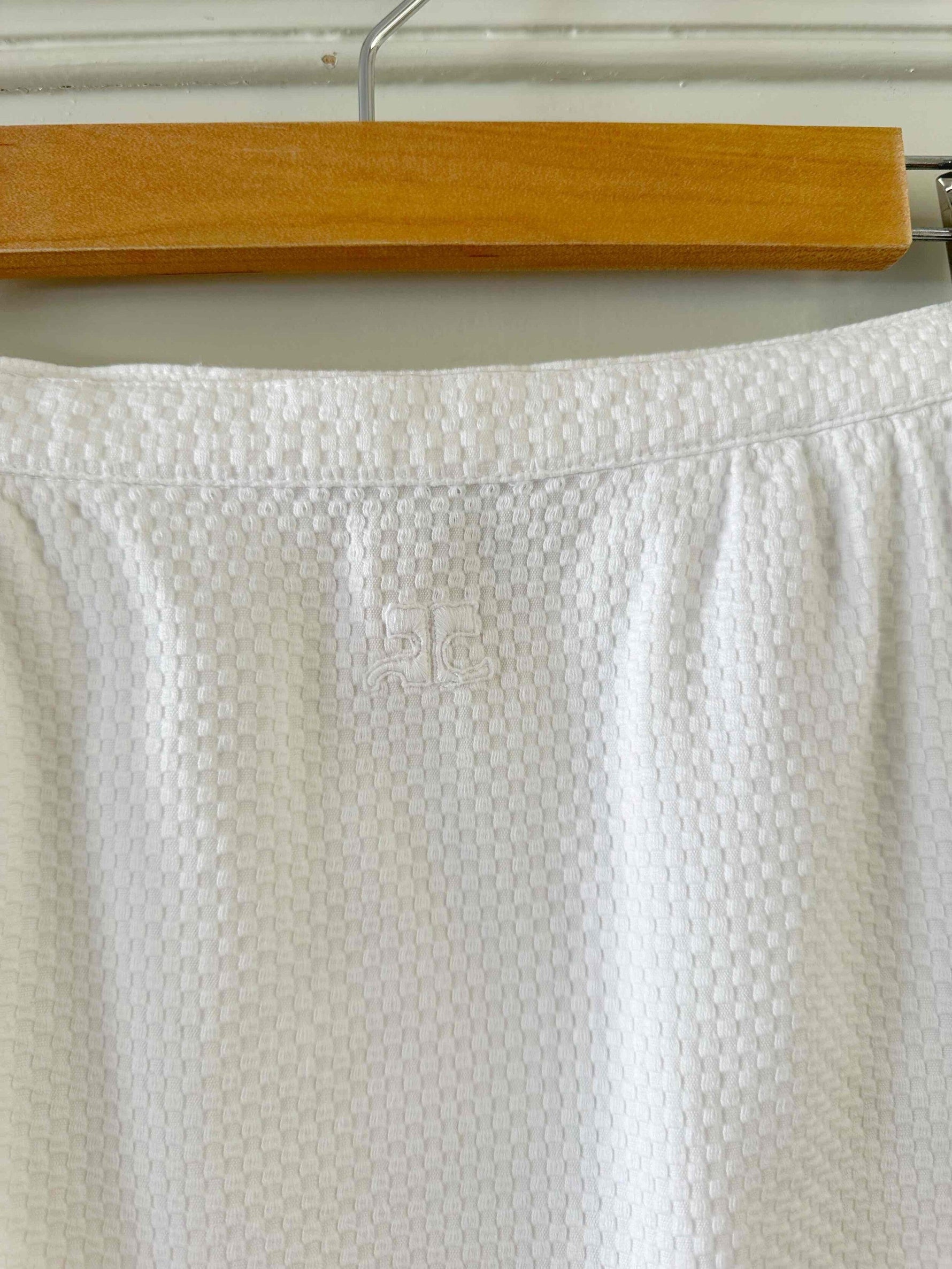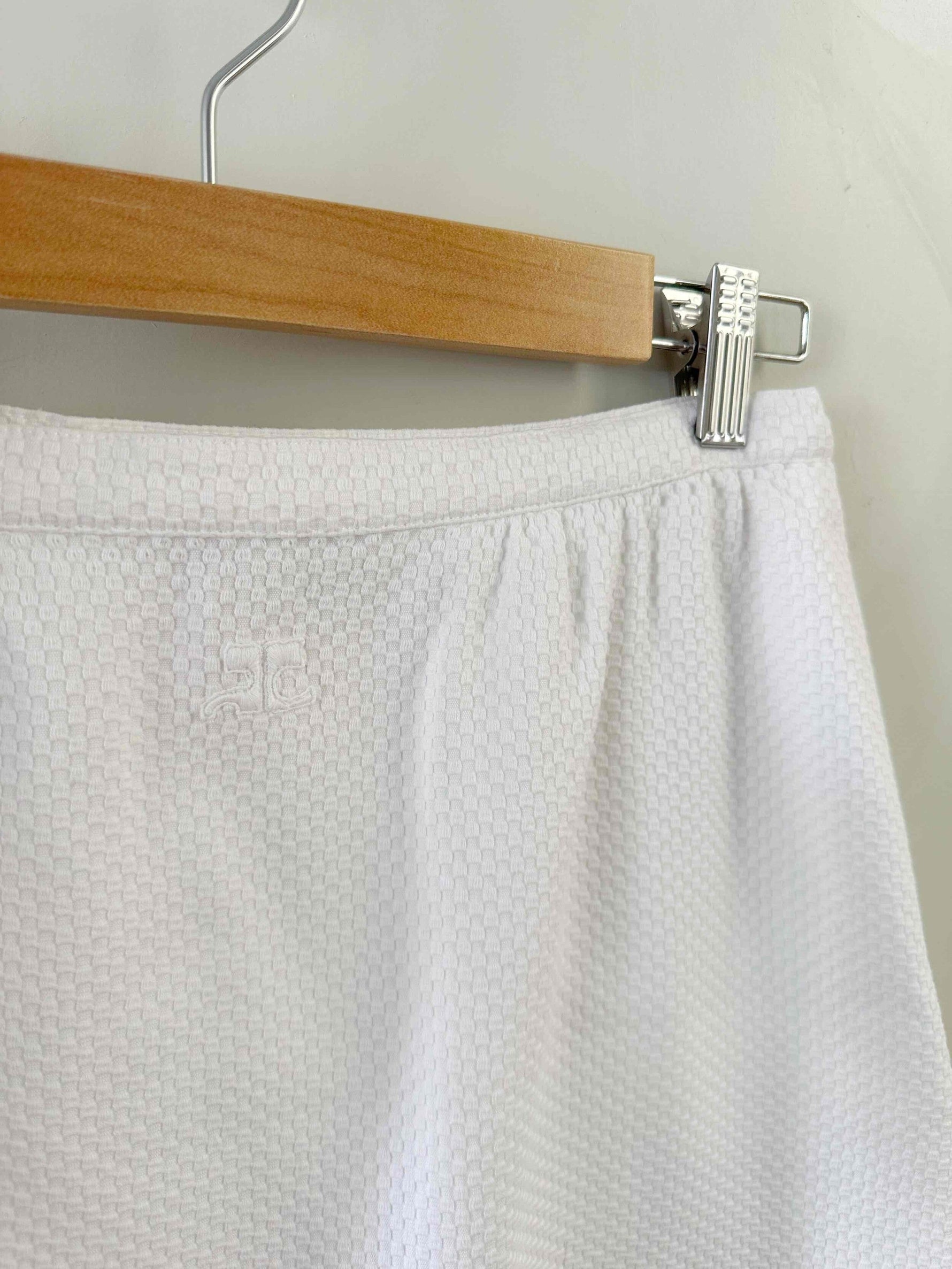 Jupe midi Courreges, en 100% piqué de coton nid d’abeille blanc, logo brodé devant, fermeture éclair et poches côtés, fabriquée en France, taille 36 portée ici sur un mannequin T36.