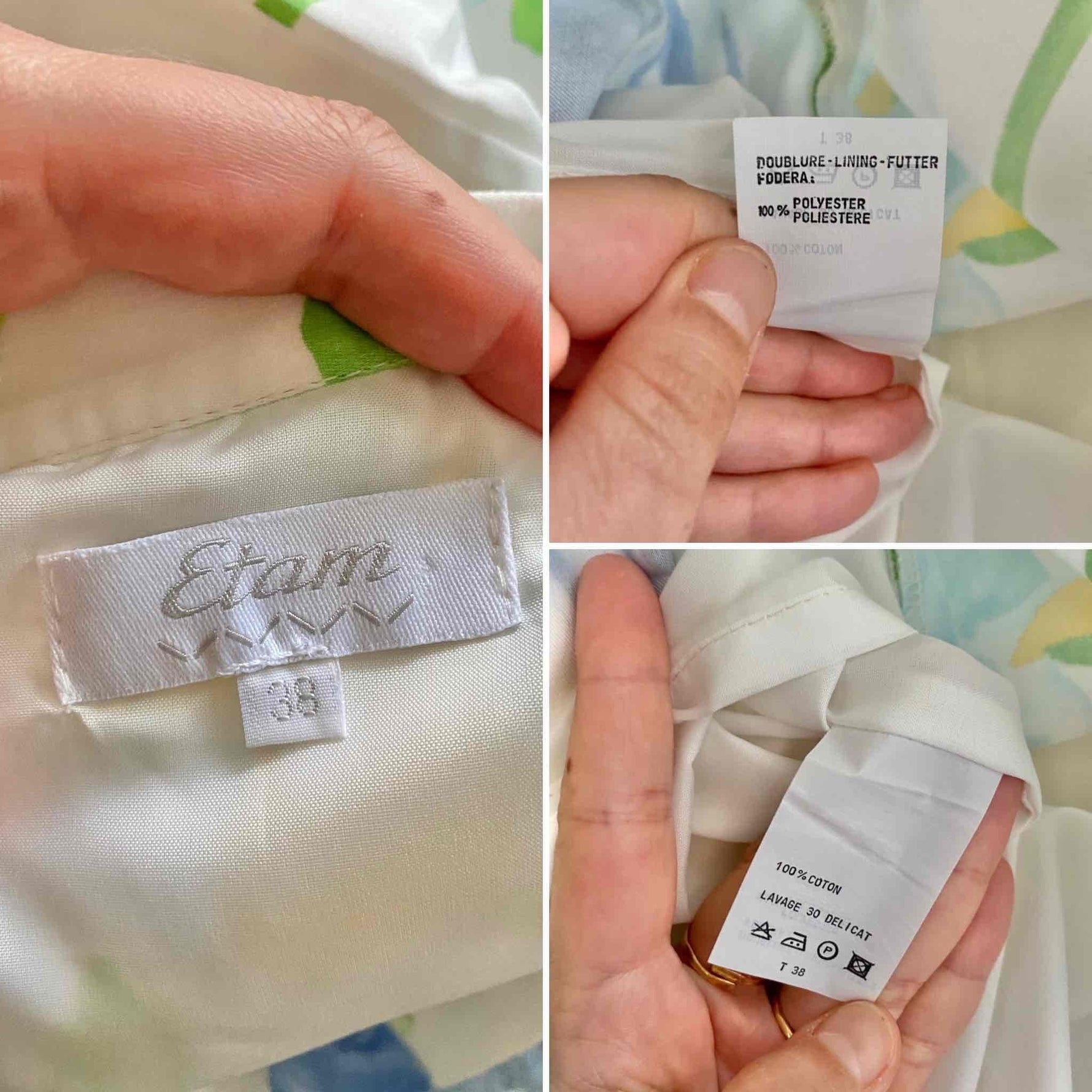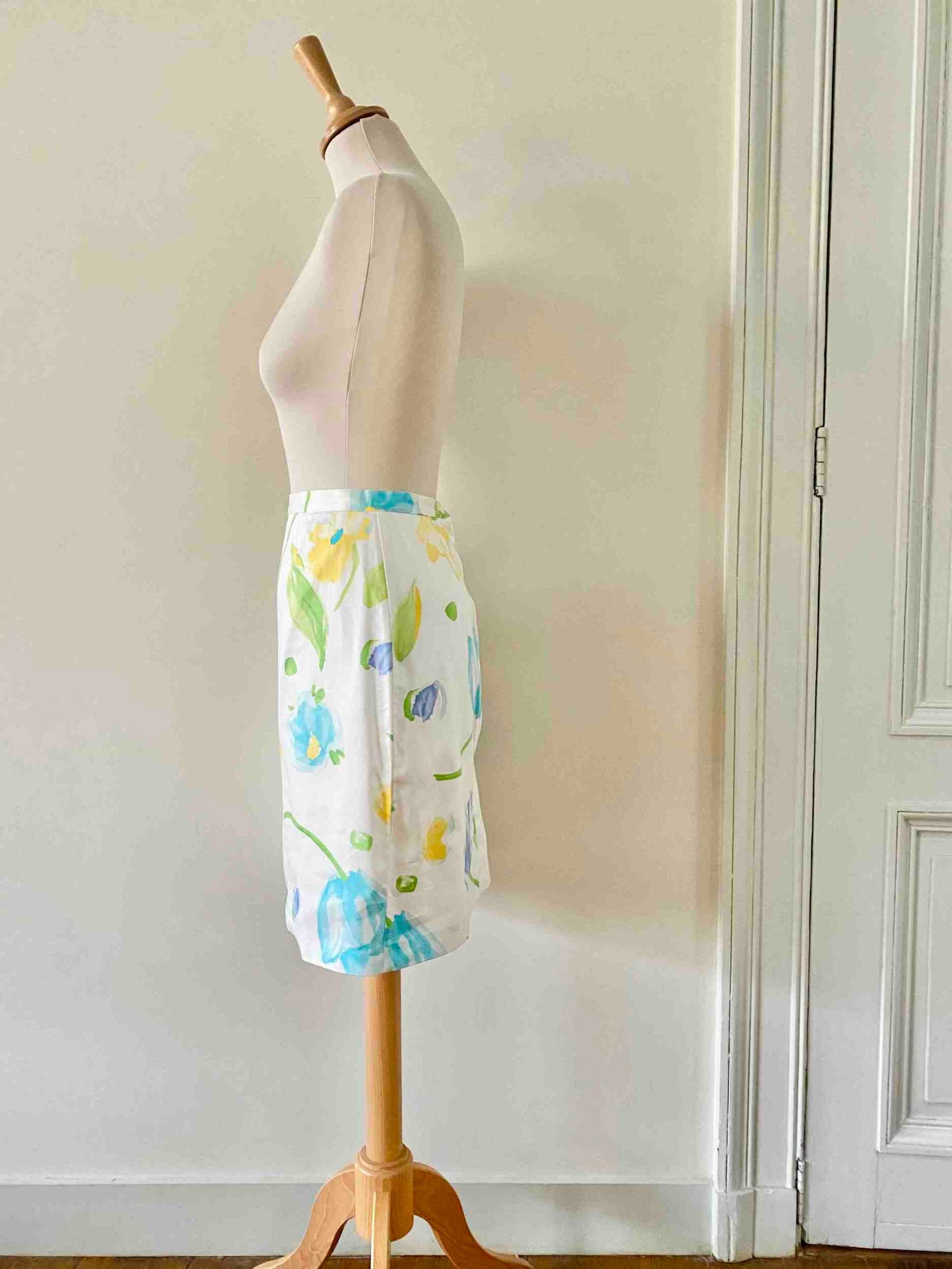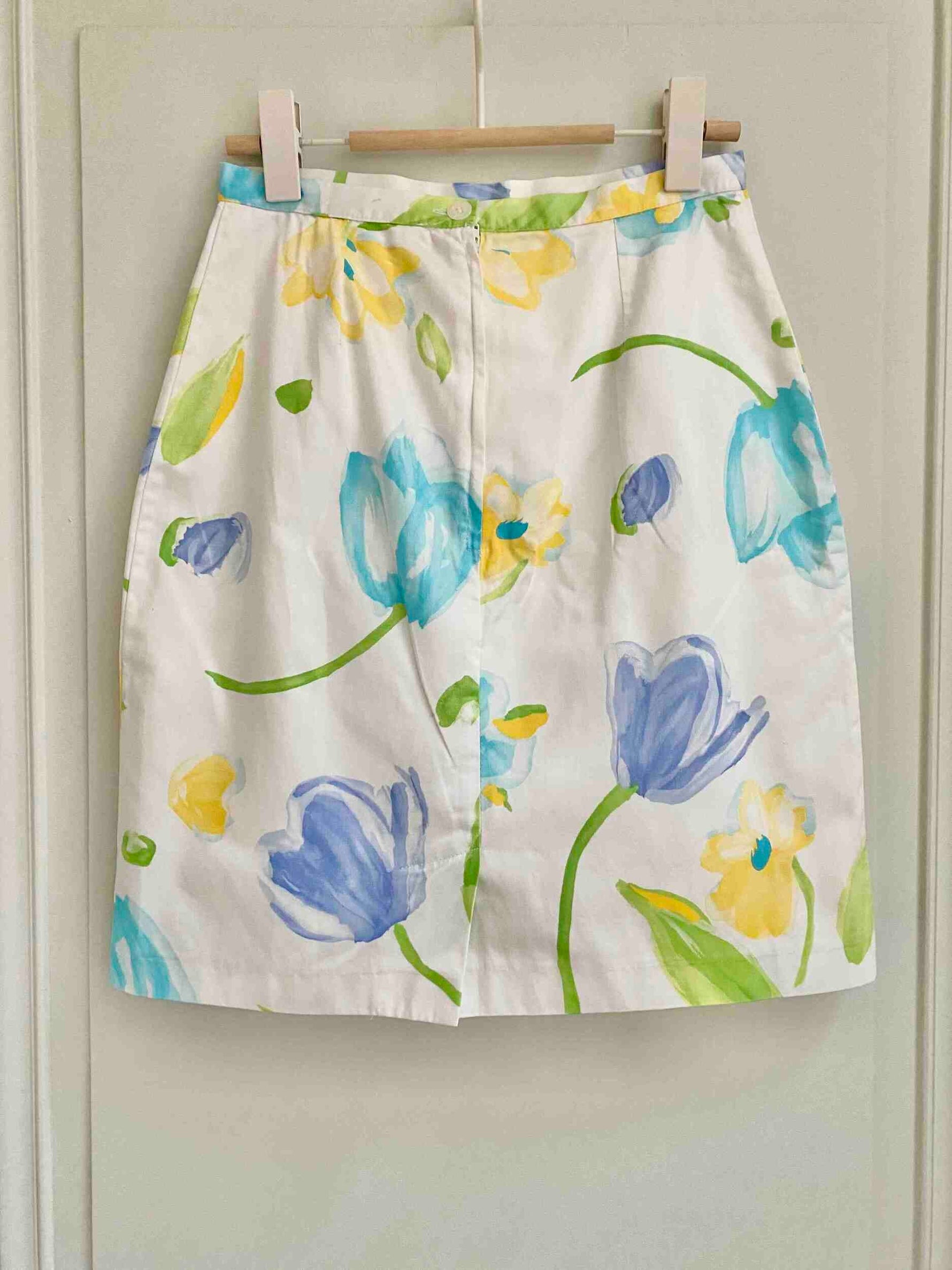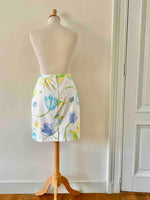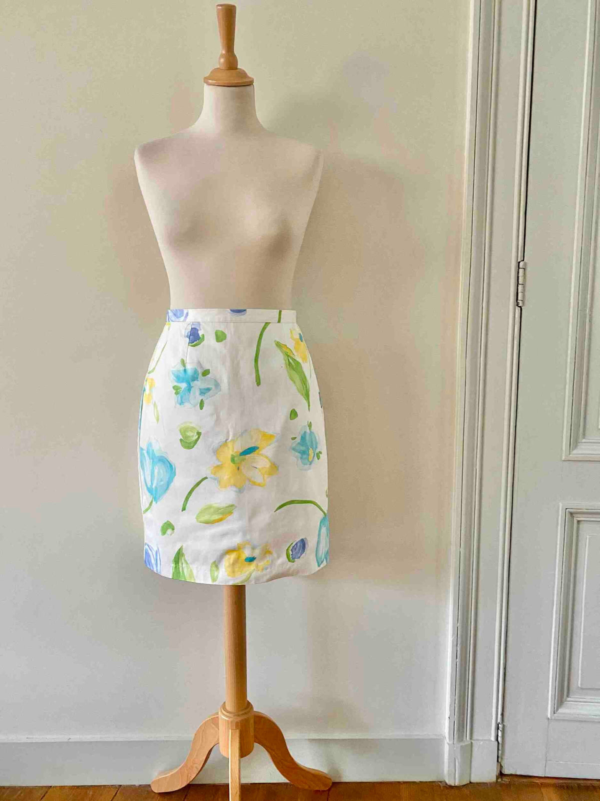 Mini Jupe à Fleurs en coton blancs fleurs bleues, jaunes, turquoises et vertes, taille haute, Etam années 80’s, fabriquée en France.