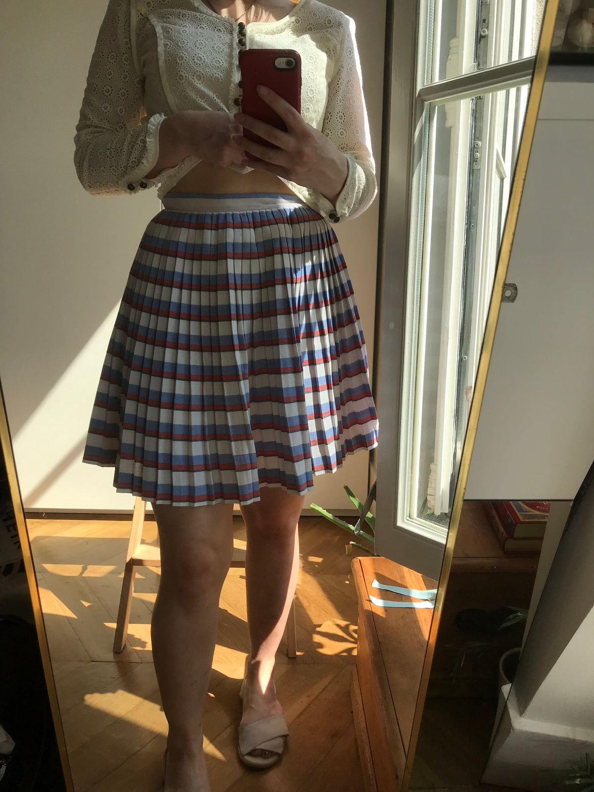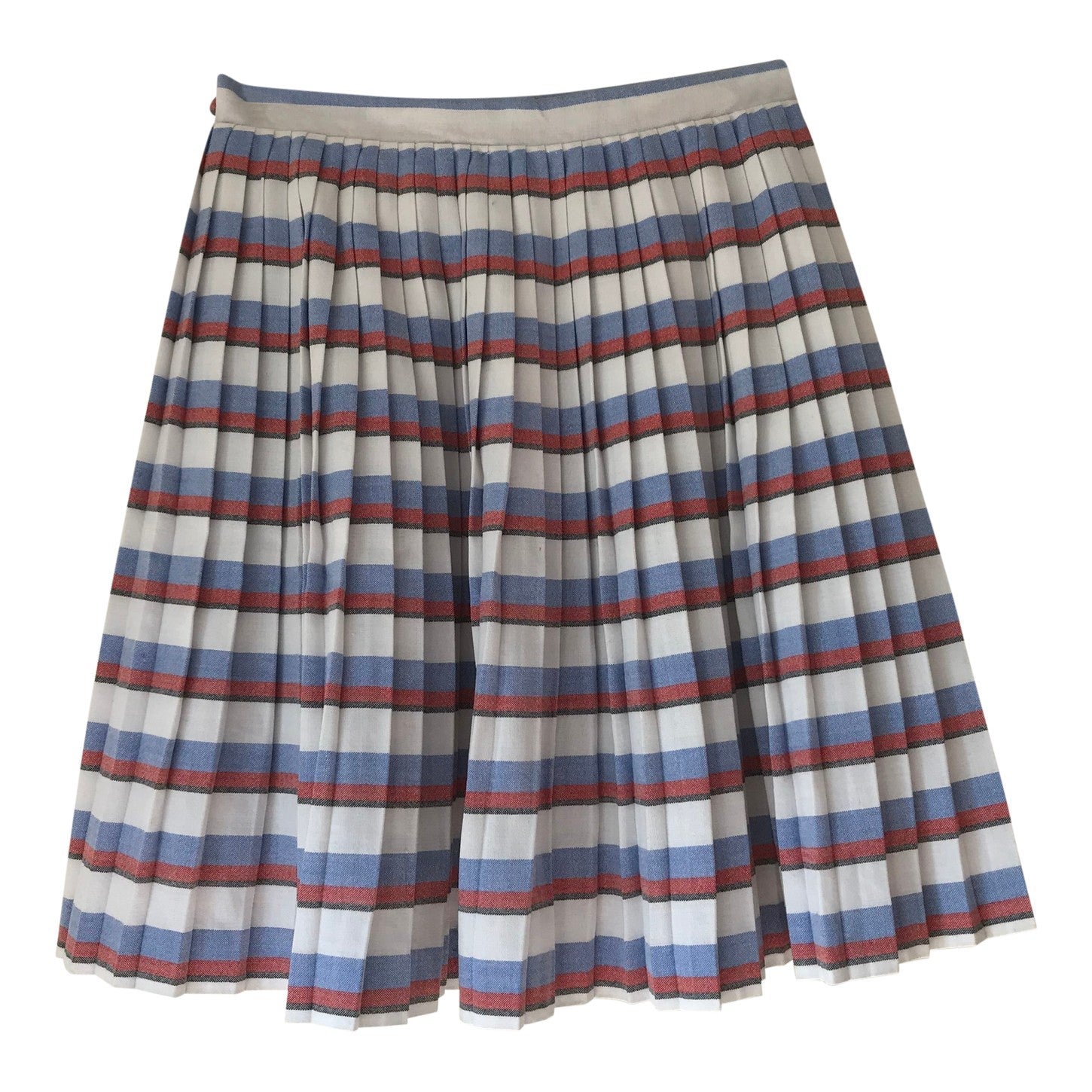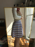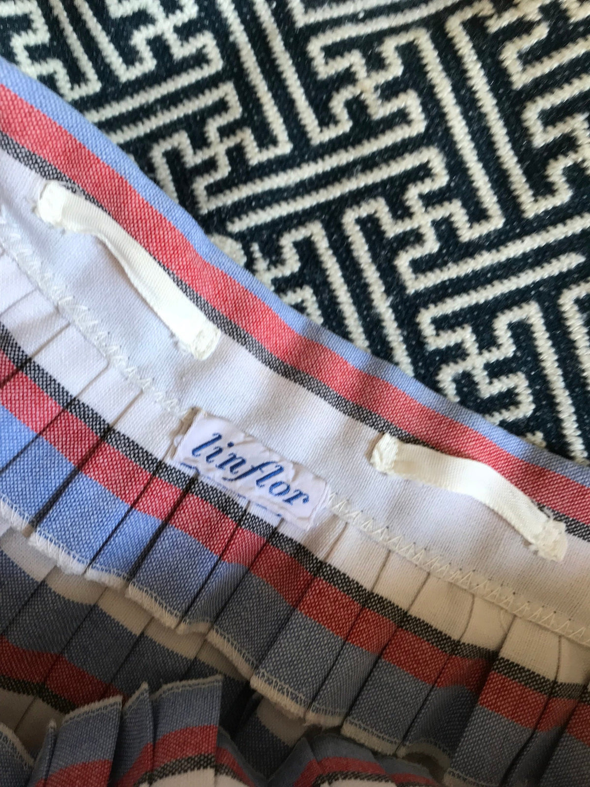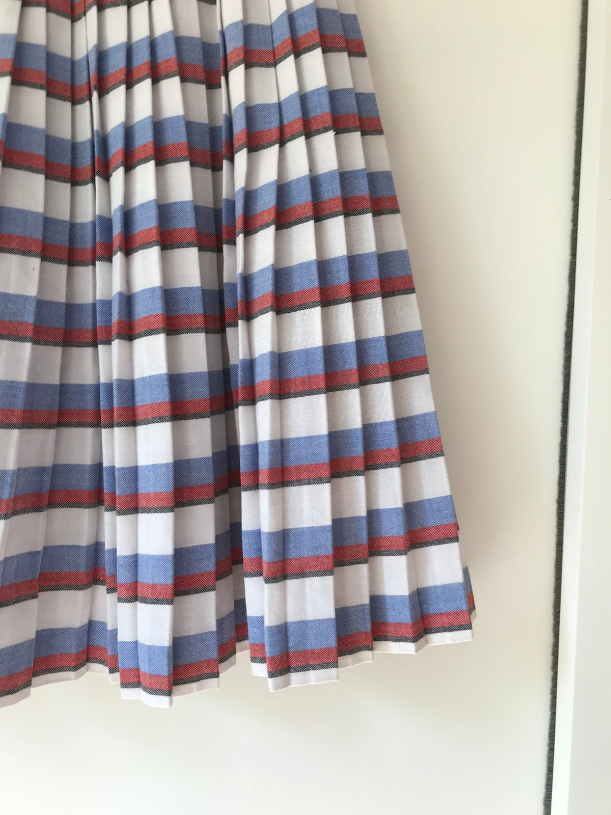 Prix unitaire parJupe courte plissée, rayures bleu, blanc et rouge pastel. Une pièce très mignonne des années 70s, taille élastique.