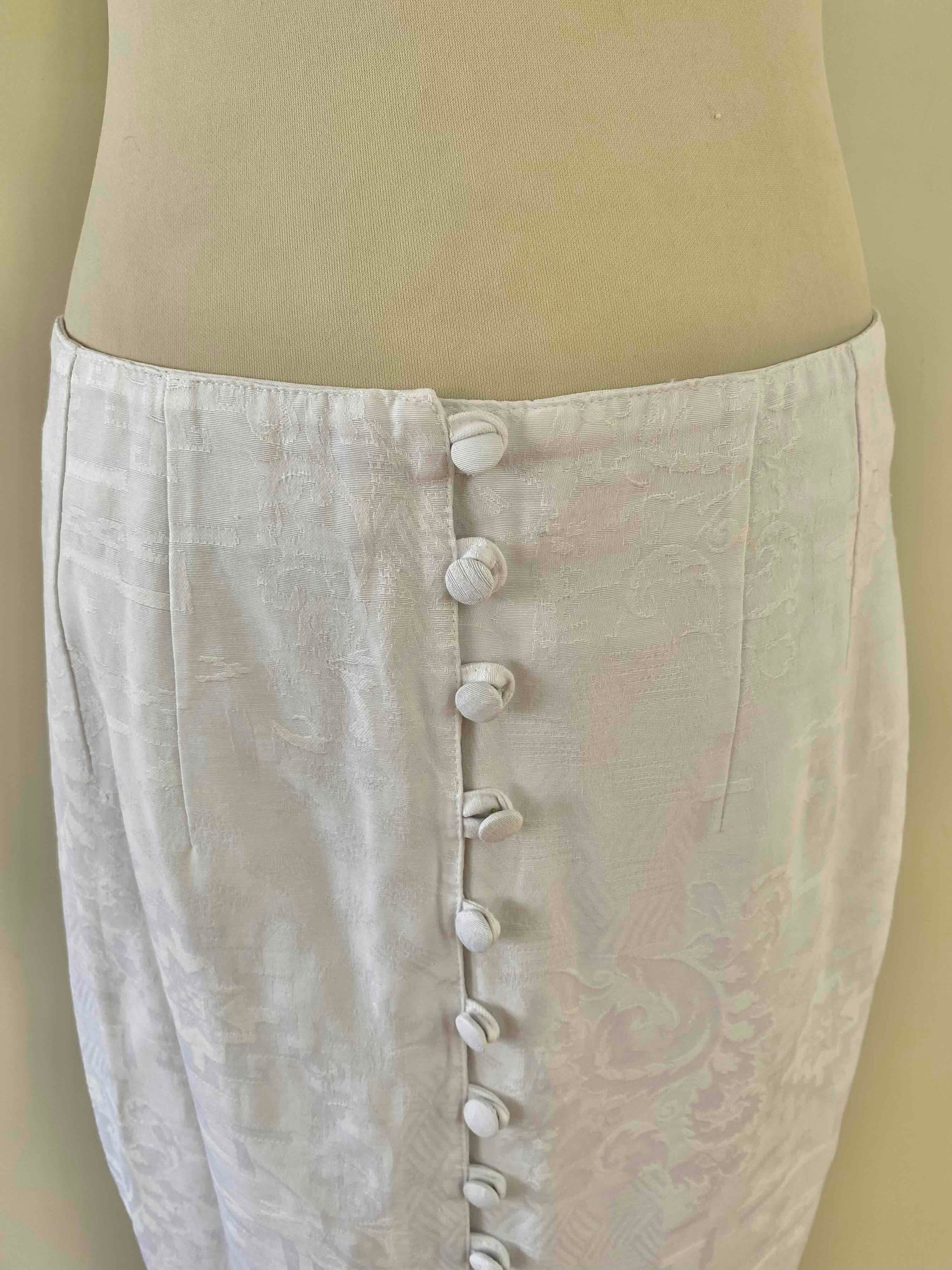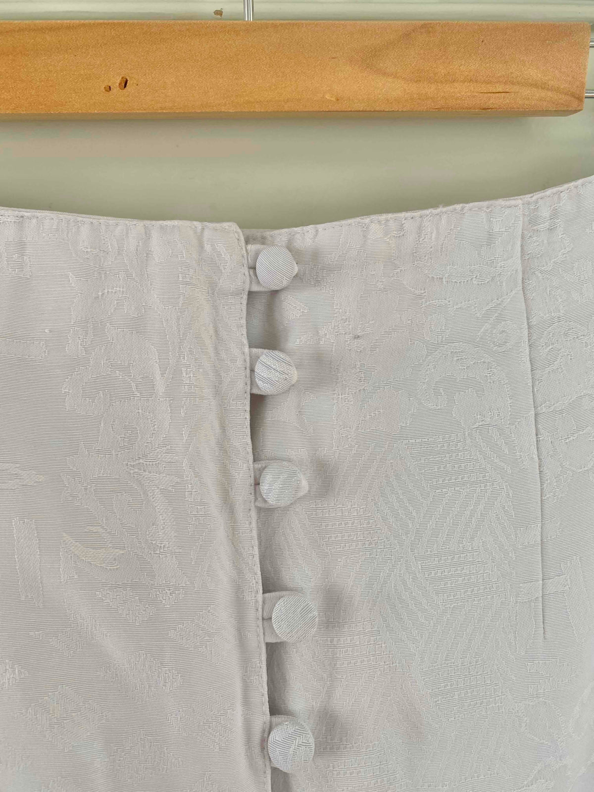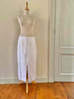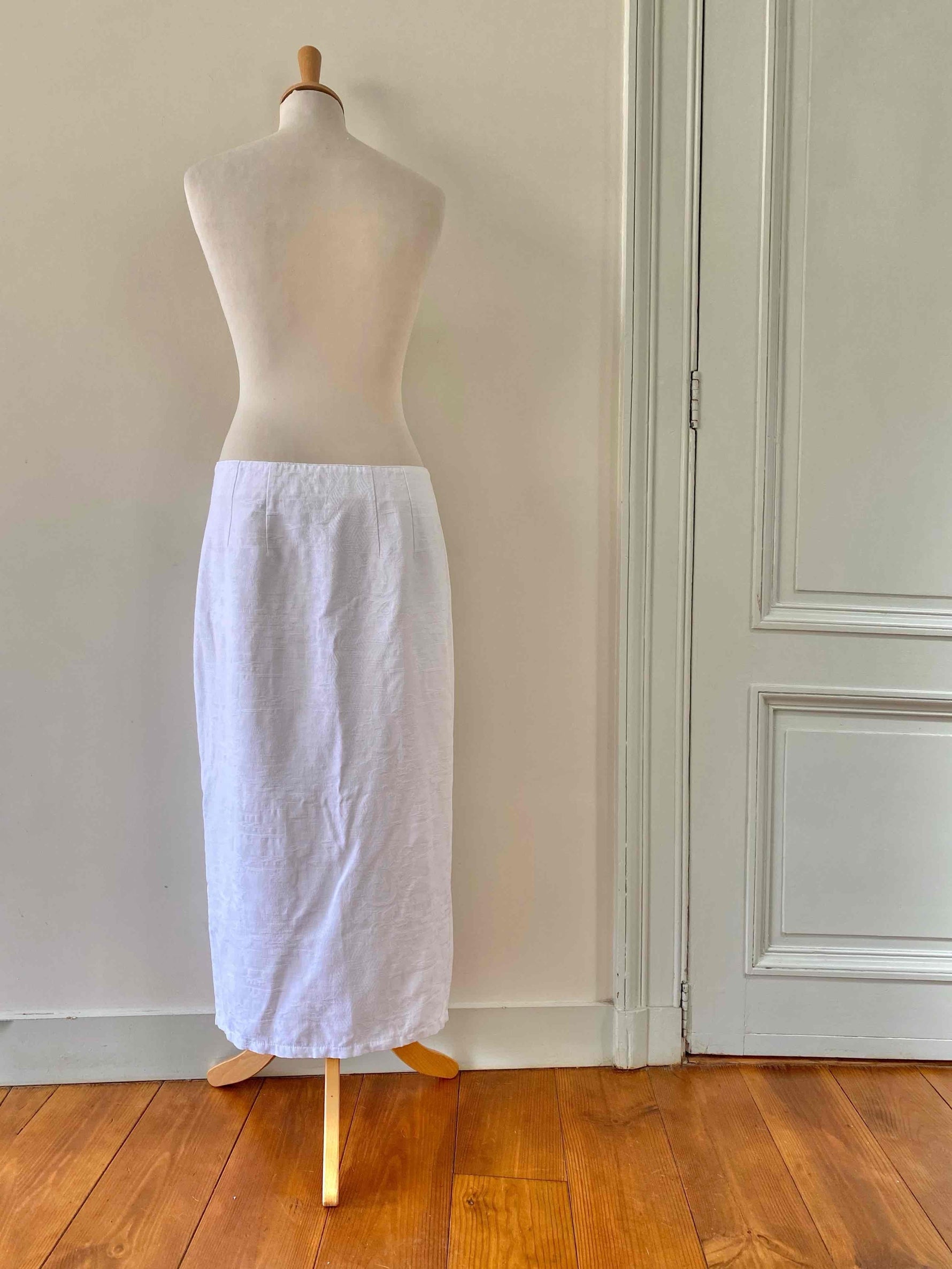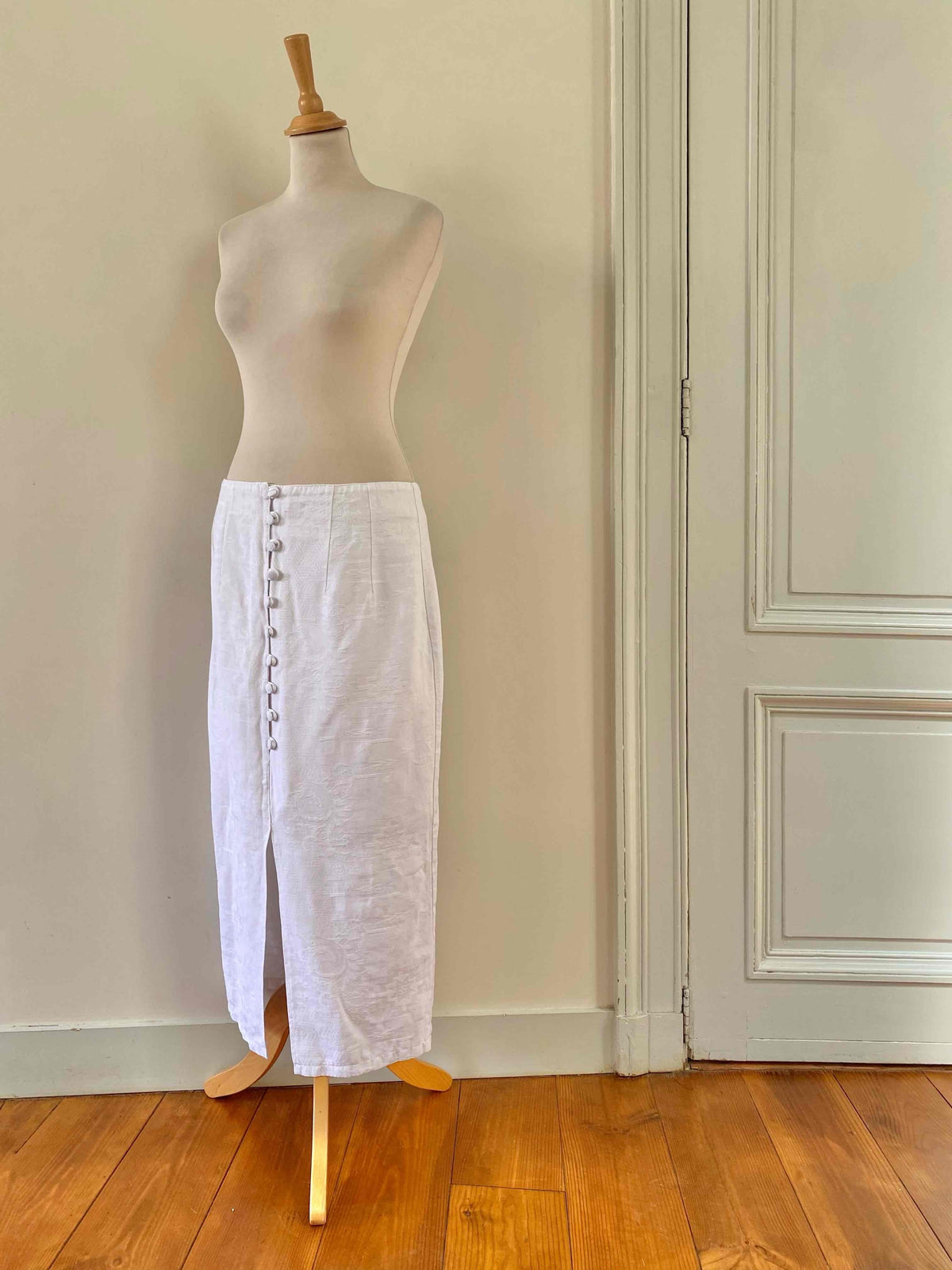 Prix unitaire parJupe damassée en lin blanc, motifs ethniques damassés en jacquard, fendue devant et boutons recouverts à passants, longueur midi, années 90's, taille 38 portée ici sur un mannequin T36, hanches 48cm.