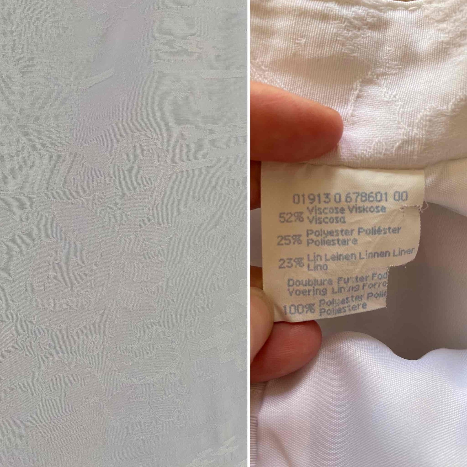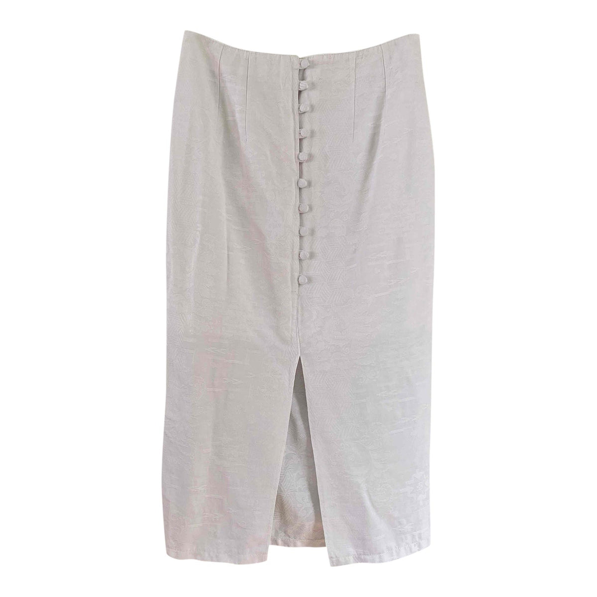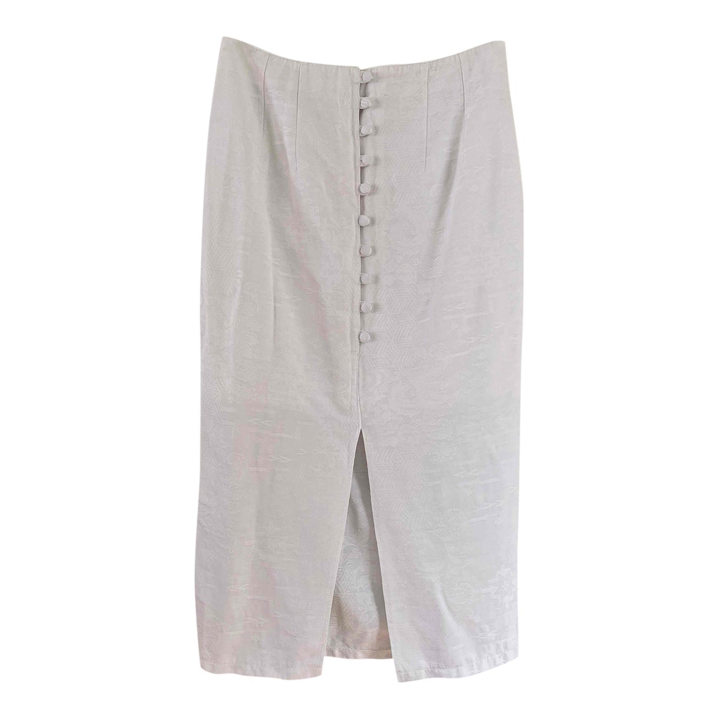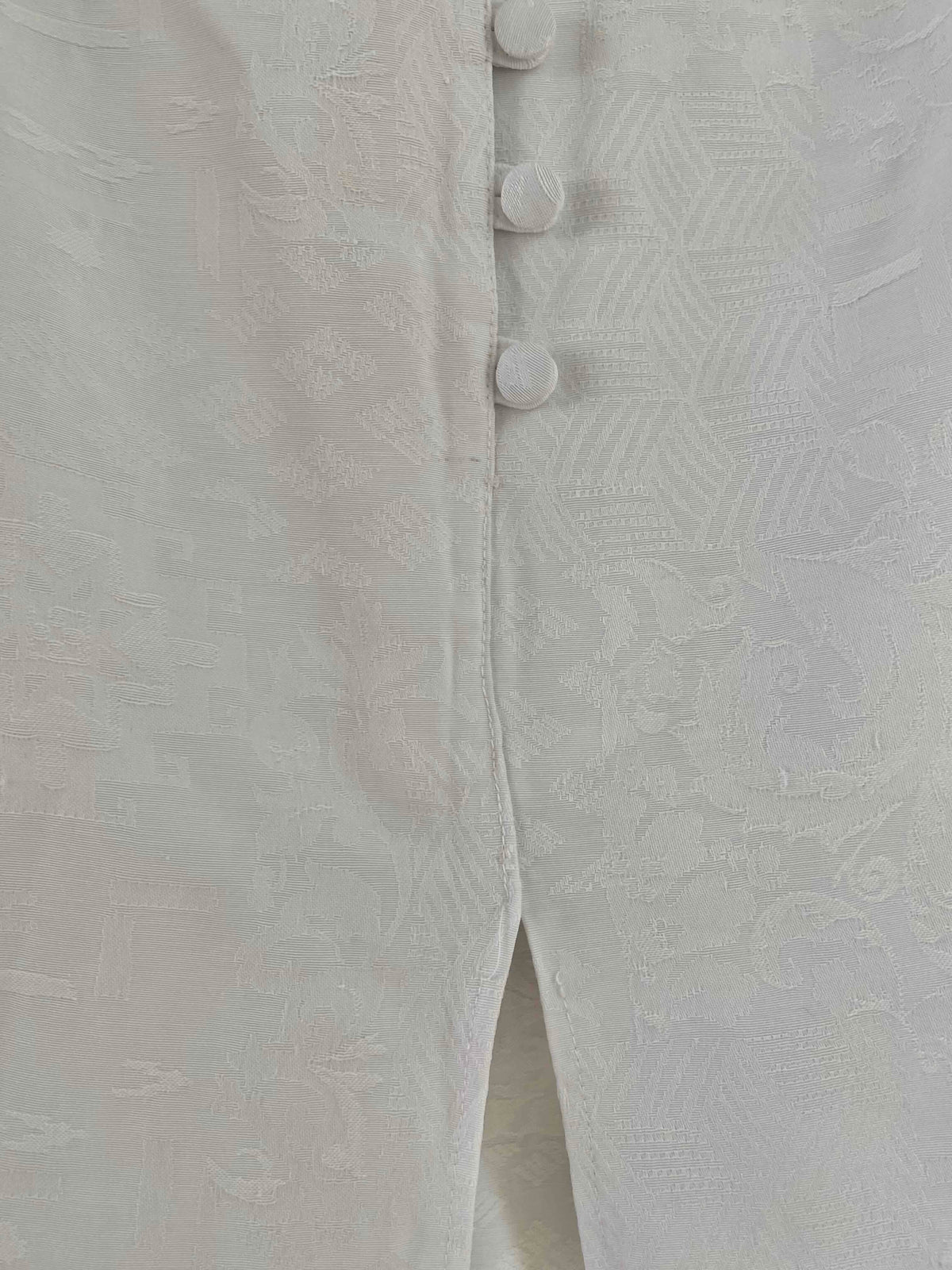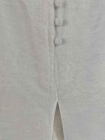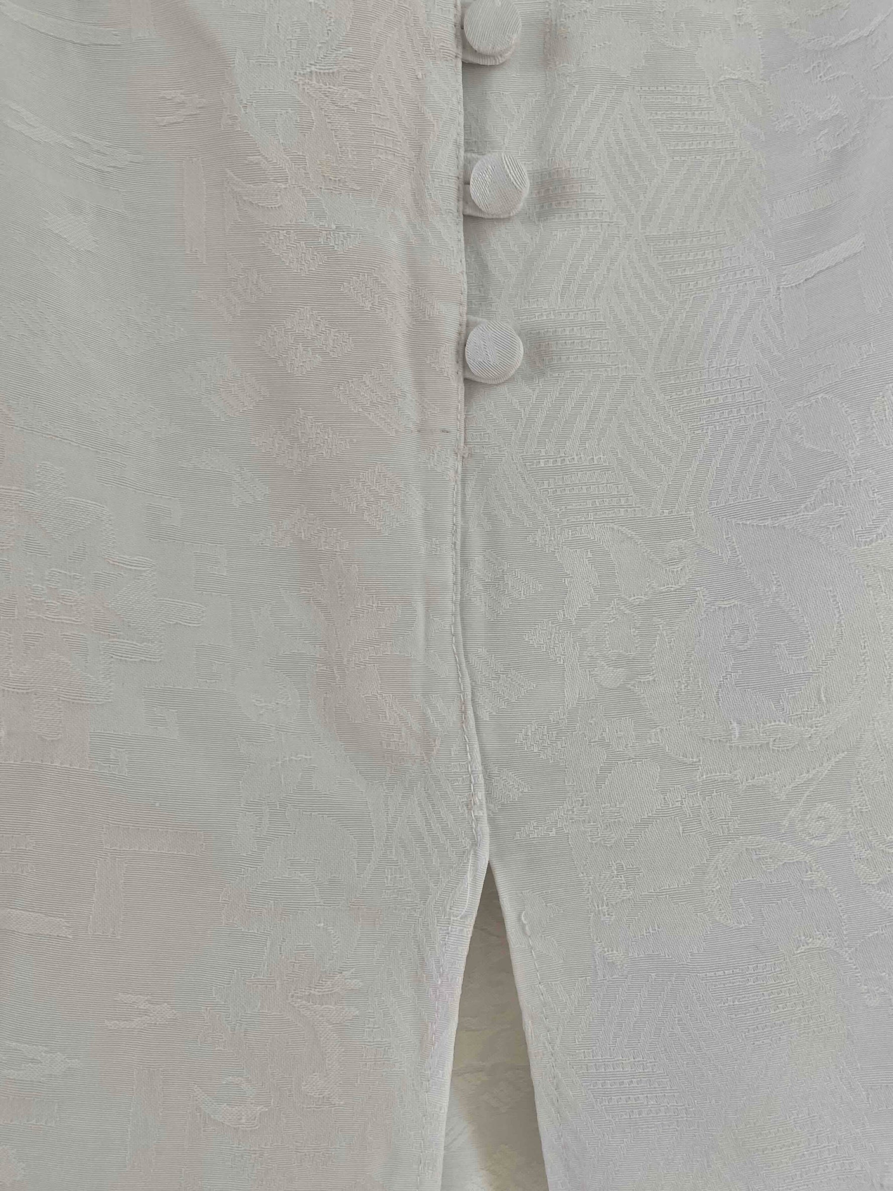 Prix unitaire parJupe damassée en lin blanc, motifs ethniques damassés en jacquard, fendue devant et boutons recouverts à passants, longueur midi, années 90's, taille 38 portée ici sur un mannequin T36, hanches 48cm.