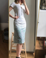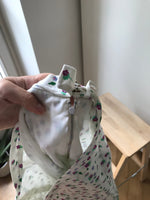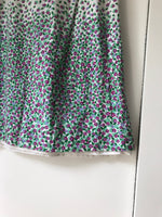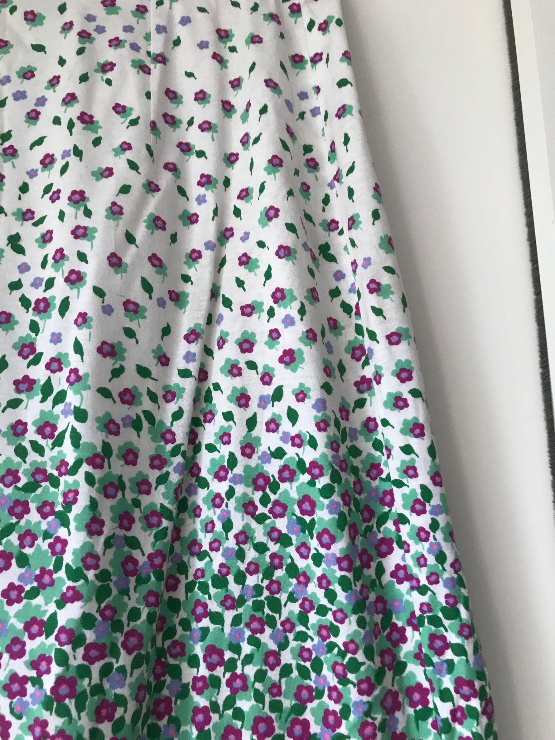 Prix unitaire parJupe en coton blanc à fleurs violettes et vertes. Doublure synthétique et agrafes anciennes. Zip en métal (gage de qualité et d'ancienneté).