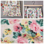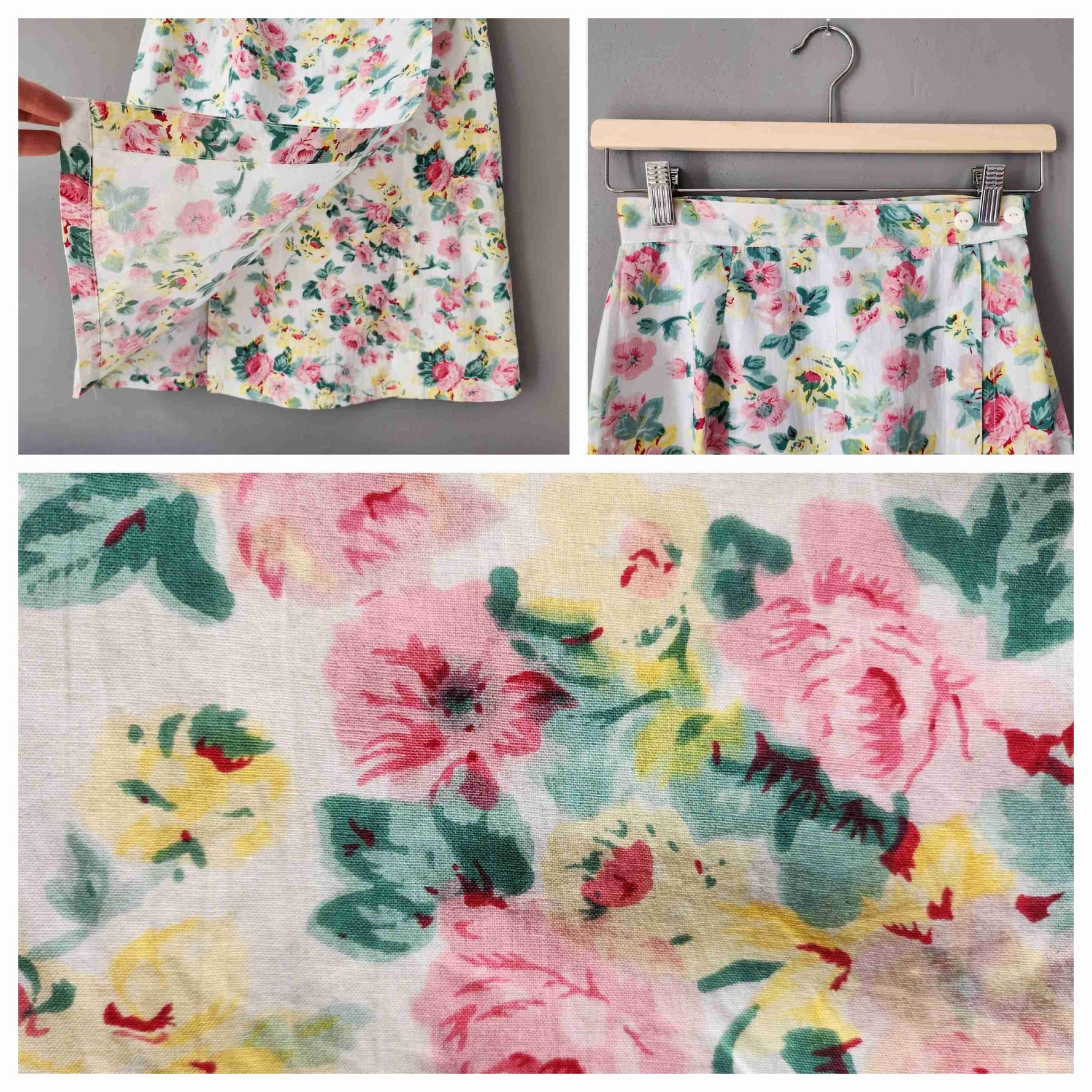 Prix unitaire parJupe portefeuille en coton blanc fleuri, coloris pastel jaune, rose et vert, taille haute, à croiser et fixer avec 3 boutons. Tissu légèrement froissé. Pièce 100% coton.