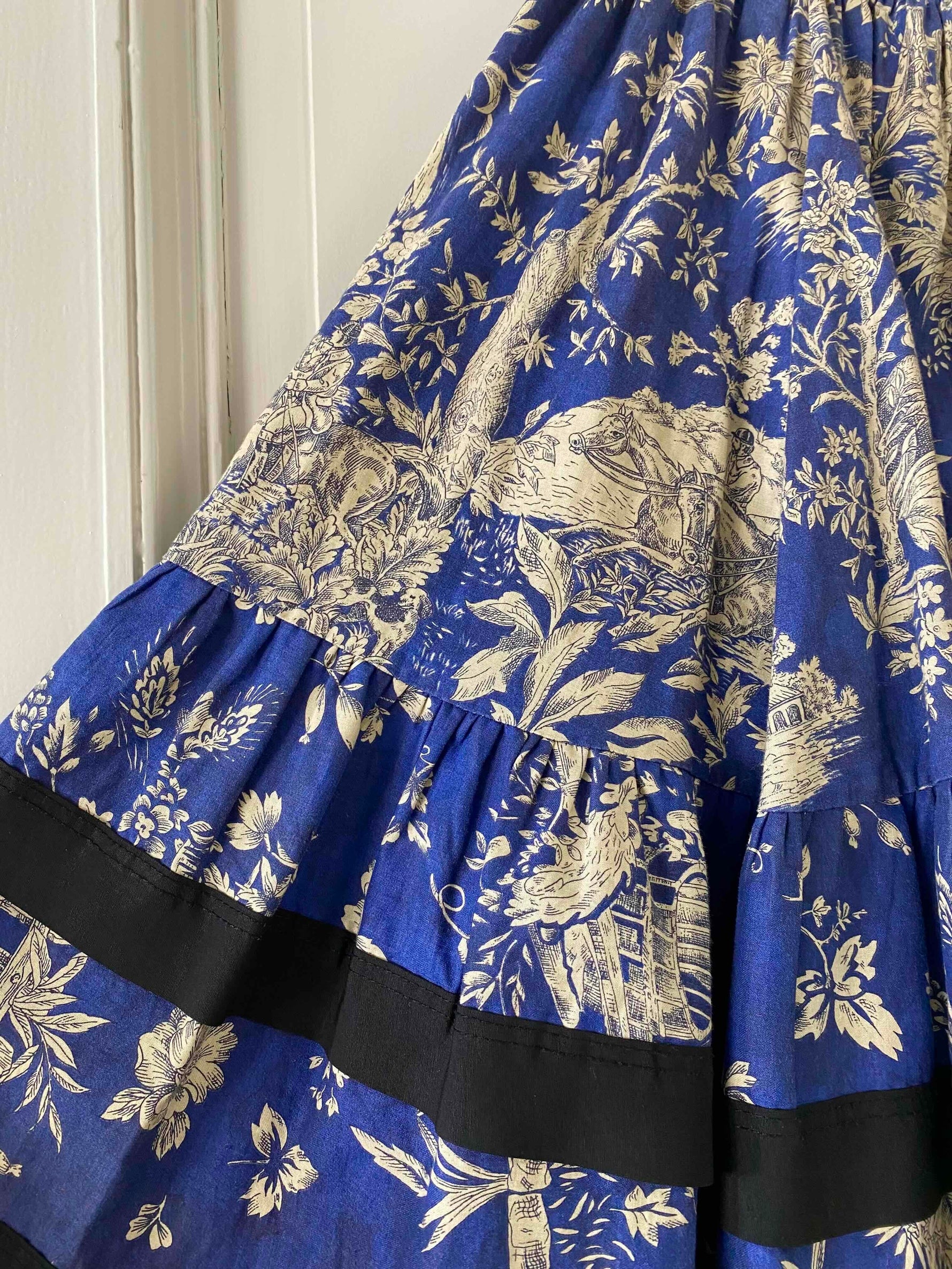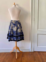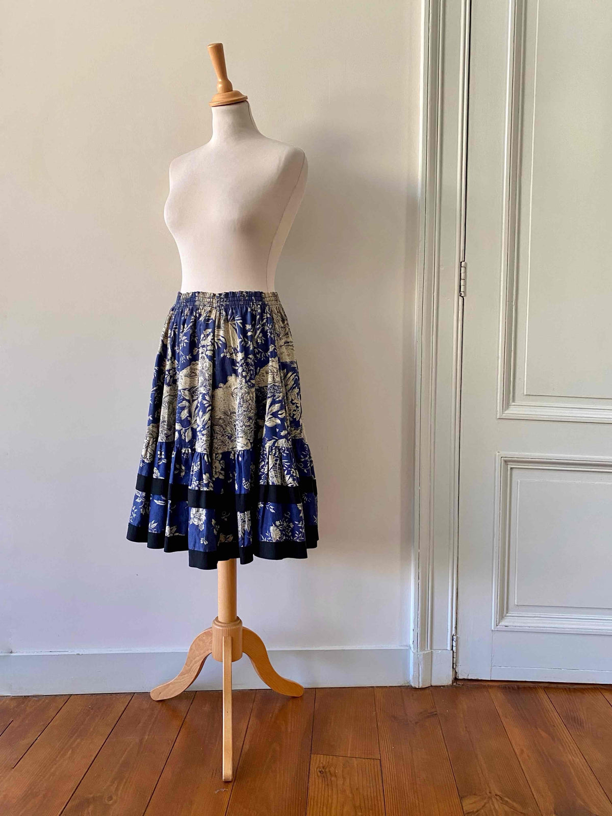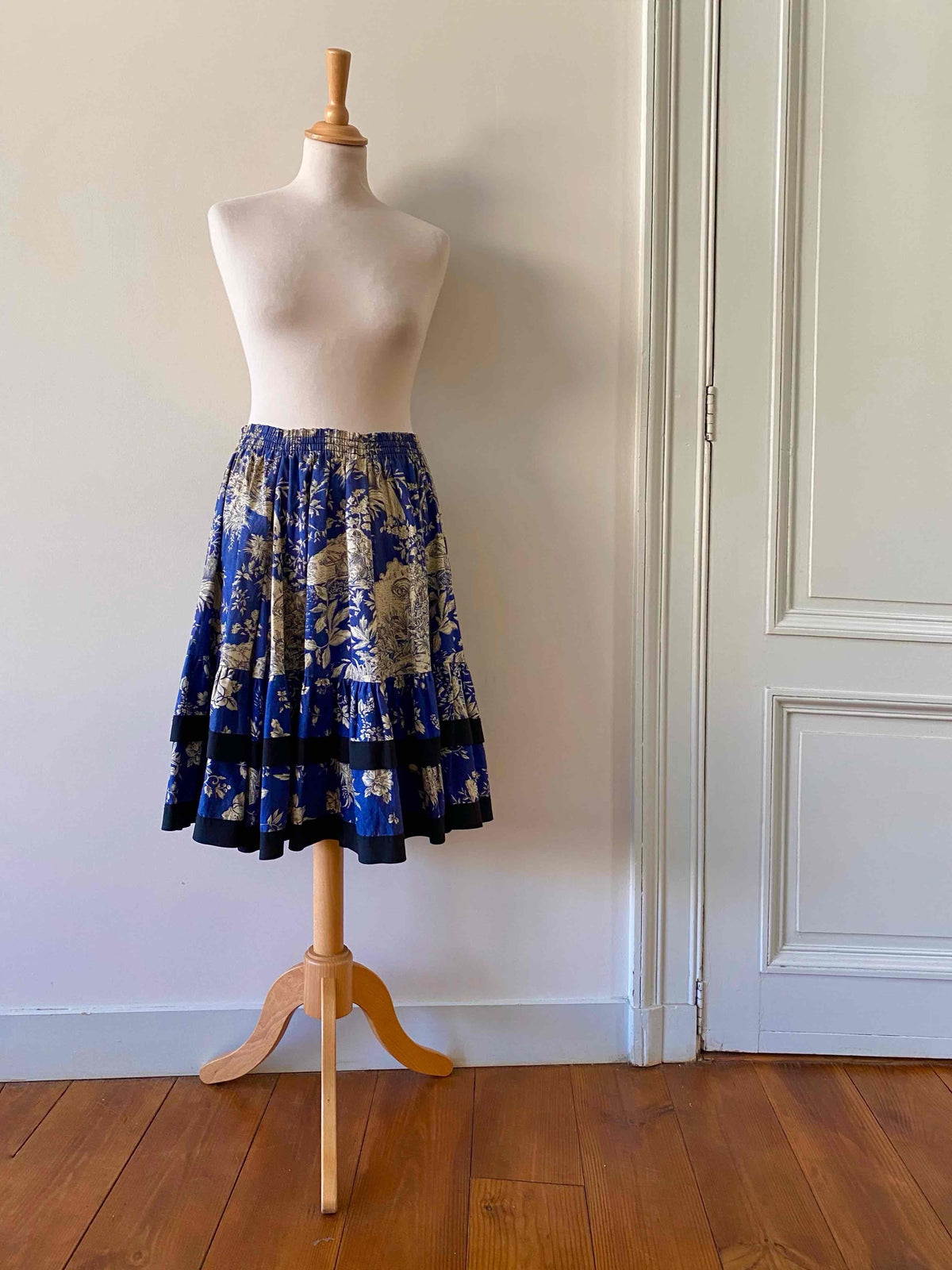 Prix unitaire parJupe midi provençale, en 100% coton bleu nuit imprimée toile de jouy motifs provençaux, bas volanté bordures noires, taille élastique, fabriquée en France, taille 36 actuelle portée ici sur un mannequin T36.
