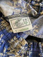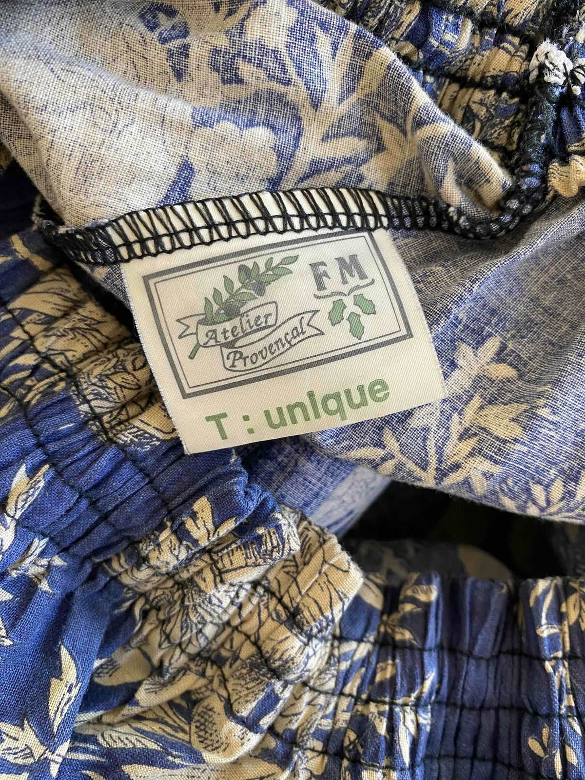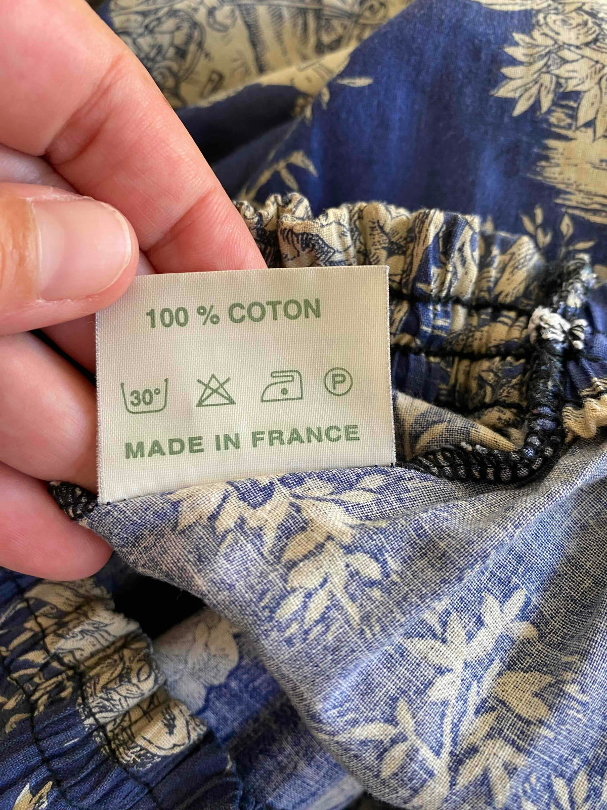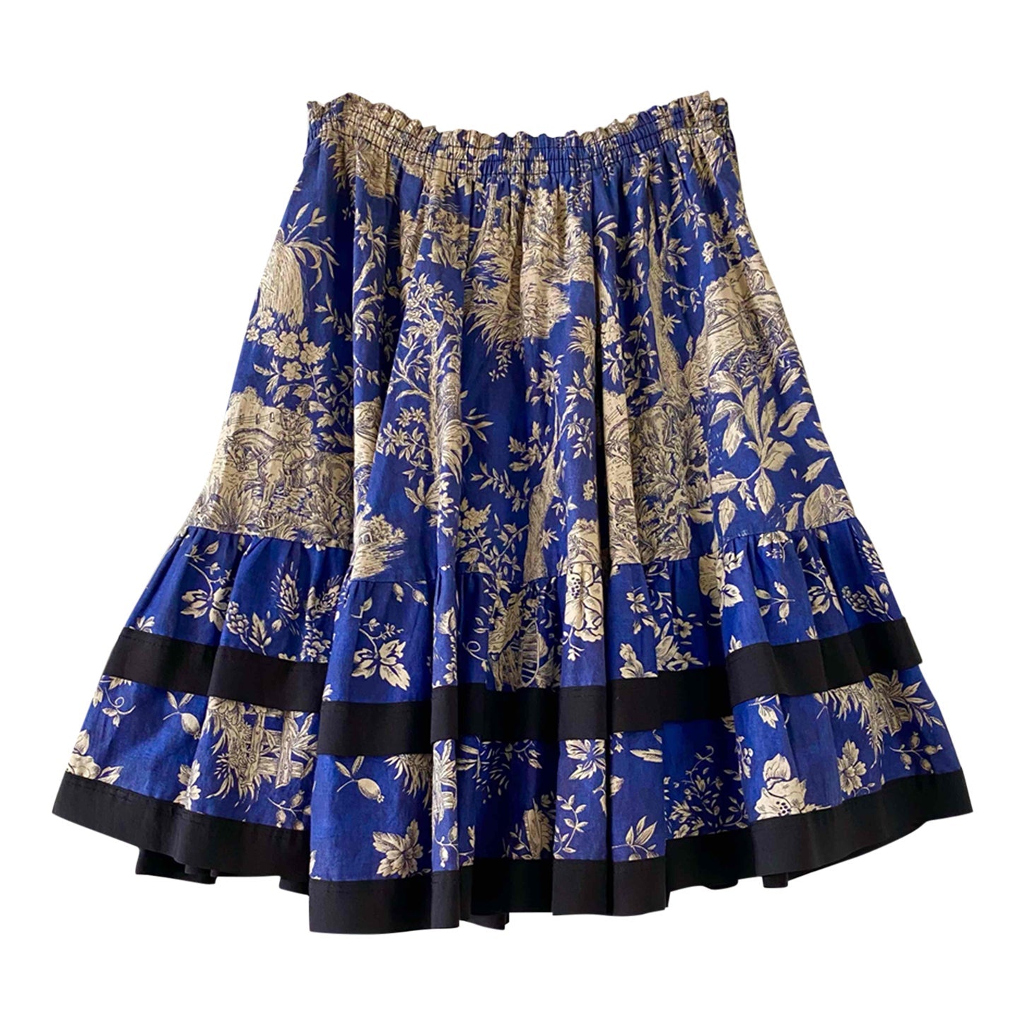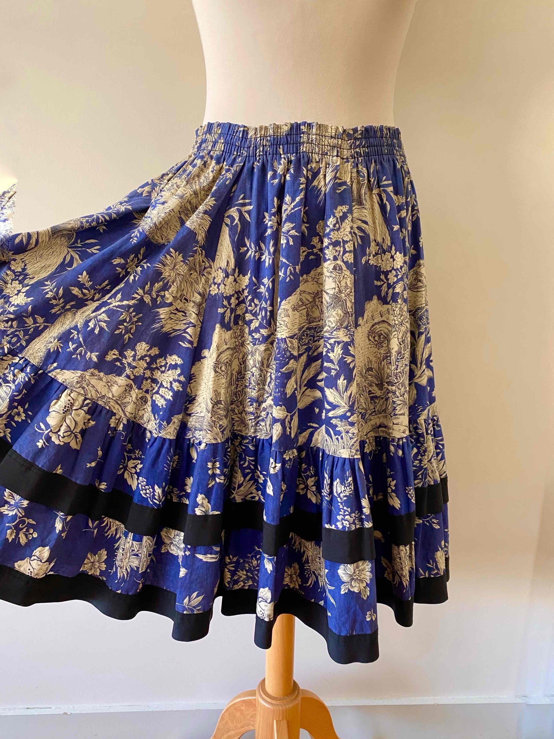 Prix unitaire parJupe midi provençale, en 100% coton bleu nuit imprimée toile de jouy motifs provençaux, bas volanté bordures noires, taille élastique, fabriquée en France, taille 36 actuelle portée ici sur un mannequin T36.