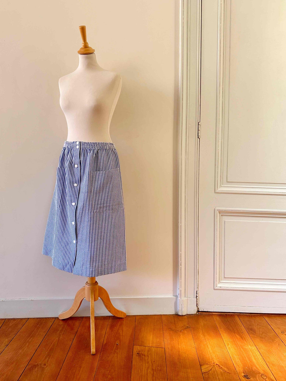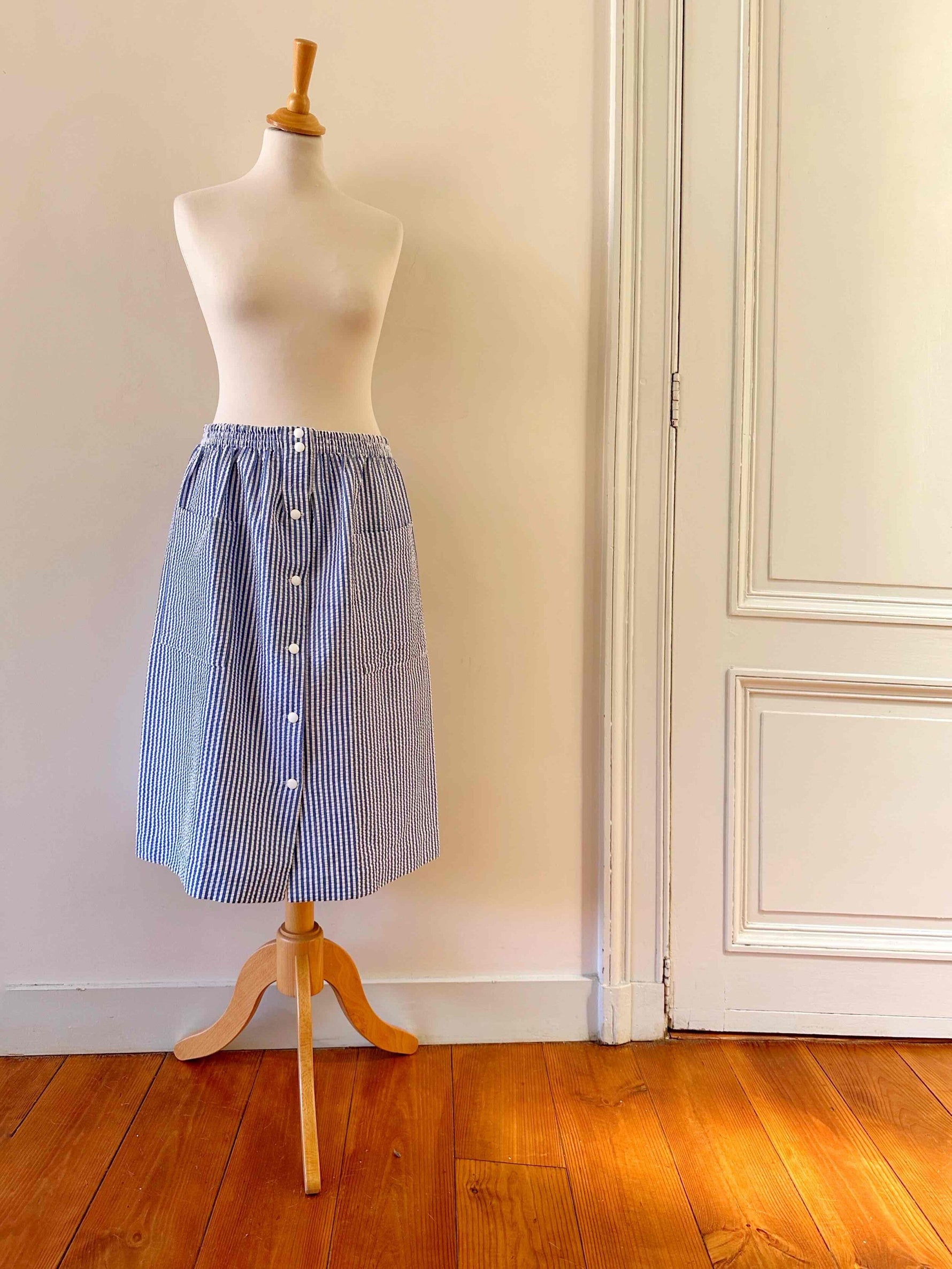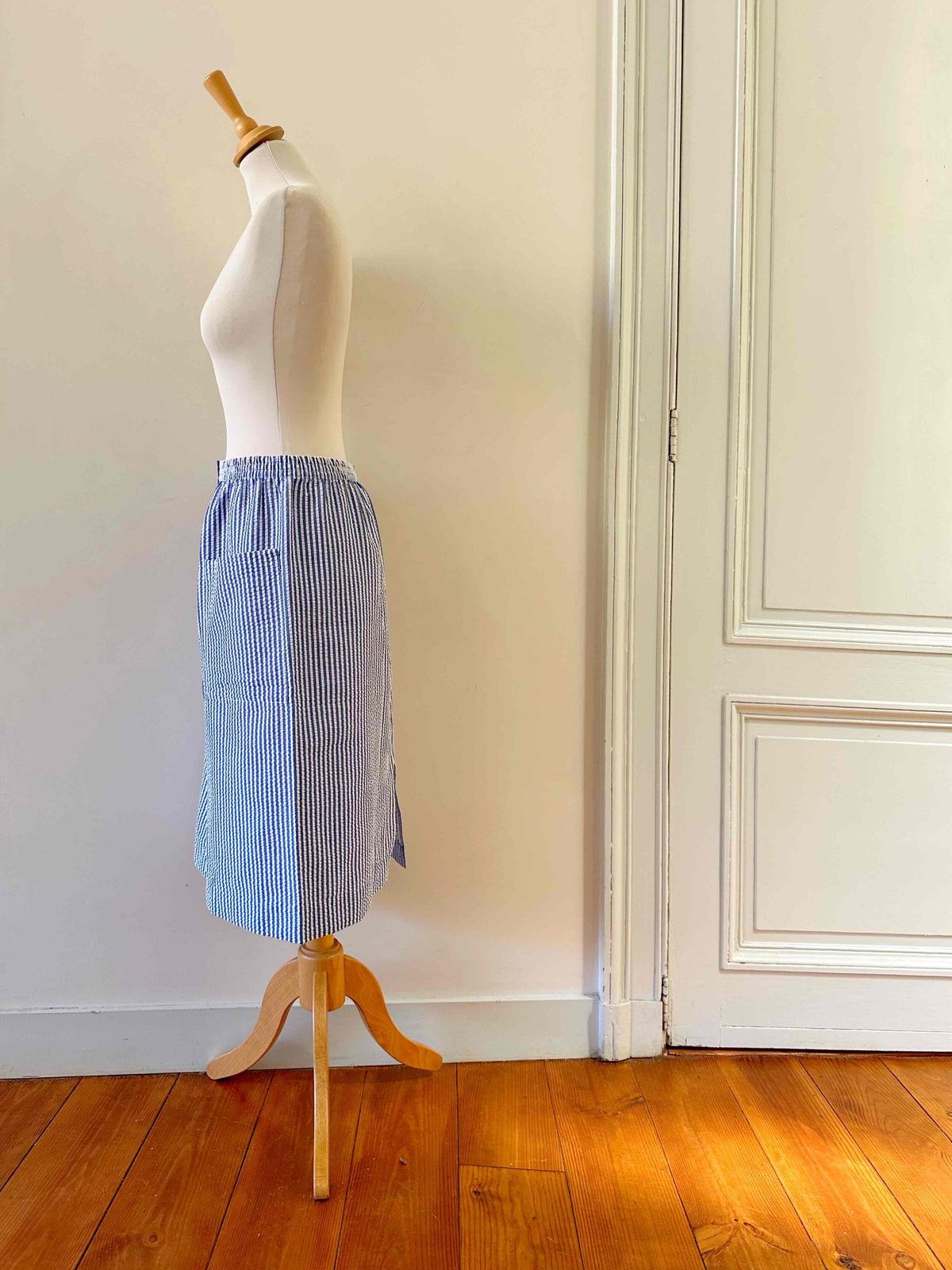 Prix unitaire parJupe midi à rayures, en coton searsucker gaufré, rayures bleues et blanches, taille élastique, boutonnée, fabriquée en France, convient aux tailles 38 et 40, portée ici sur un mannequin T36.