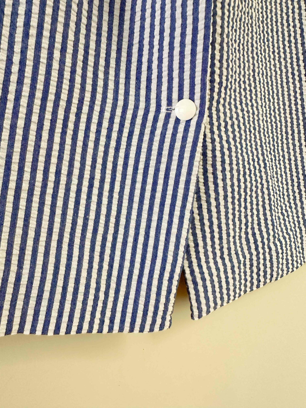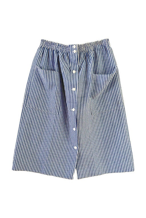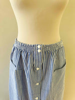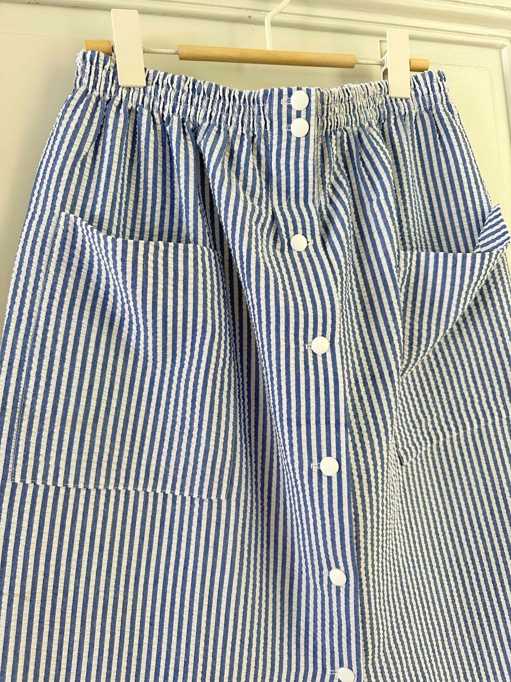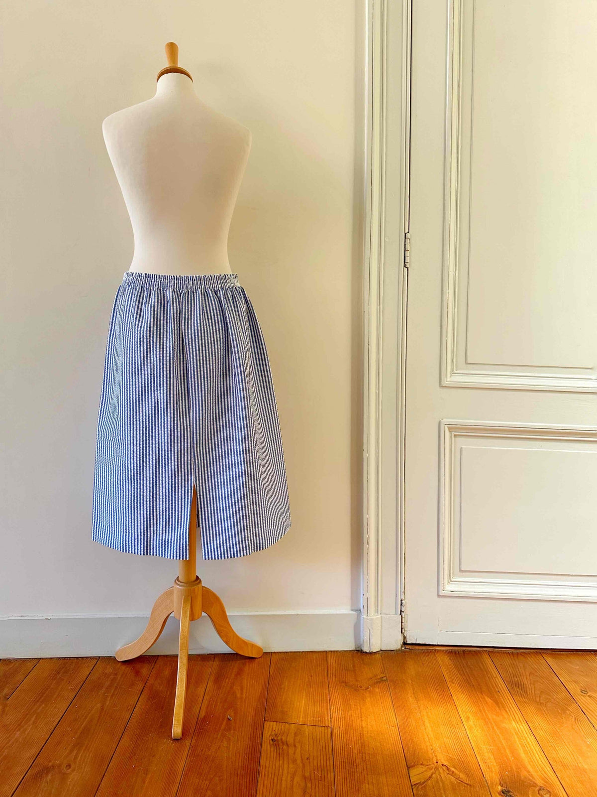 Prix unitaire parJupe midi à rayures, en coton searsucker gaufré, rayures bleues et blanches, taille élastique, boutonnée, fabriquée en France, convient aux tailles 38 et 40, portée ici sur un mannequin T36.