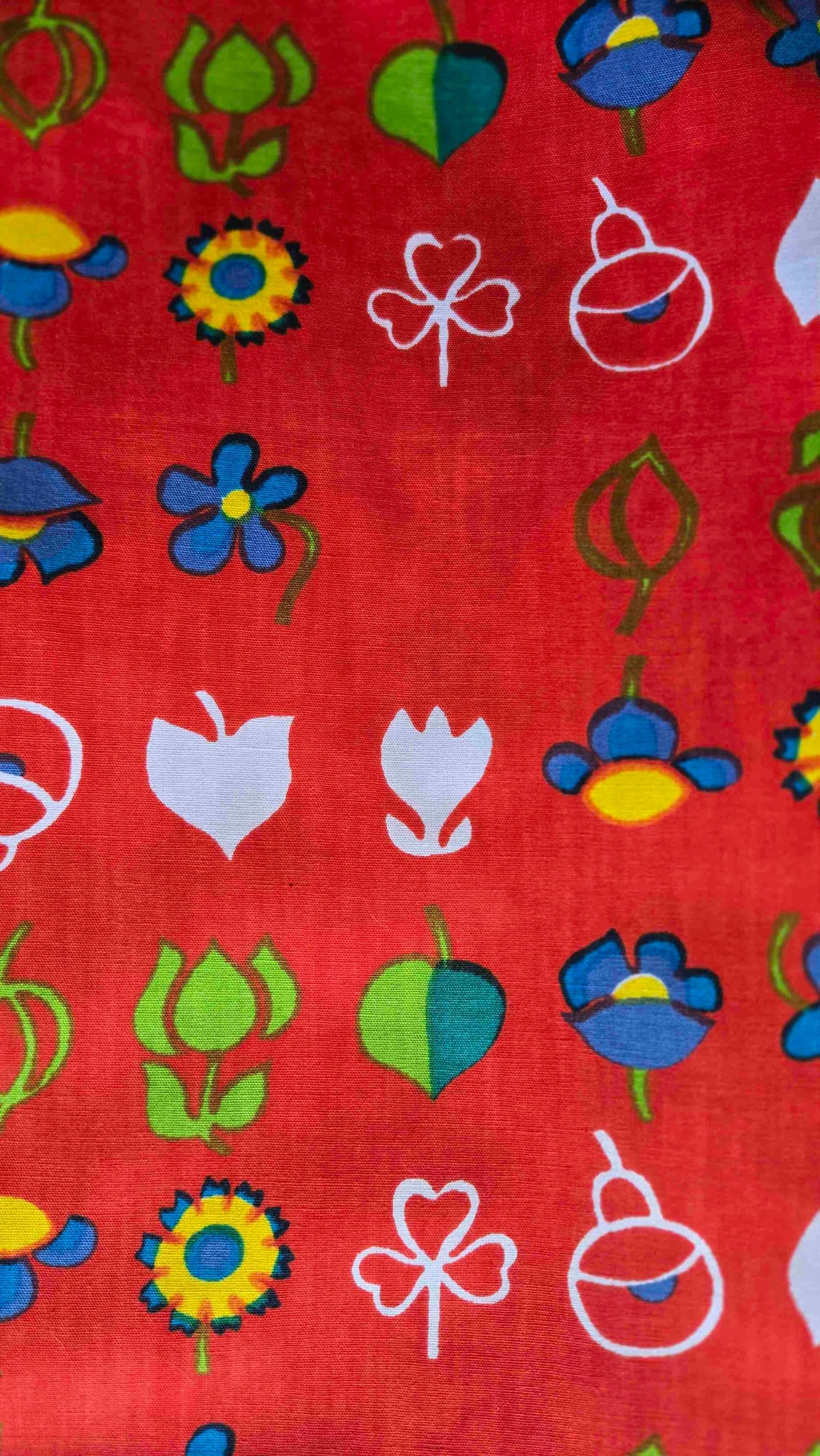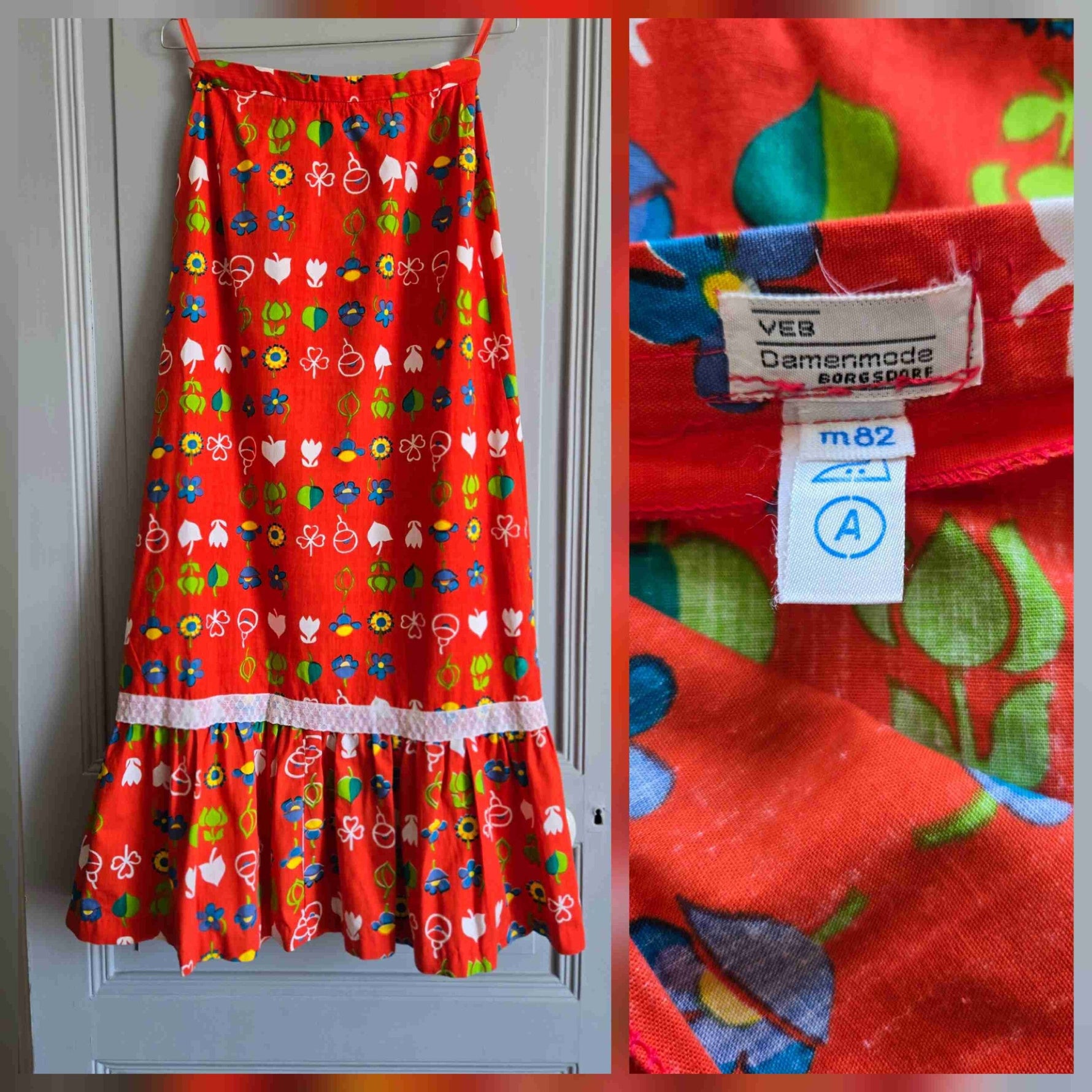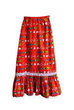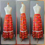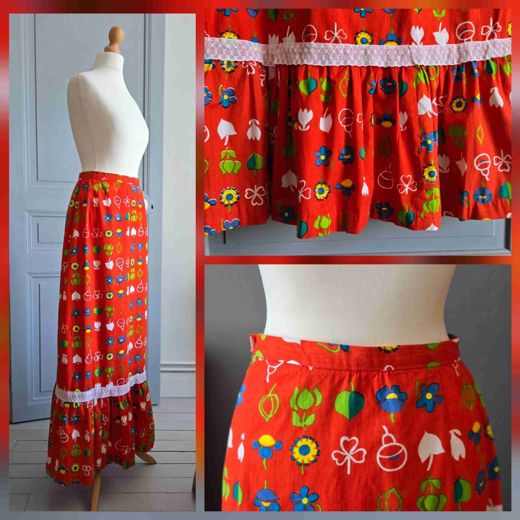Prix unitaire parJupe longue bohème en toile coton à motifs floral multicolore sur fond rouge, taille haute, base volantée avec ruban dentelle. Fermeture éclair côté. Longueur maxi. Années 70. Vous pouvez comparer les mesures avec celle d'une de vos jupes taille haute, mesures prises à plat.