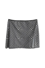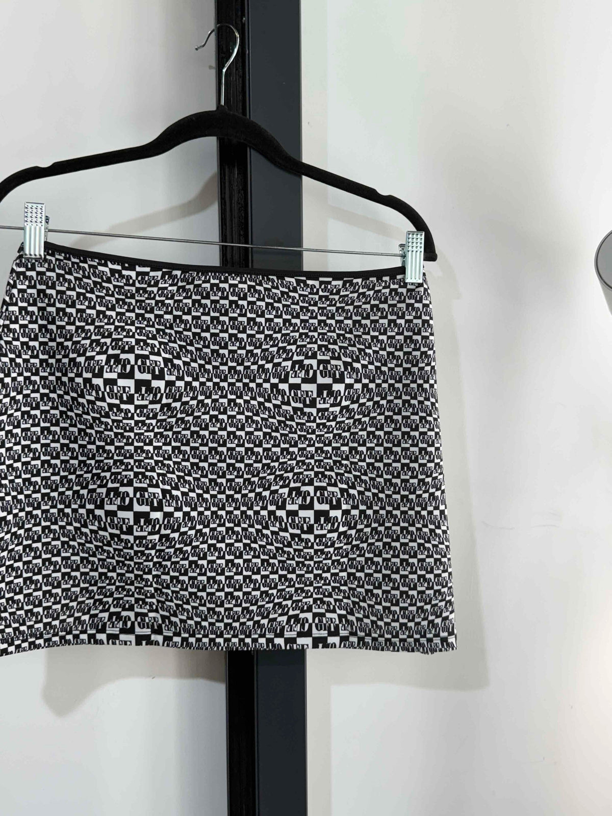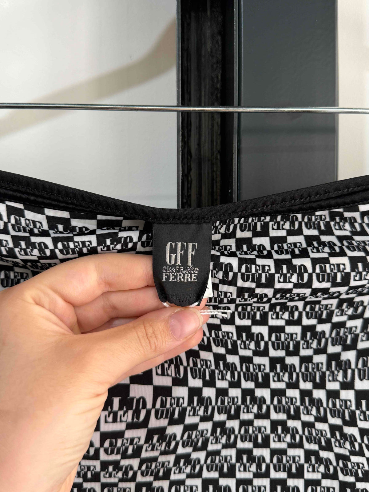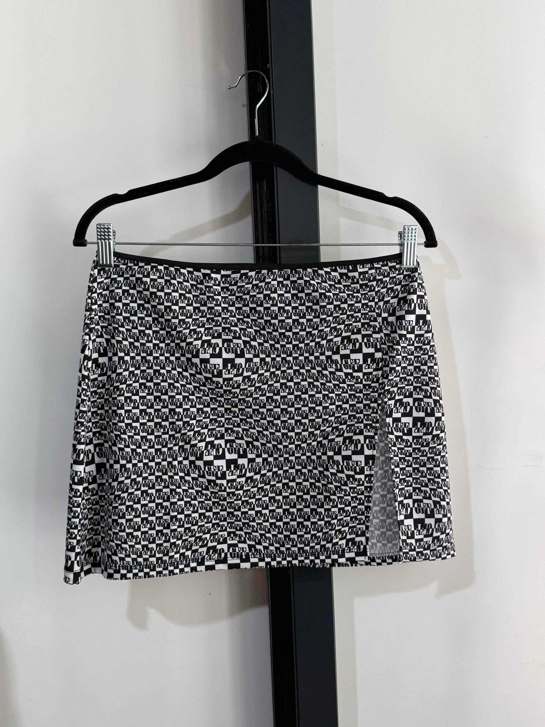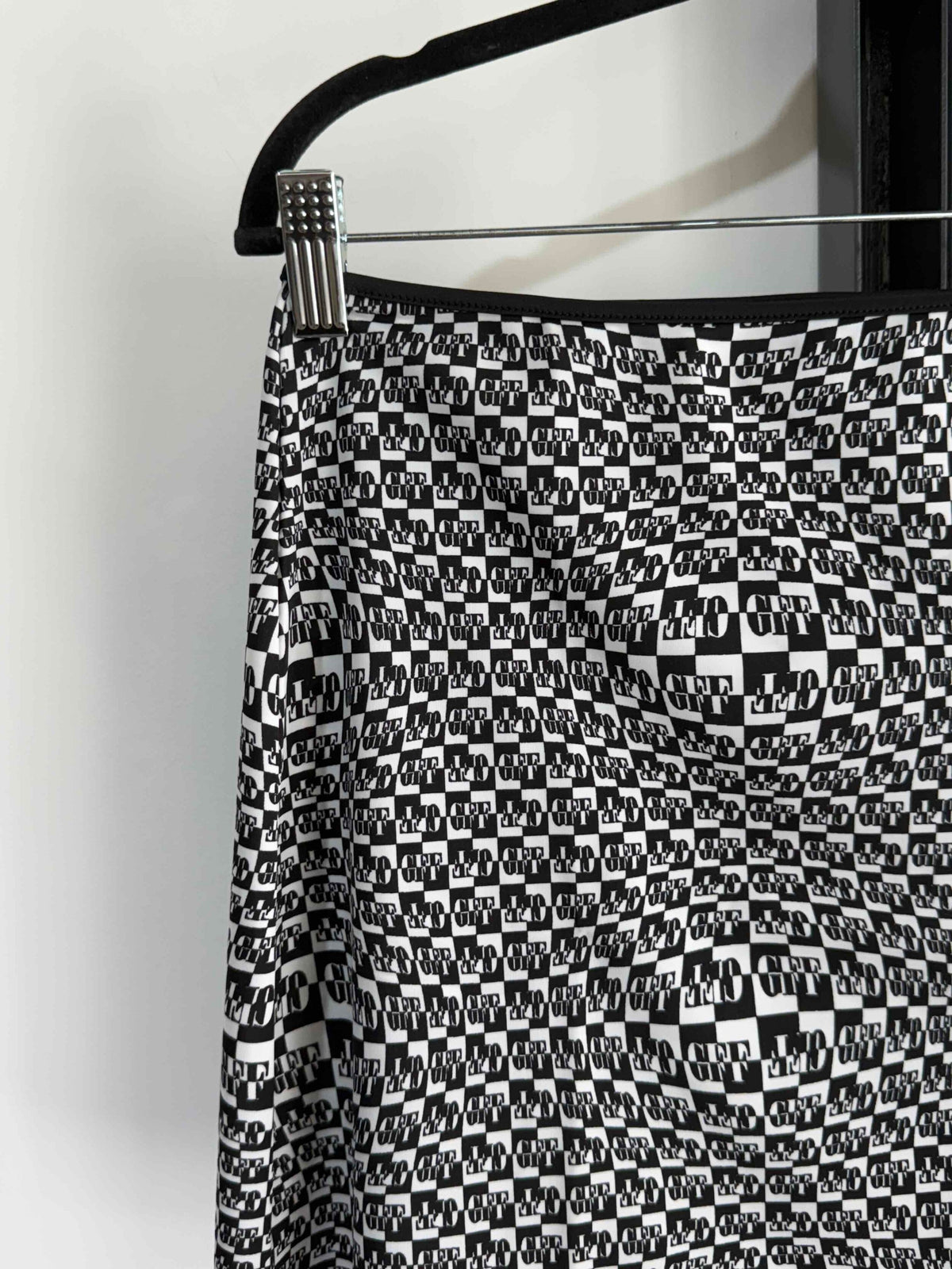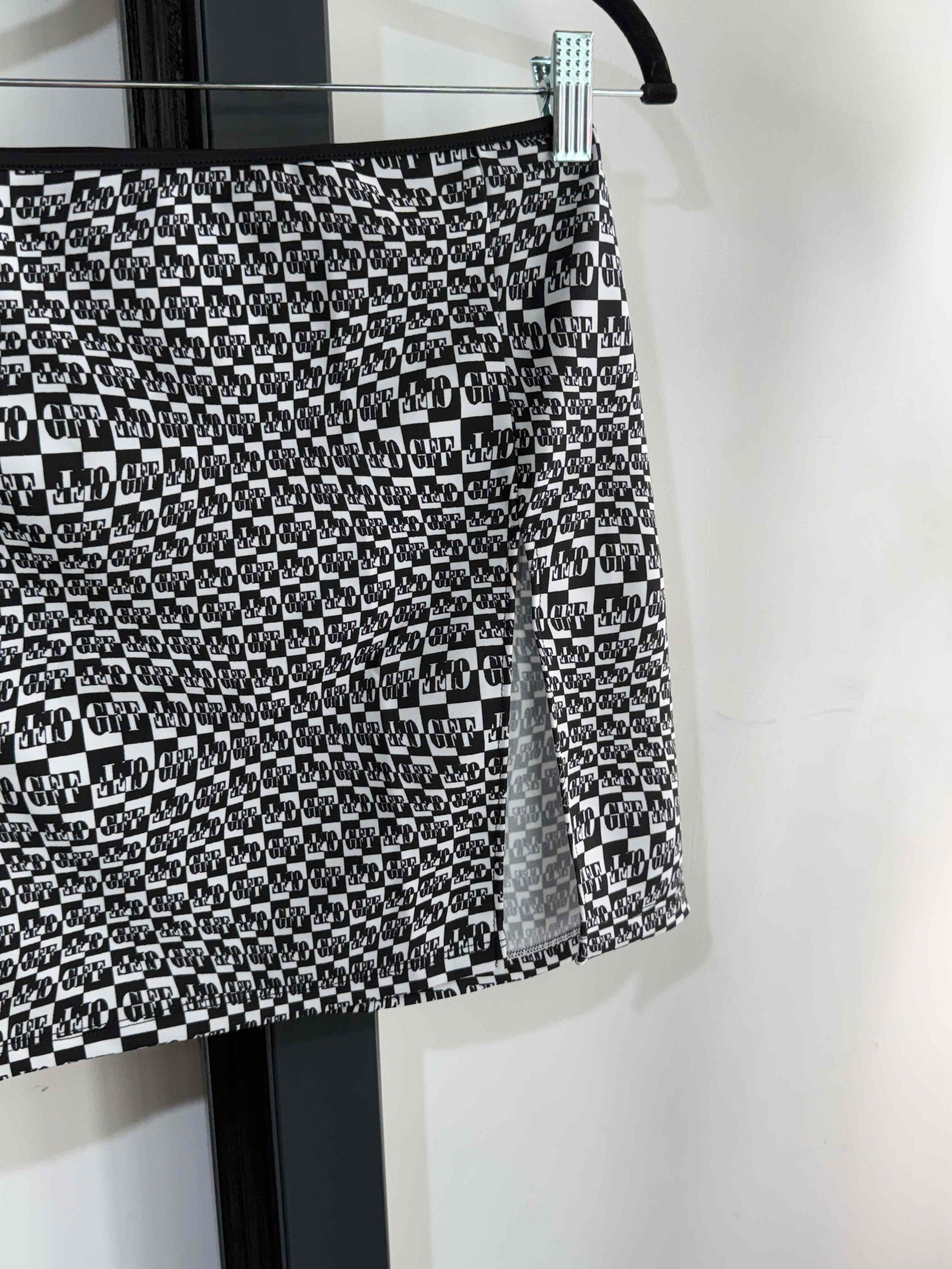 Prix unitaire parJupe courte strech matière maillot de bain blanc et noir de la marque Gianfranco Ferré. Motif damier distordu. Pas d’étiquette de taille ni de composition. Années 2000s. Taille 36/38.