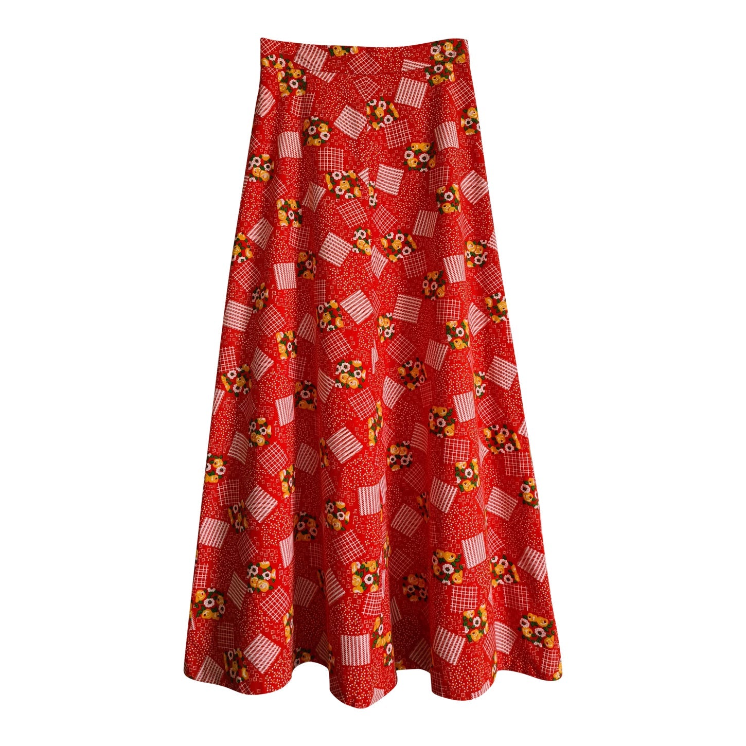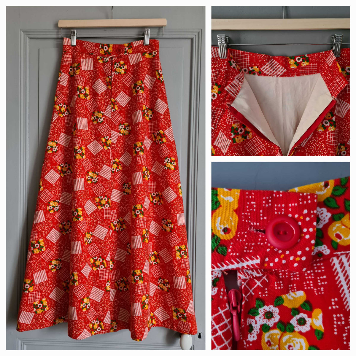 Prix unitaire parJupe longue en coton rouge vermillon à motifs et fleurs, blanc, jaune et vert. Taille haute, coupe trapèze évasée. Fermeture éclair et bouton au dos. Doublée. Pièce unique confectionnée main.