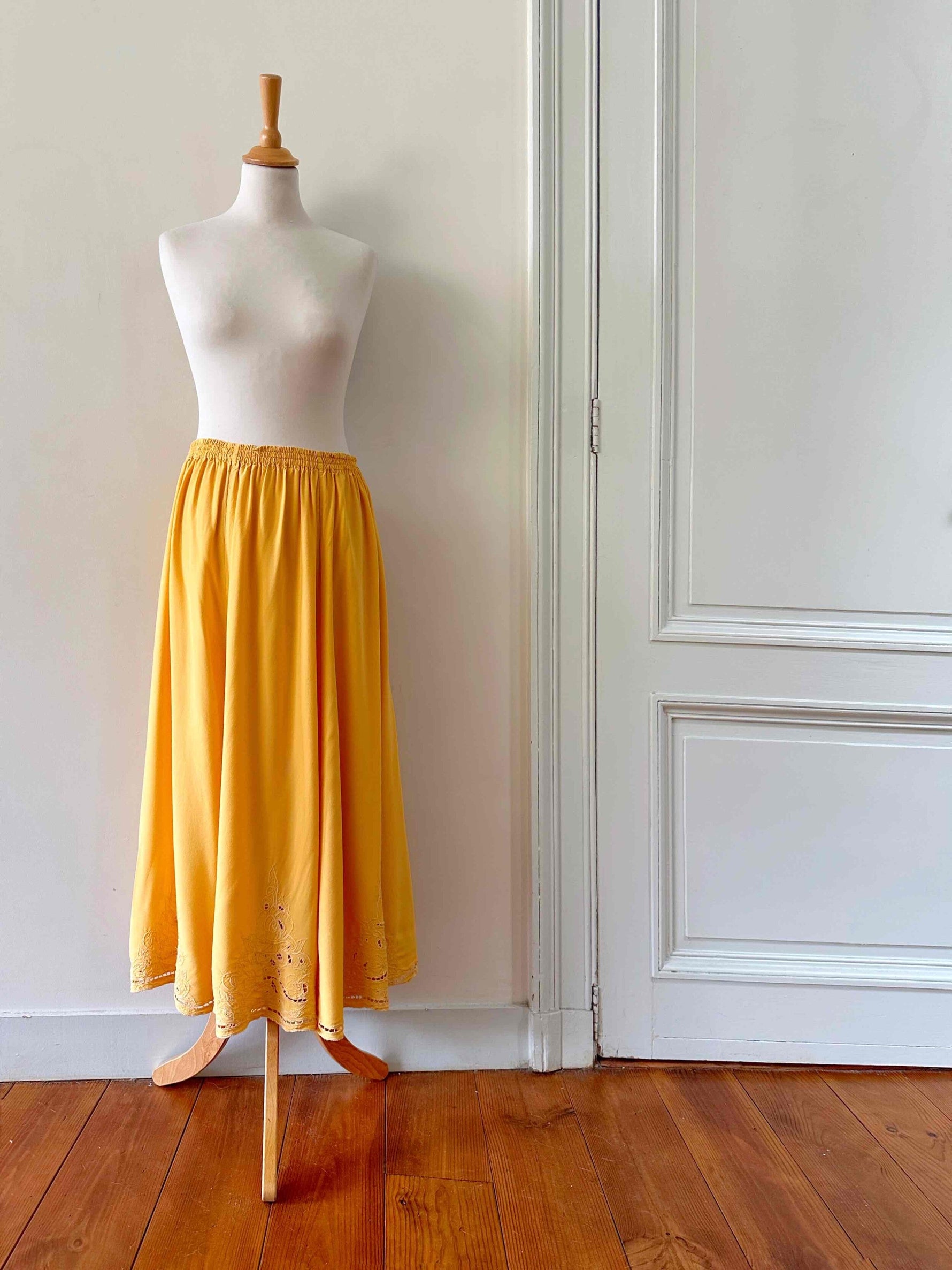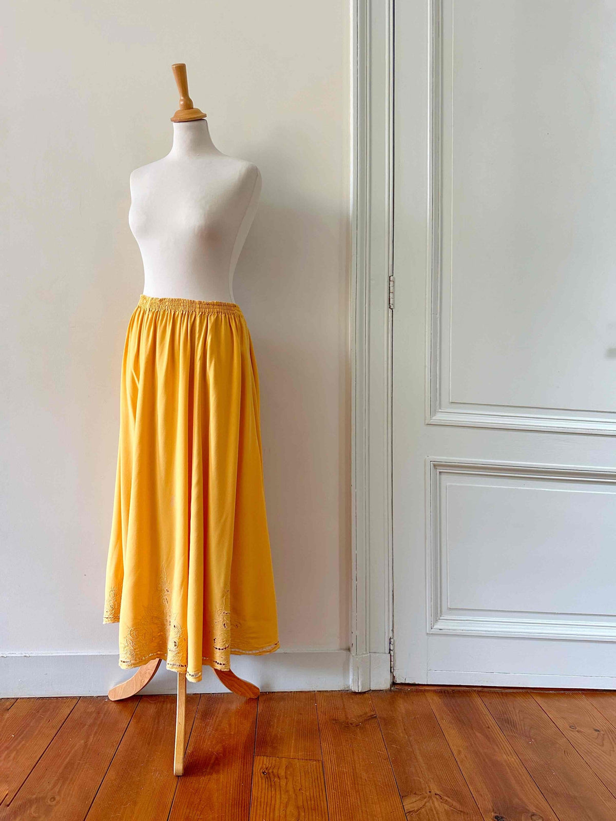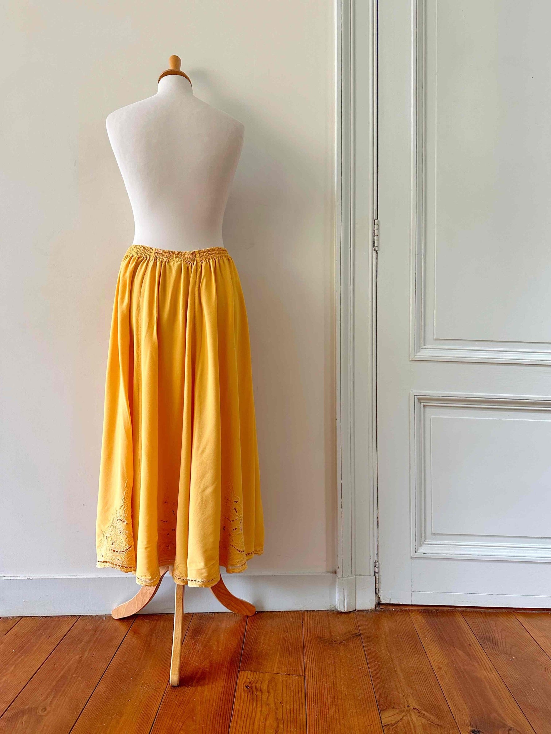 Jupe longue brodée, en viscose jaune mangue, bas ajouré de broderies anglaises florales, taille élastique au dos, années 80s, convient aux tailles 38, portée ici sur un mannequin T36, vendue avec sa blouse brodée coordonnée.