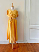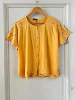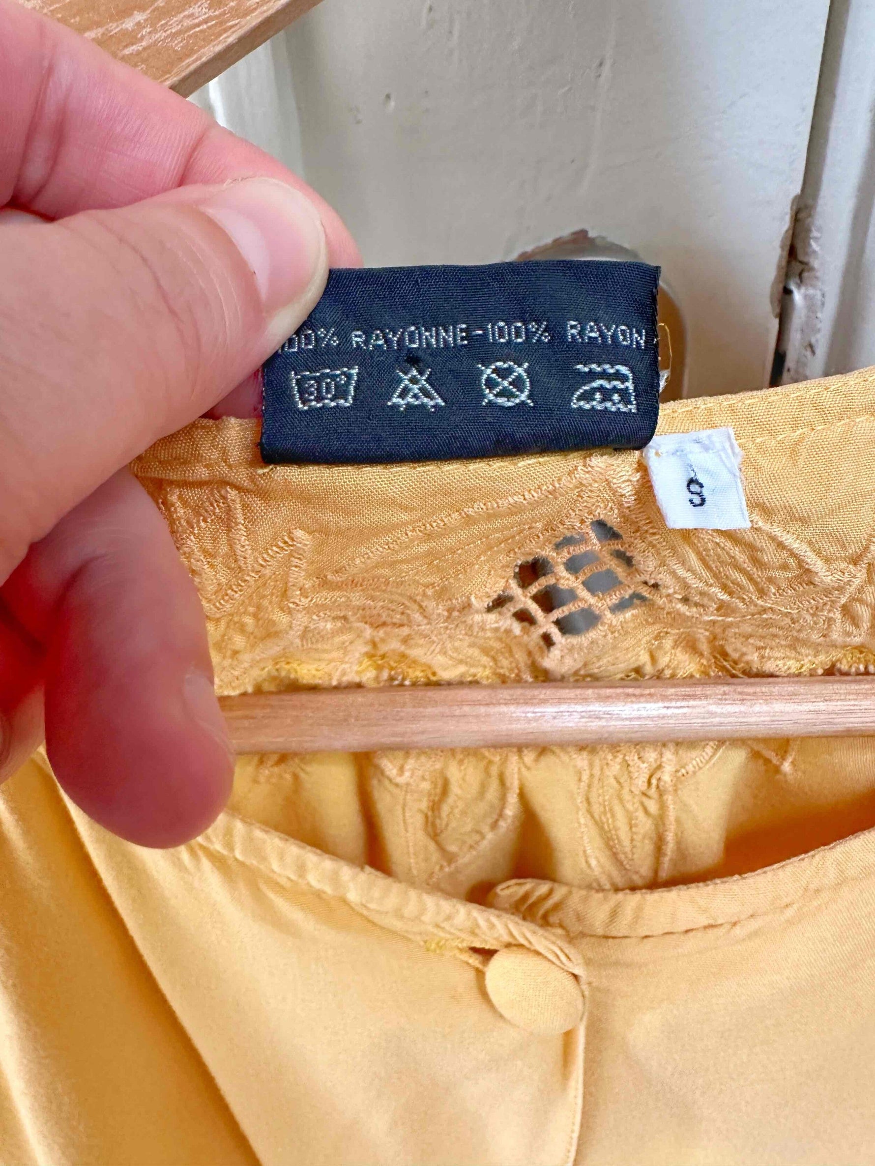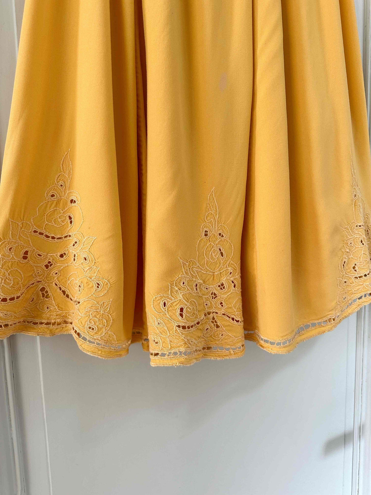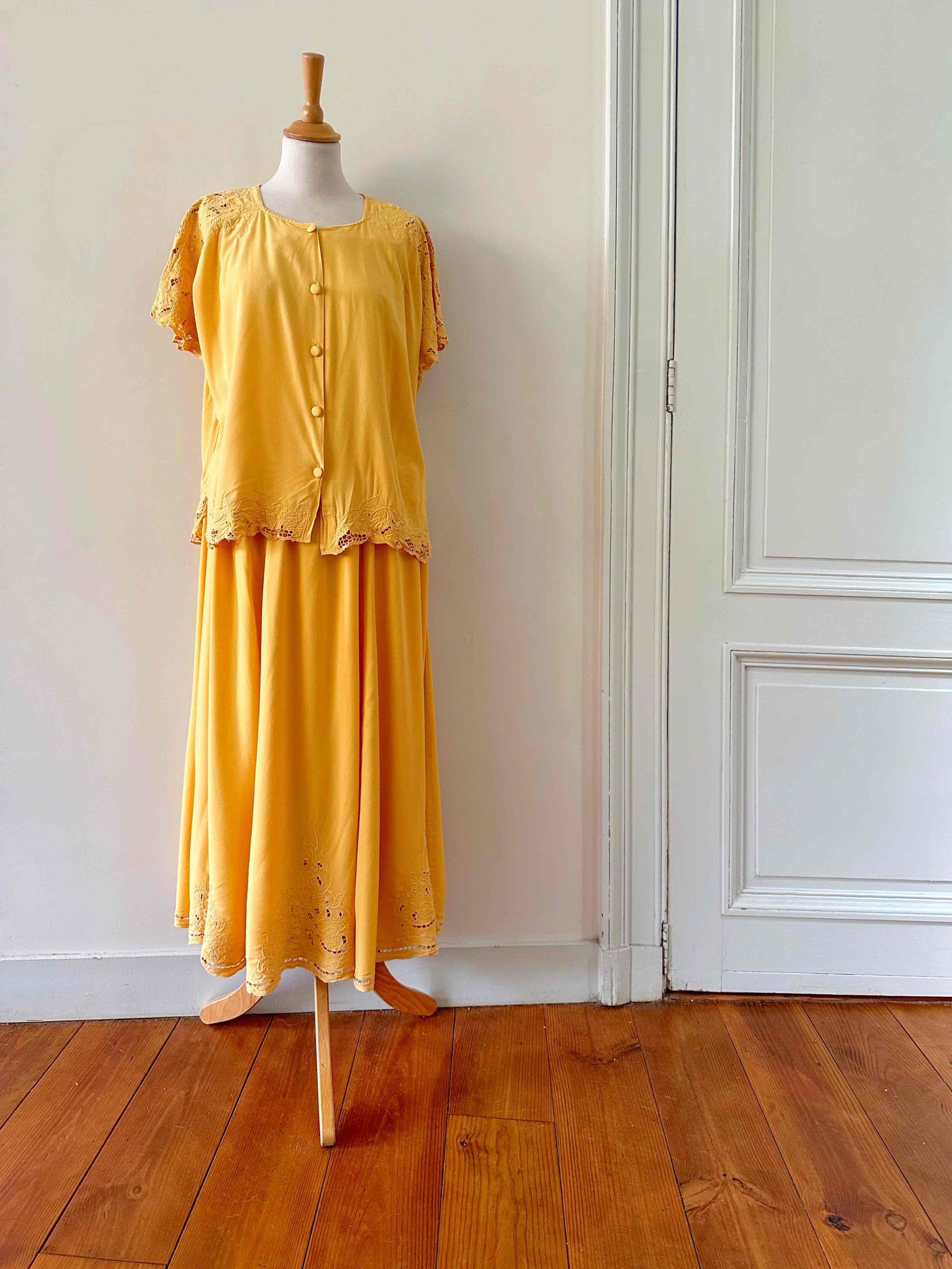 Jupe longue brodée, en viscose jaune mangue, bas ajouré de broderies anglaises florales, taille élastique au dos, années 80s, convient aux tailles 38, portée ici sur un mannequin T36, vendue avec sa blouse brodée coordonnée.
