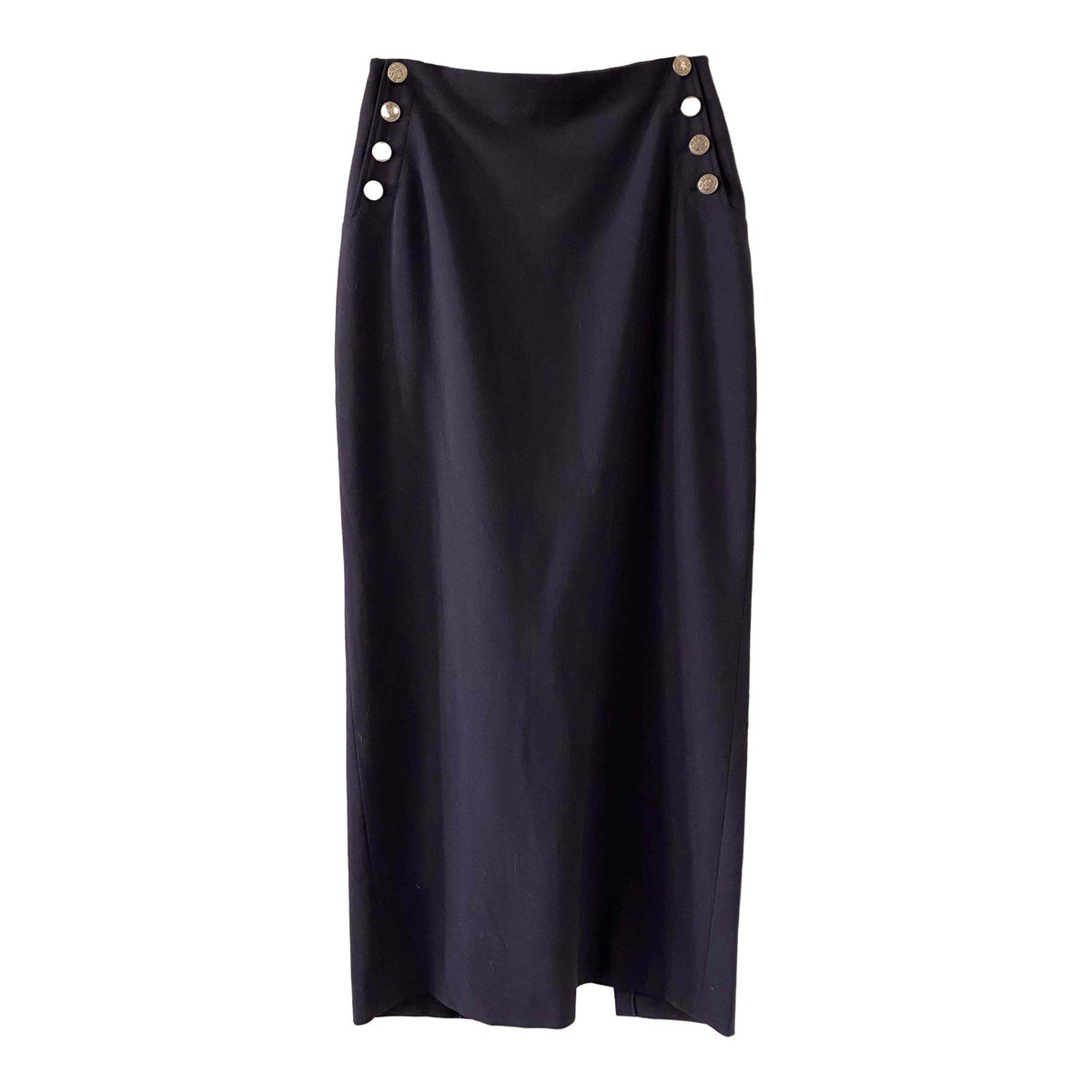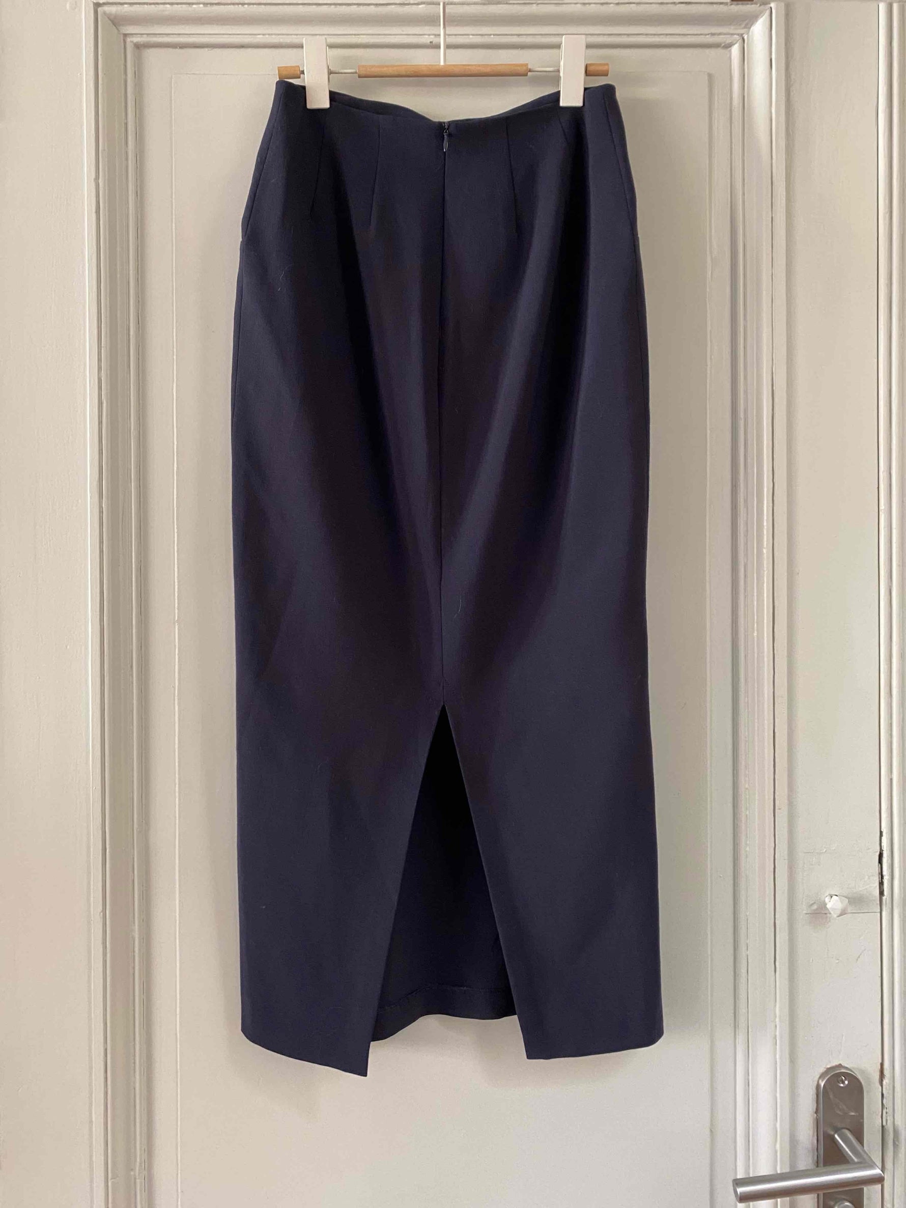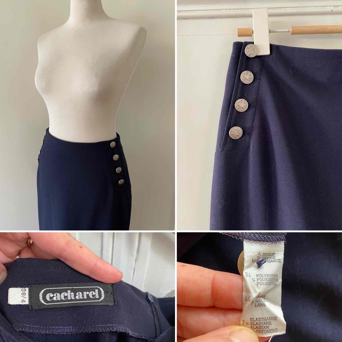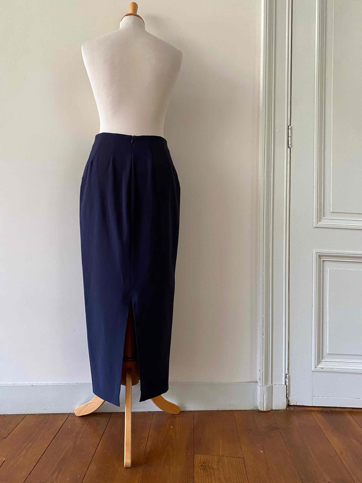 Prix unitaire parJupe longue Cacharel en laine mélangée bleue marine, effet pont avec boutons bijoux argentés, fente dos, fabriquée en France, taille 36 portée ici sur un mannequin T36.