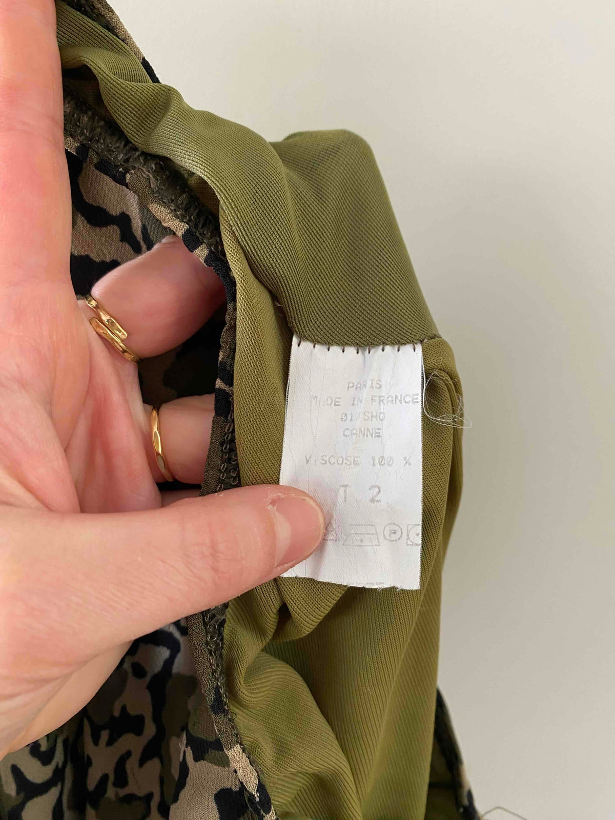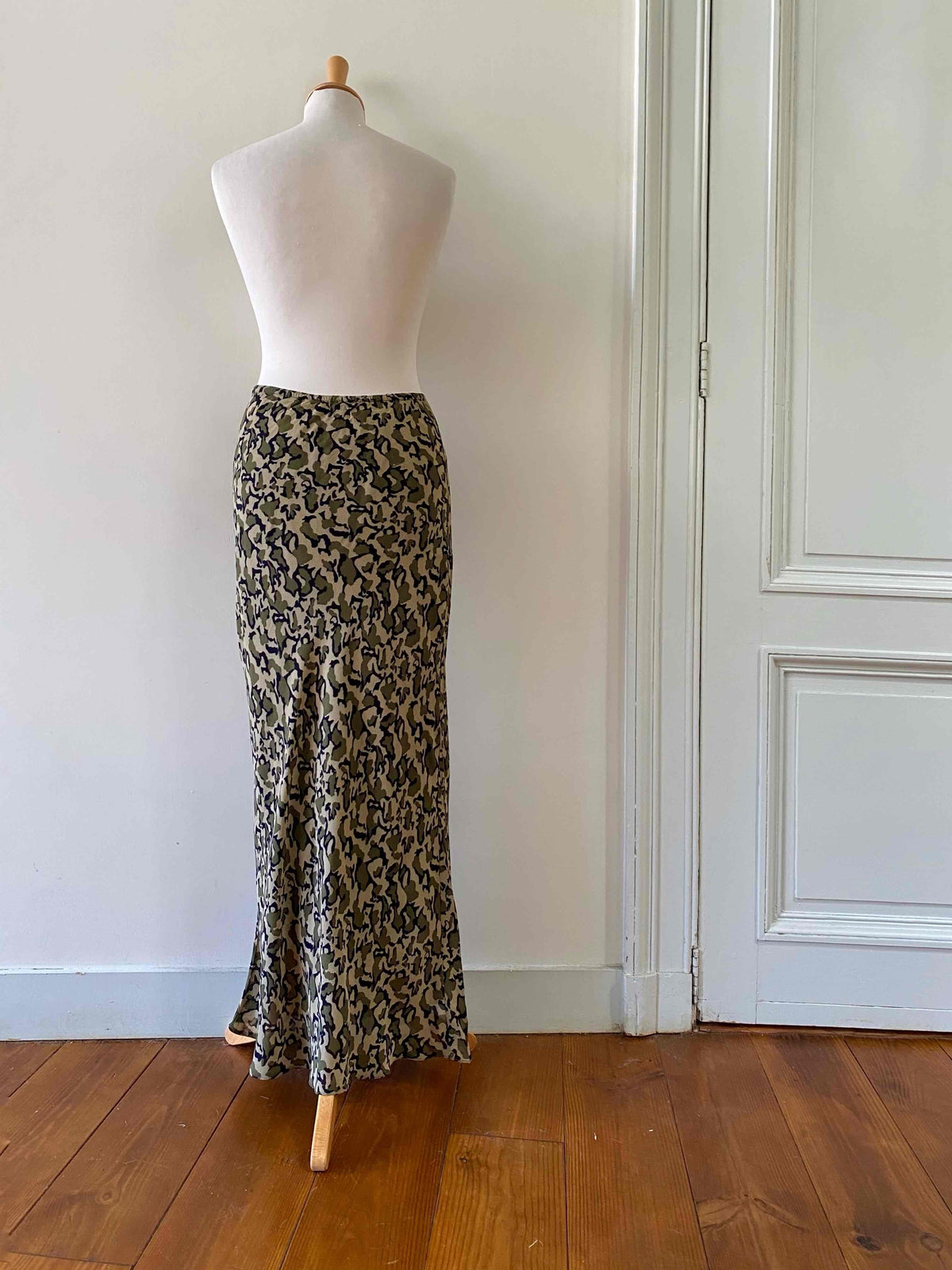 Prix unitaire parJupe longue camouflage en voile viscose doublée imprimée camouflage dans les tons de vert olive, beiges et noirs, taille élastique, forme fit and flare en biais, fabriquée en France, taille 36 et 38 portée ici sur un mannequin T36.