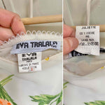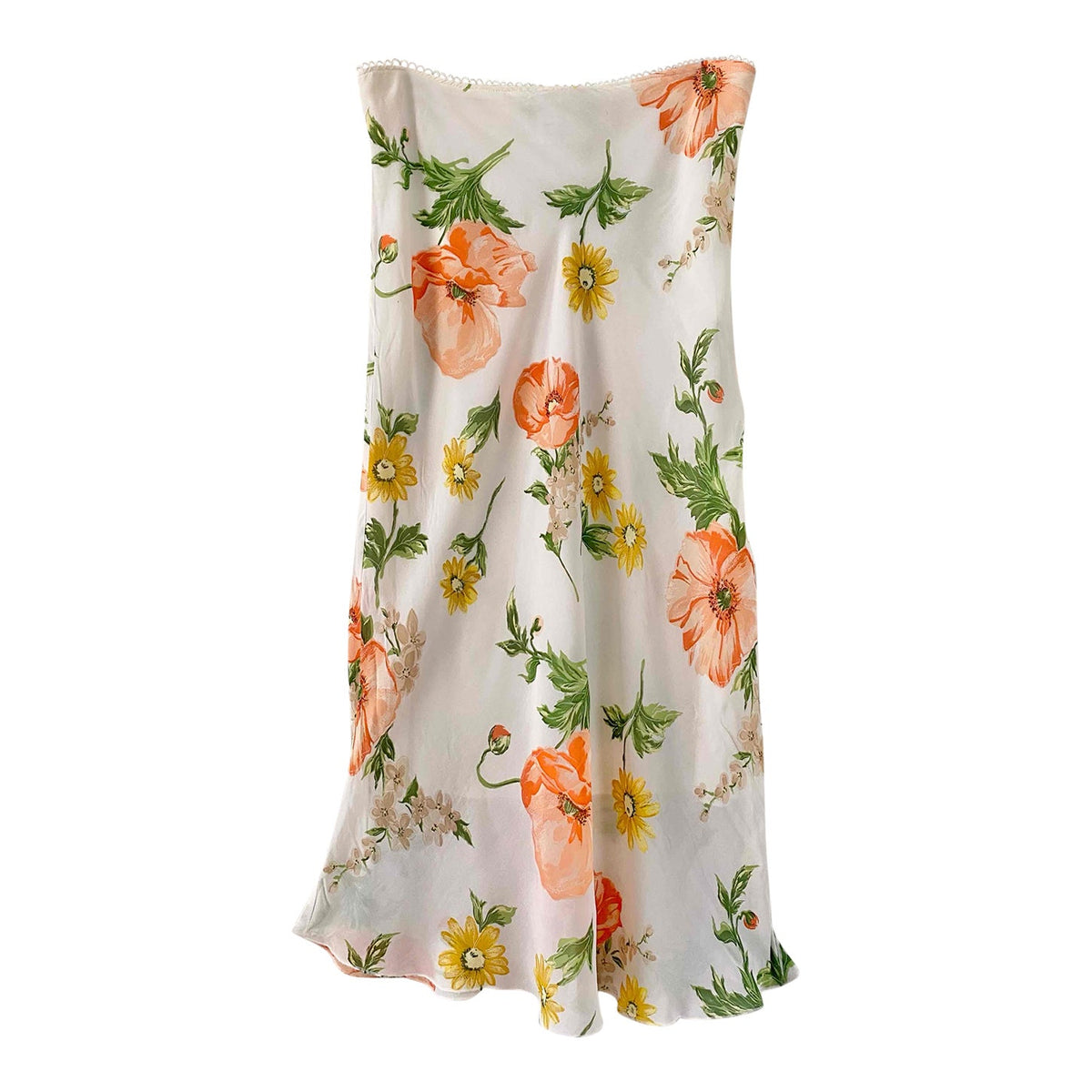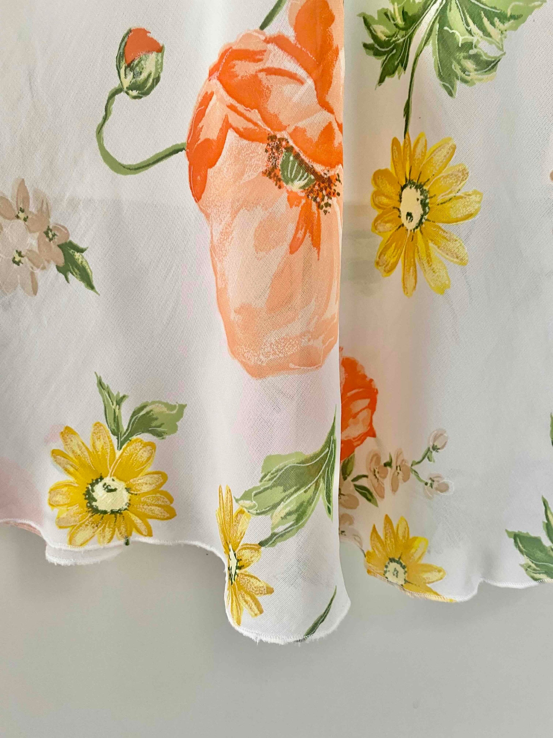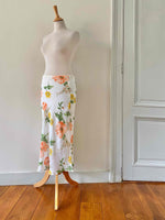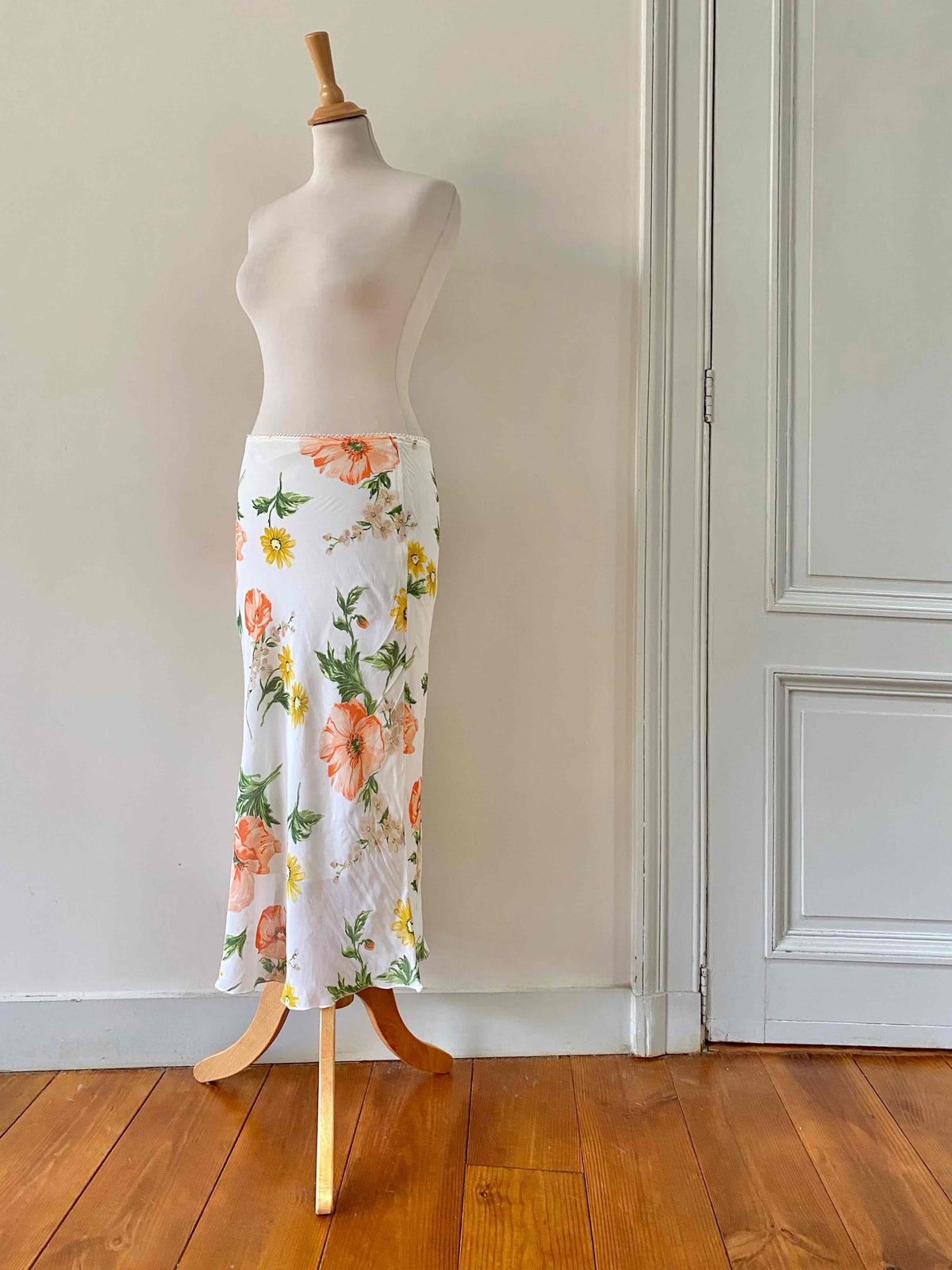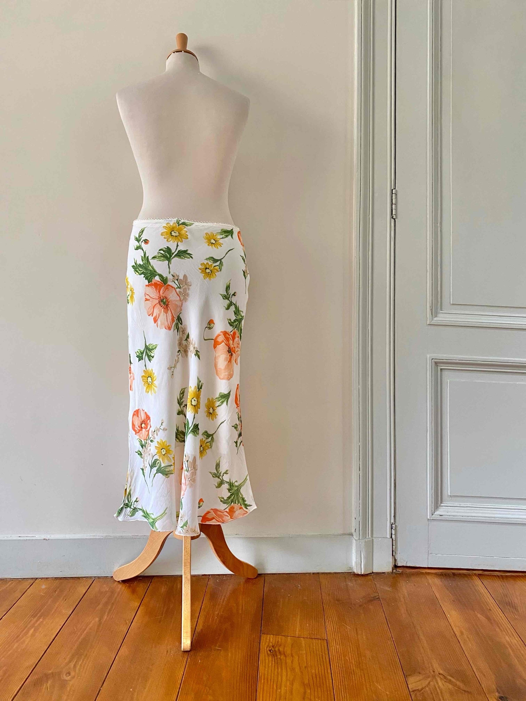 Jupe longue fleurie en voile viscose doublée blanche imprimée grandes fleurs prairie et coquelicots rose orangées, jaunes et vertes, forme fit and flare en biais, fabriquée en France, taille 36 portée ici sur un mannequin T36.