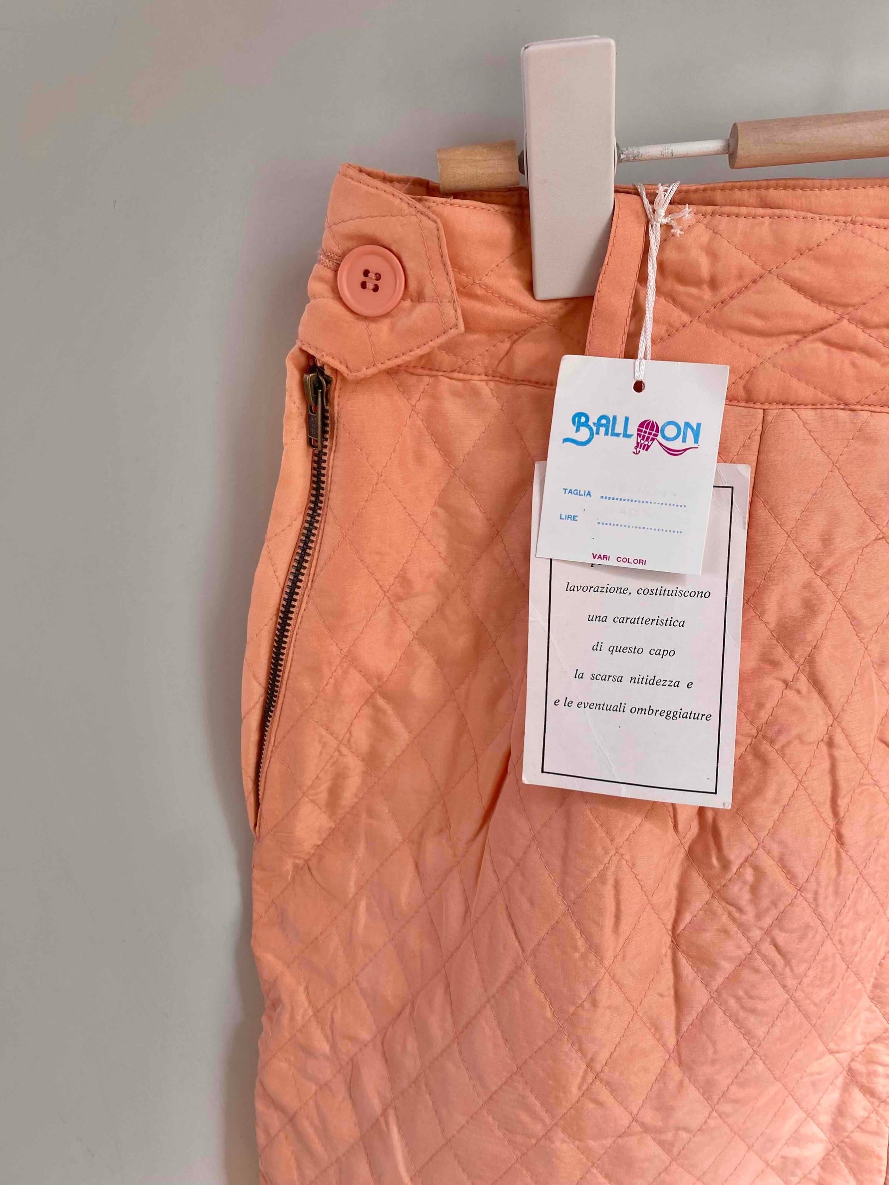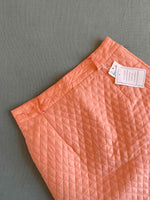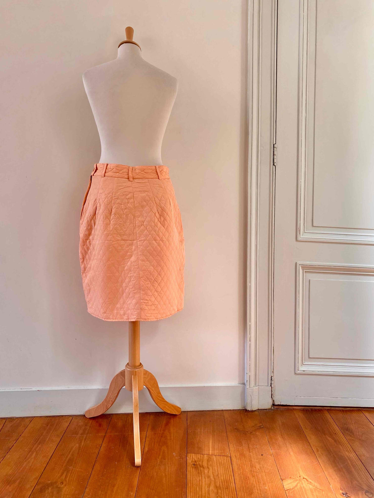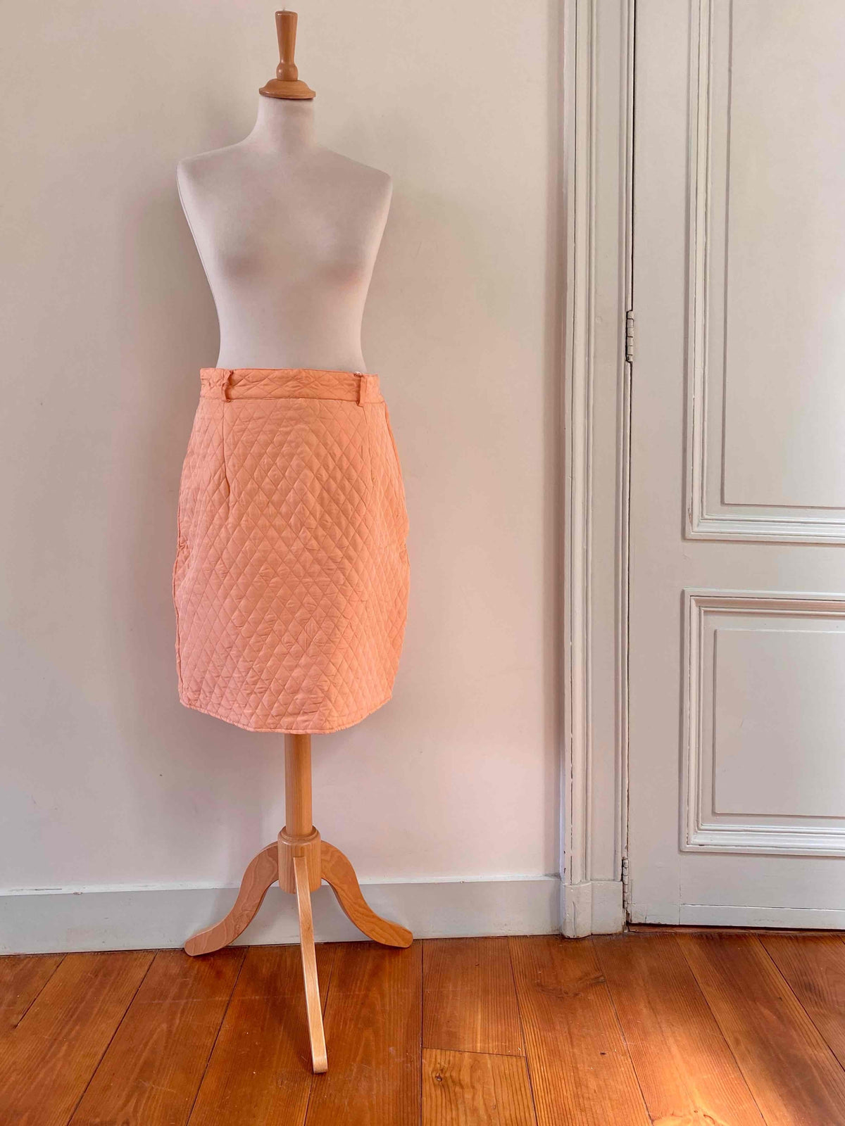 Jupe matelassée en soie, 100% soie rose pêche melon, matelassée croisillons fin, forme courte et taille haute, fabriquée en Italie, deadstock années 80’s, taille 38 actuelle portée ici sur un mannequin T36, hanches 48cm.