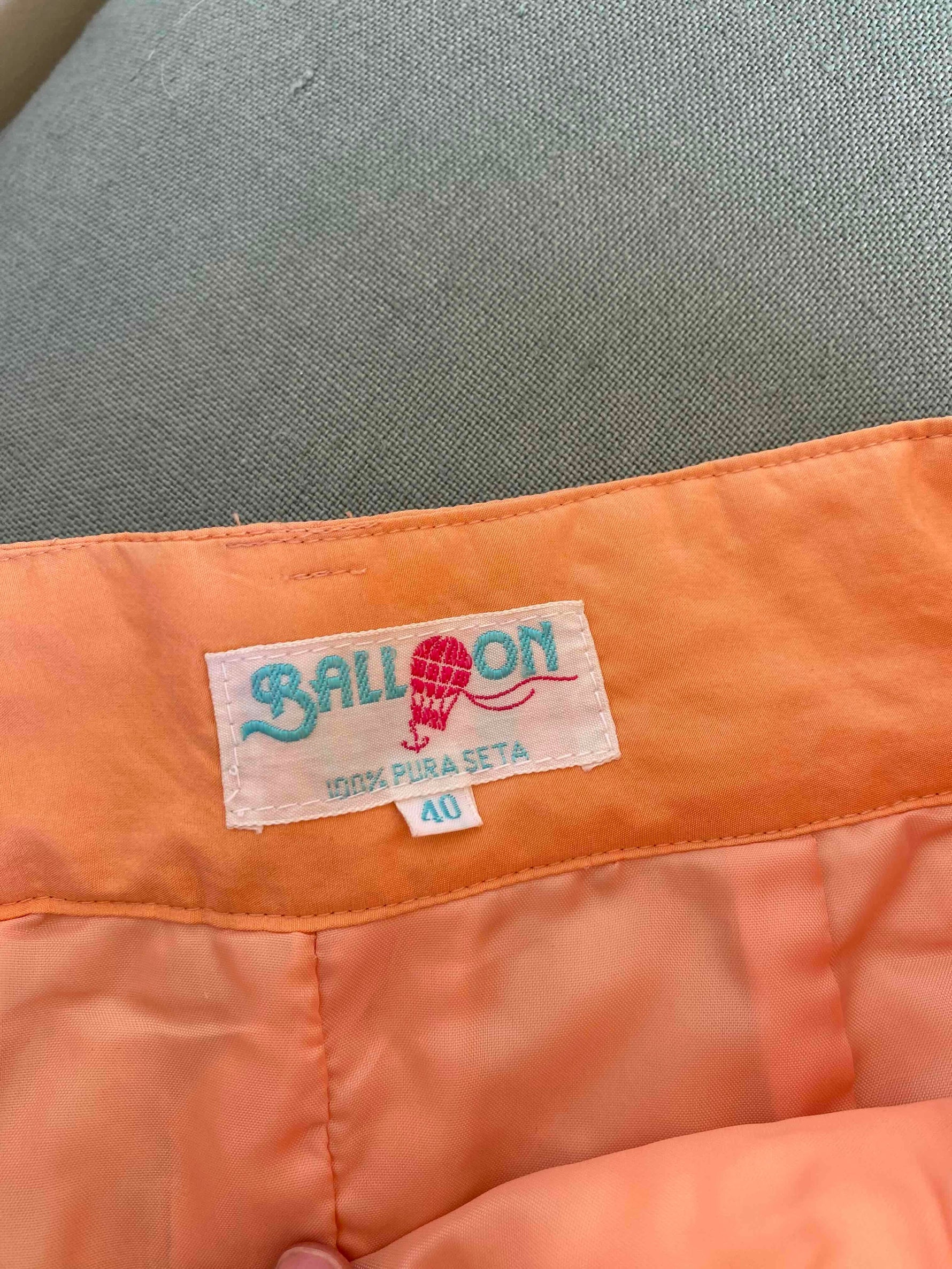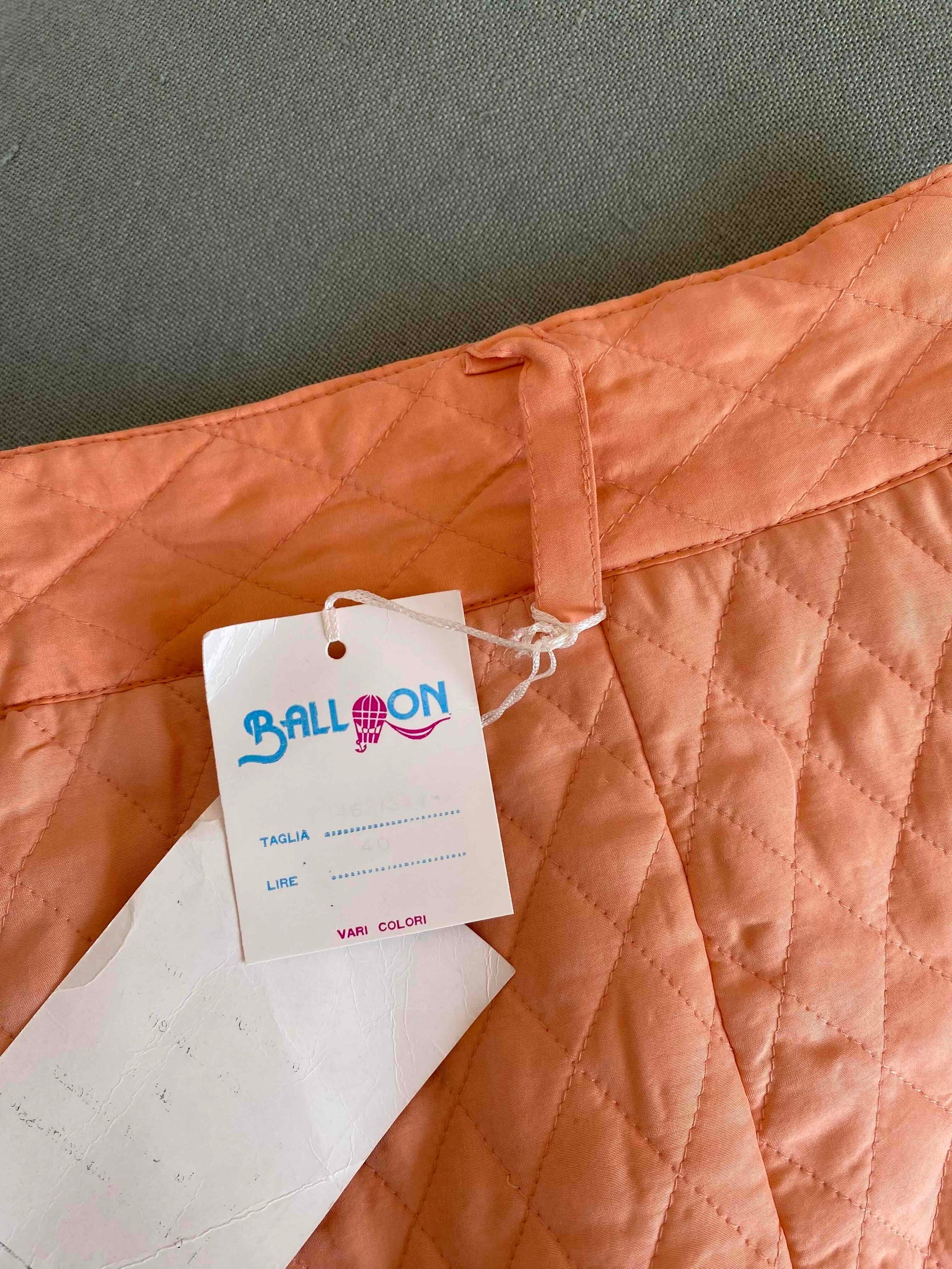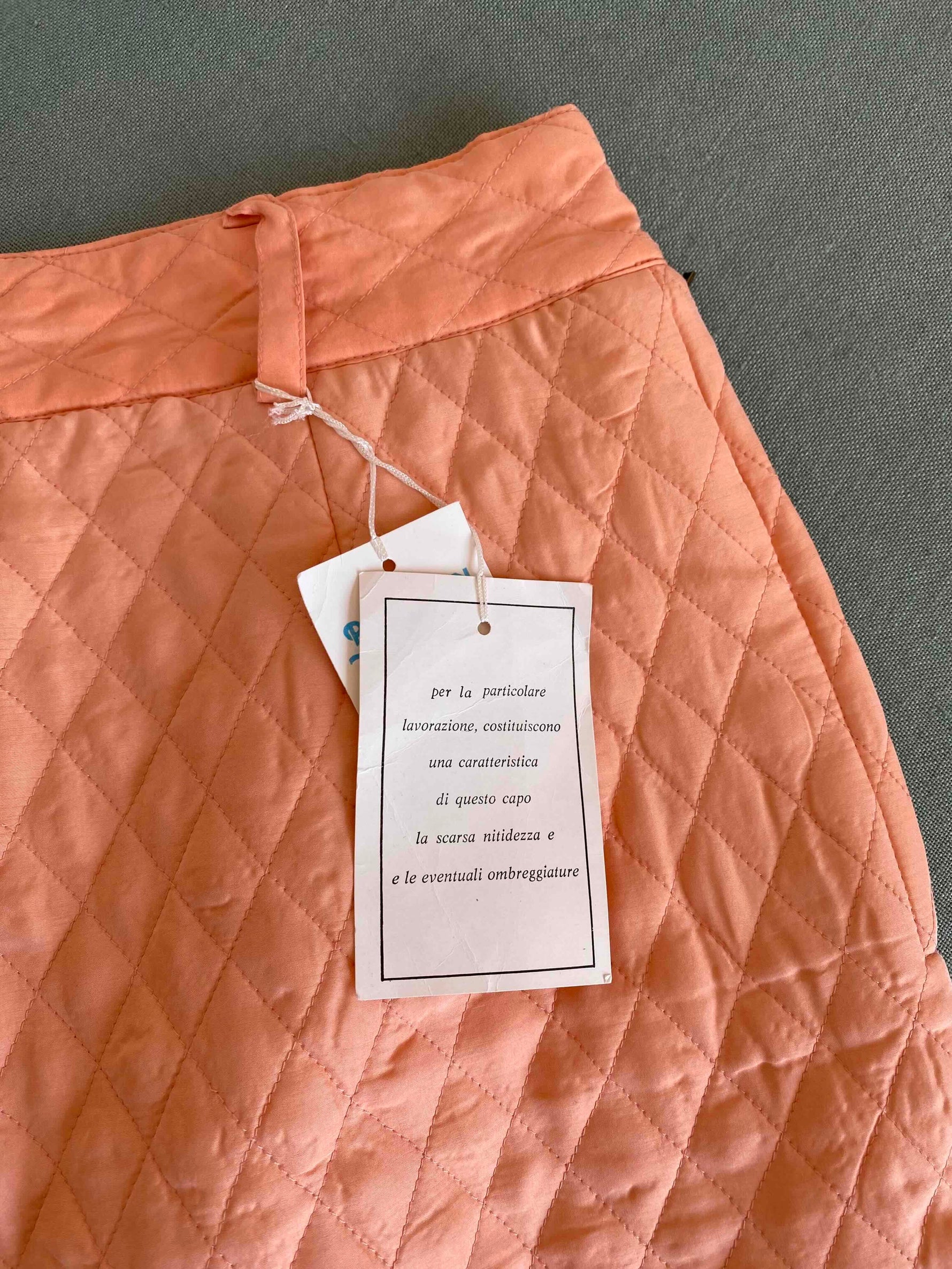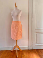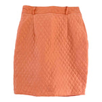 Jupe matelassée en soie, 100% soie rose pêche melon, matelassée croisillons fin, forme courte et taille haute, fabriquée en Italie, deadstock années 80’s, taille 38 actuelle portée ici sur un mannequin T36, hanches 48cm.